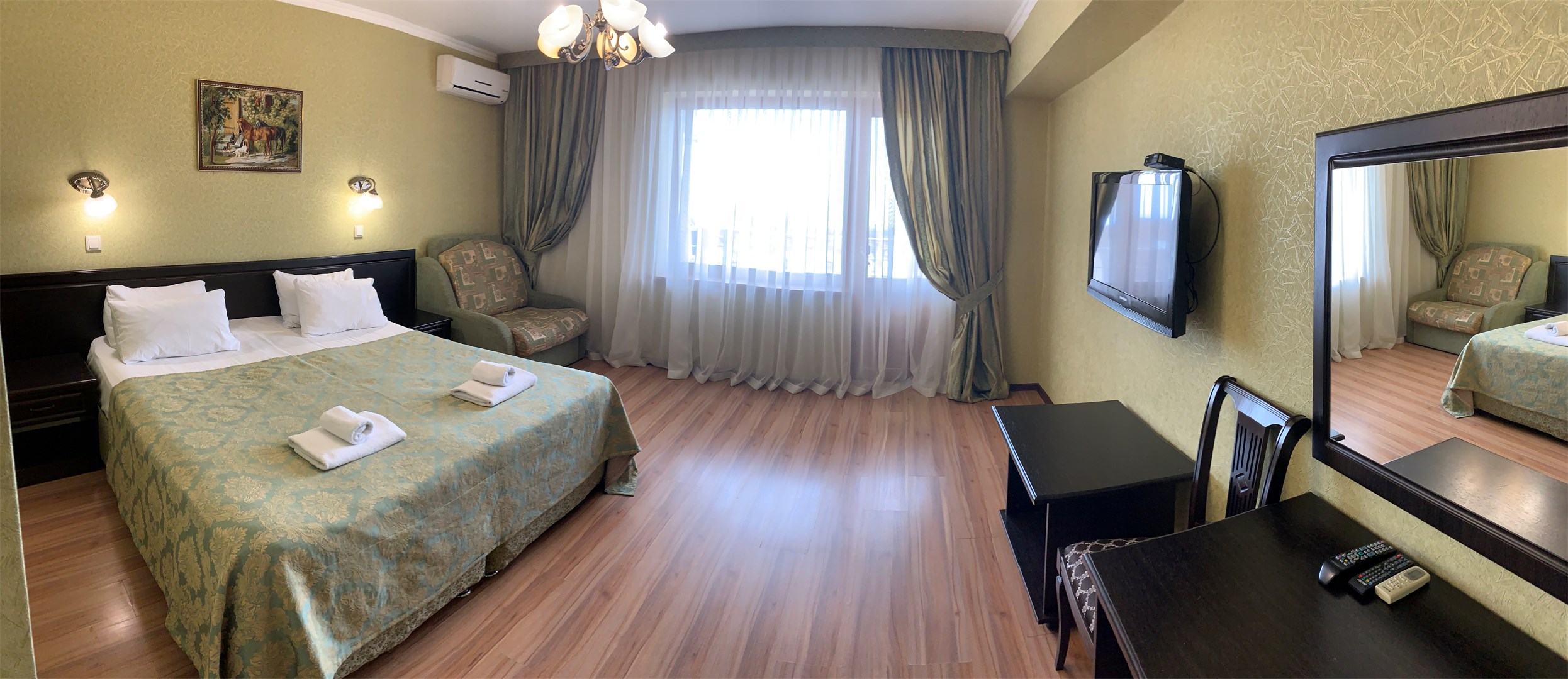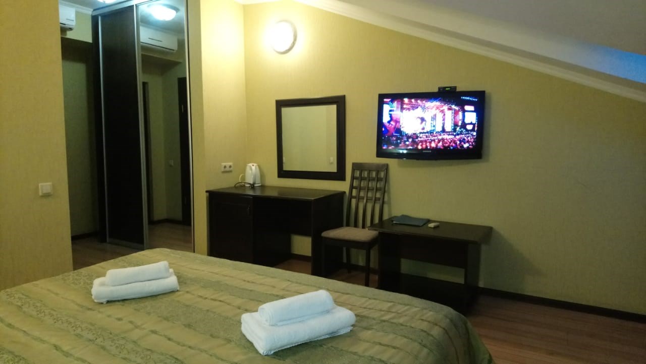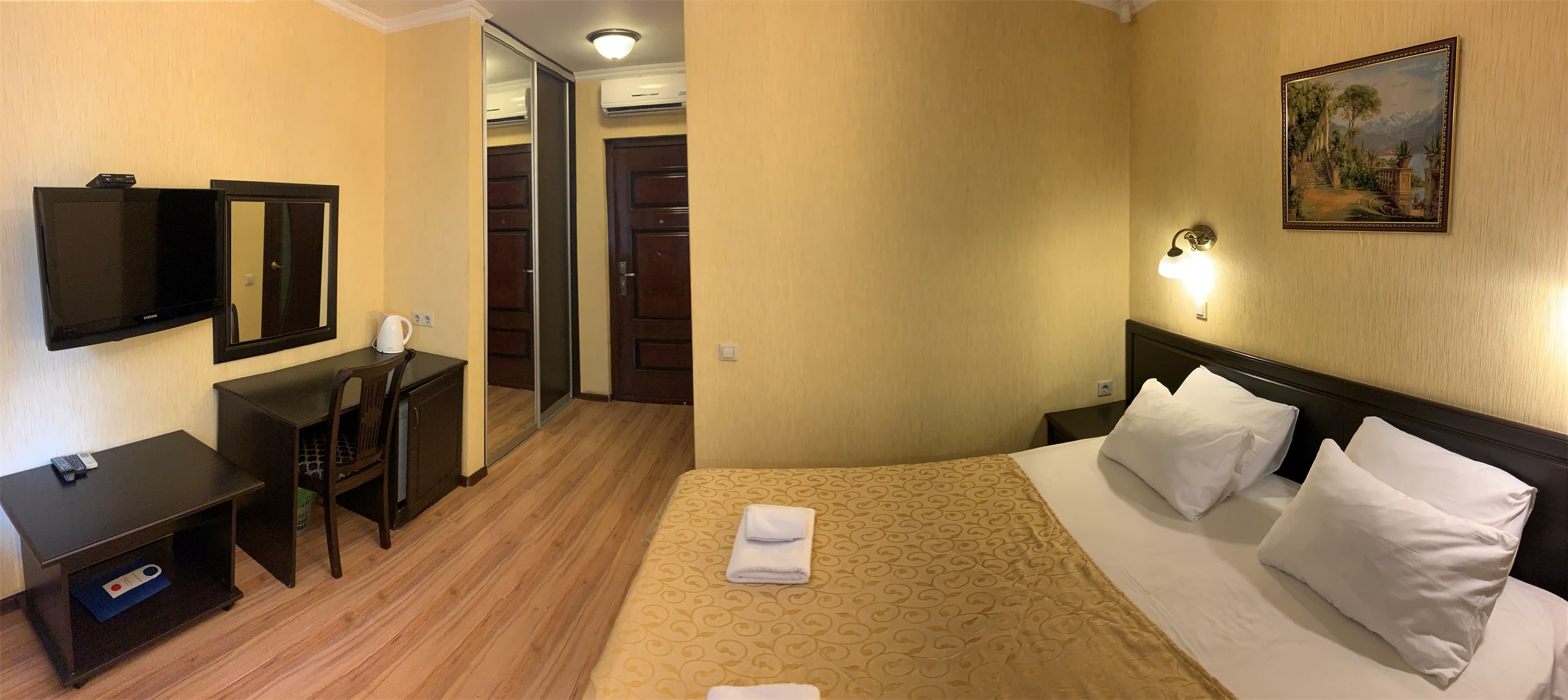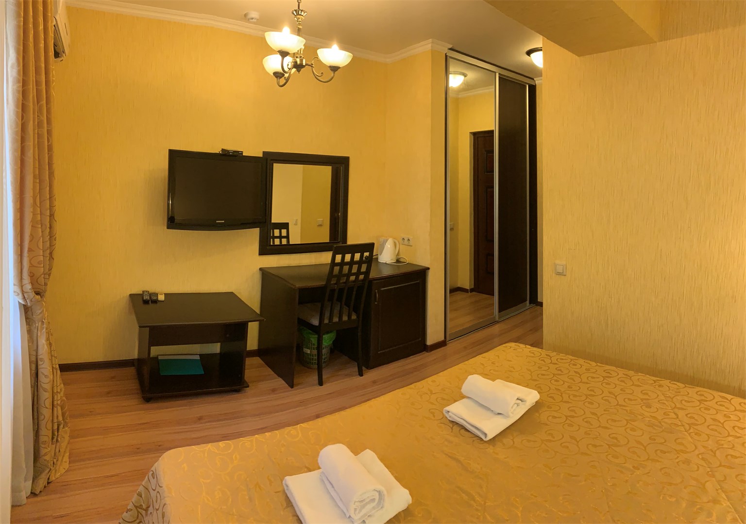 В номере: диван, зеркало, кровать двуспальная, прикроватные тумбочки, стол, стул, шкаф-купе, мини-холодильник, сейф, сплит-система, телевизор, чайный набор посуды, электрочайник