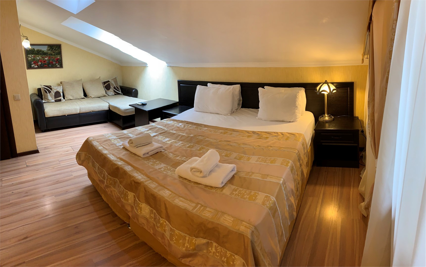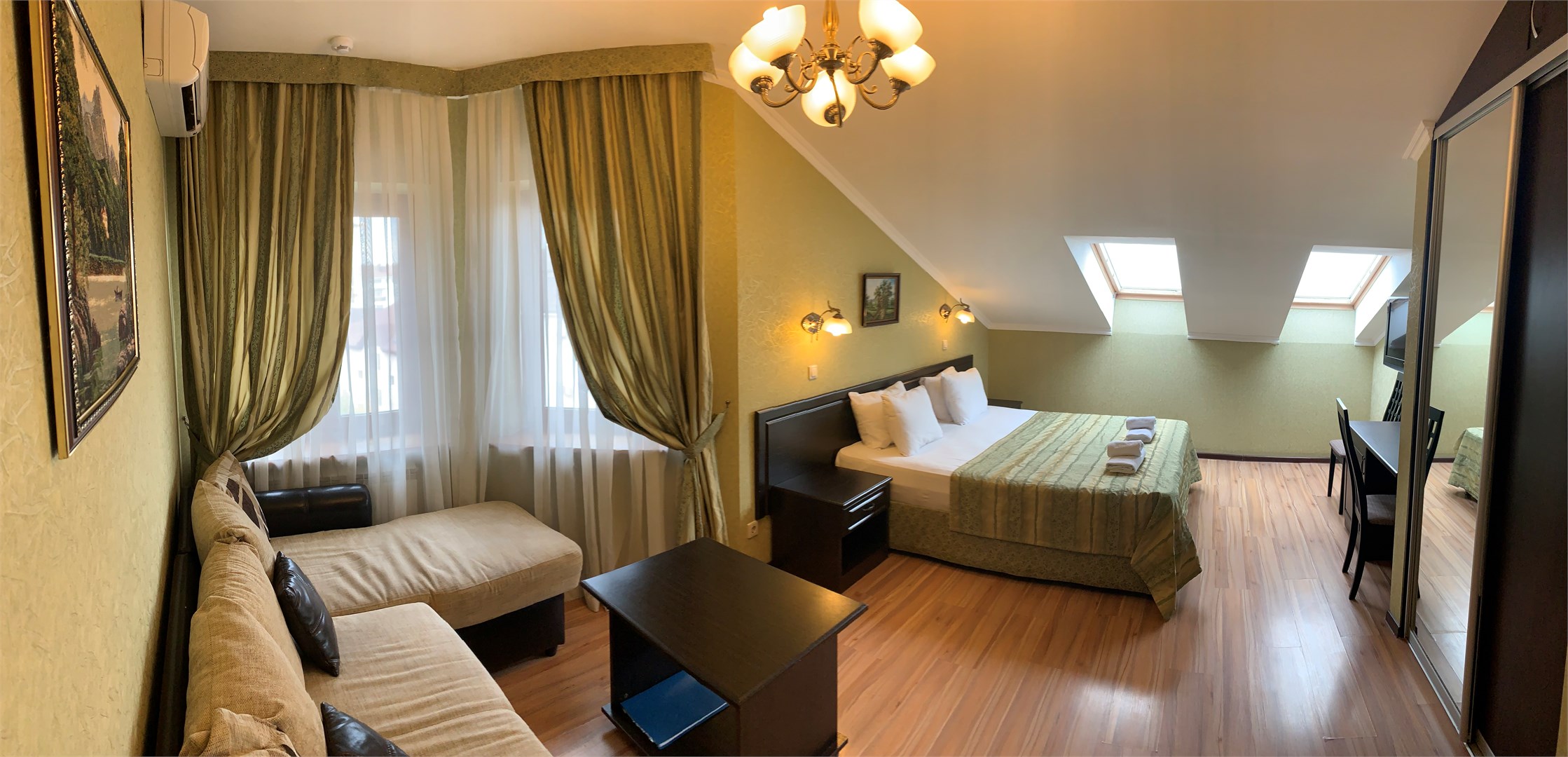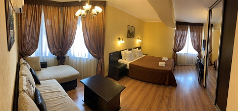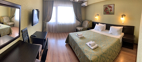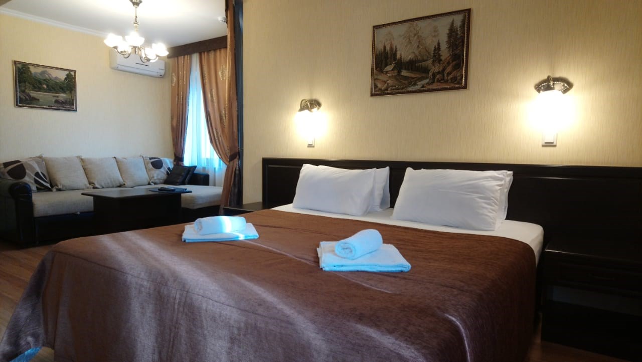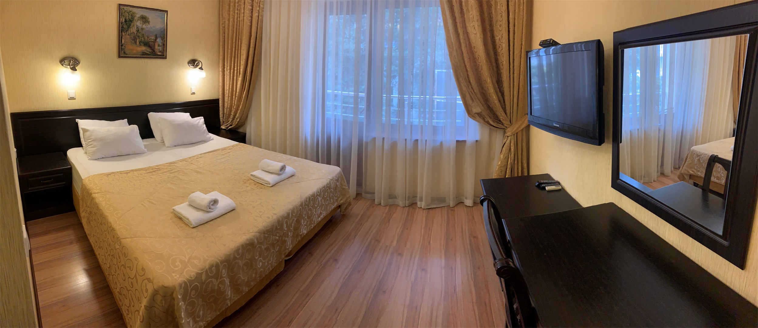 В номере: диван, зеркало, кровать двуспальная, прикроватные тумбочки, стол, стул, шкаф-купе, мини-холодильник, сейф, сплит-система, телевизор, чайный набор посуды, электрочайник