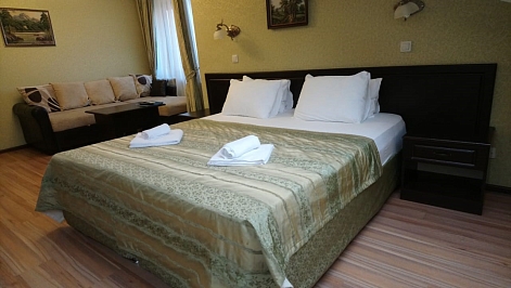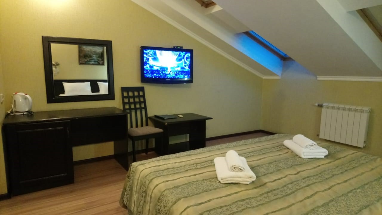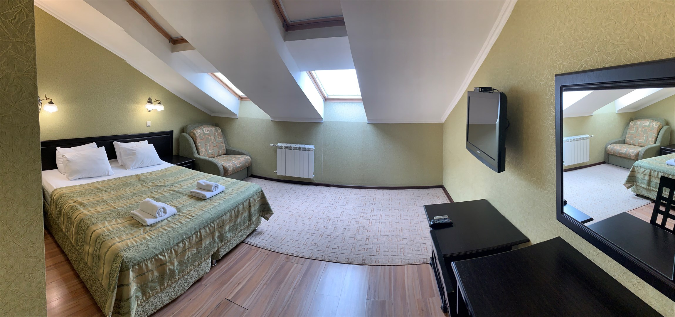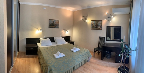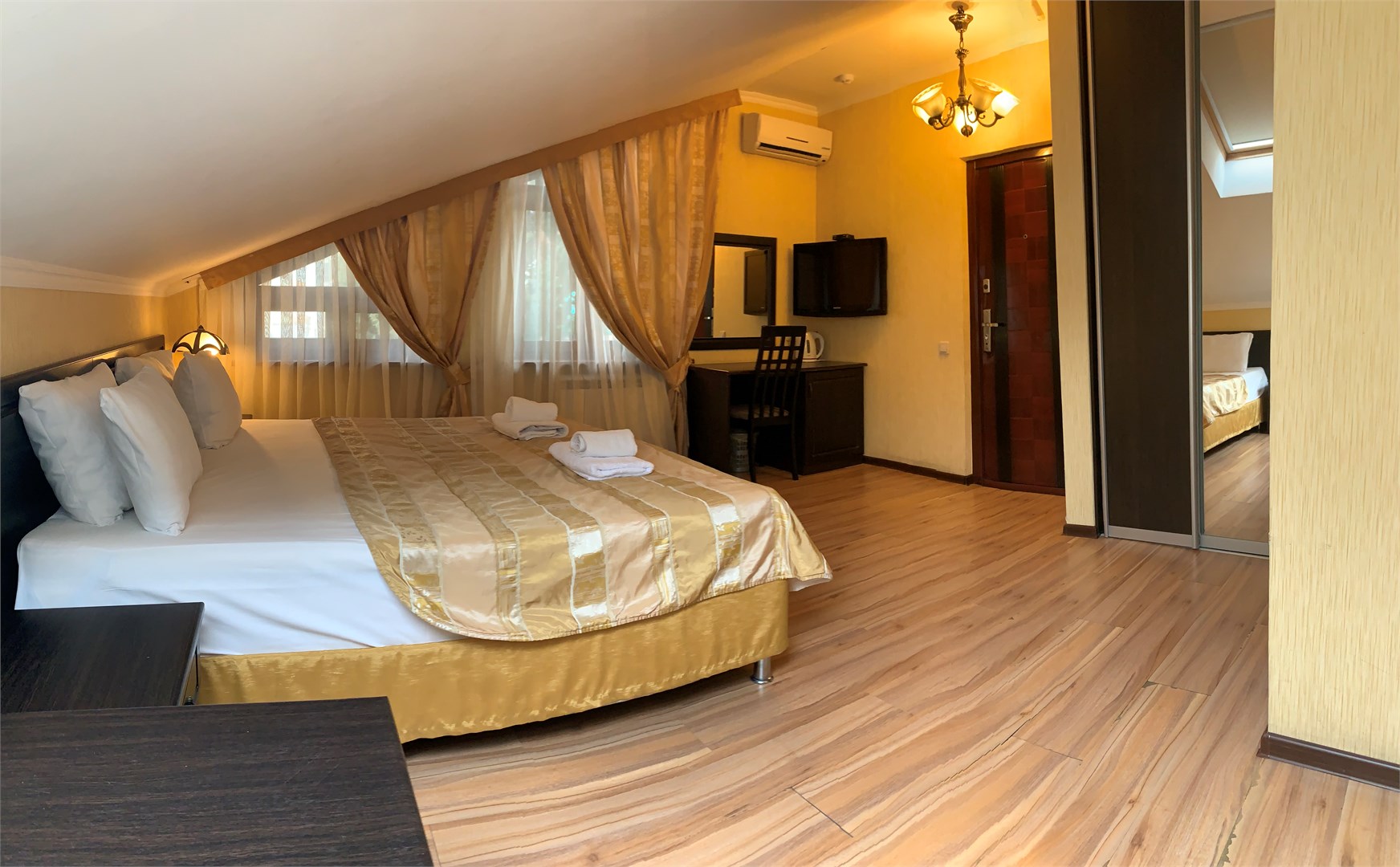 В номере: диван, зеркало, кресло, кровать двуспальная, прикроватные тумбочки, стол, стул, шкаф, мини-холодильник, сейф, сплит-система, телевизор, чайный набор посуды, электрочайник