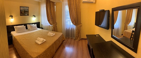 В номере: зеркало, кресло-кровать, кровати односпальные /одна двуспальная кровать, прикроватные тумбочки, стол, стулья, шкаф-купе, мини-холодильник, сейф, сплит-система, телевизор, чайный набор посуды, электрочайник