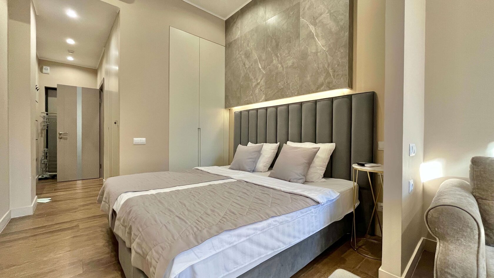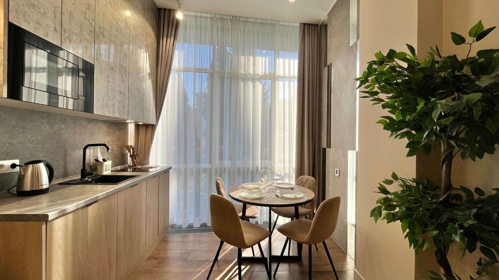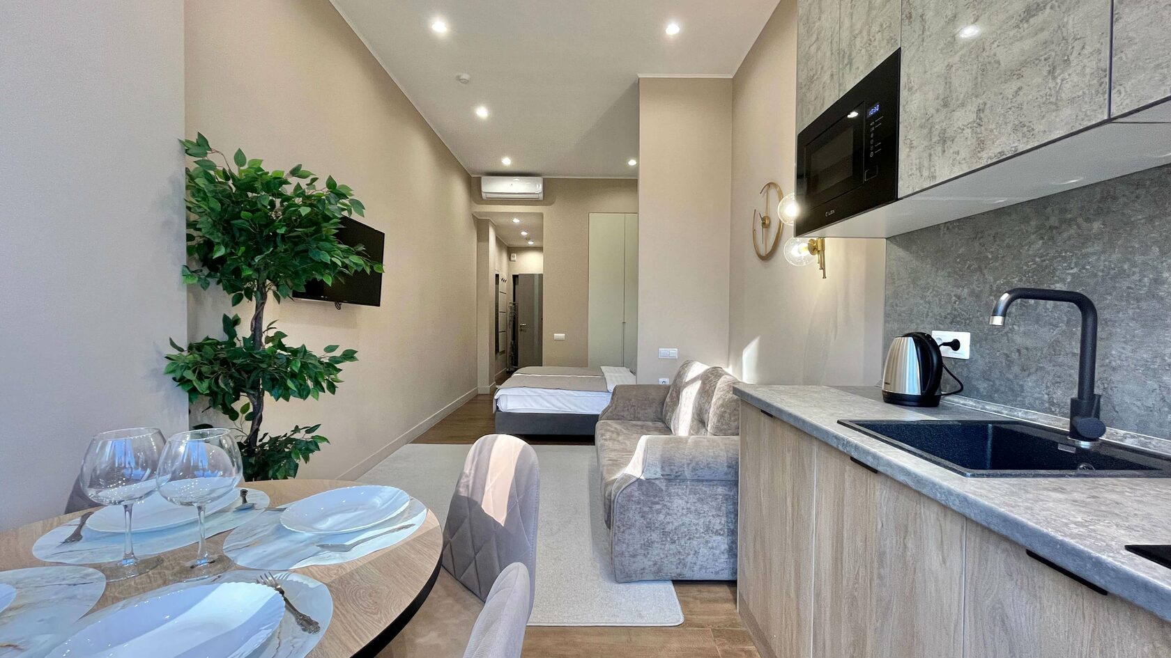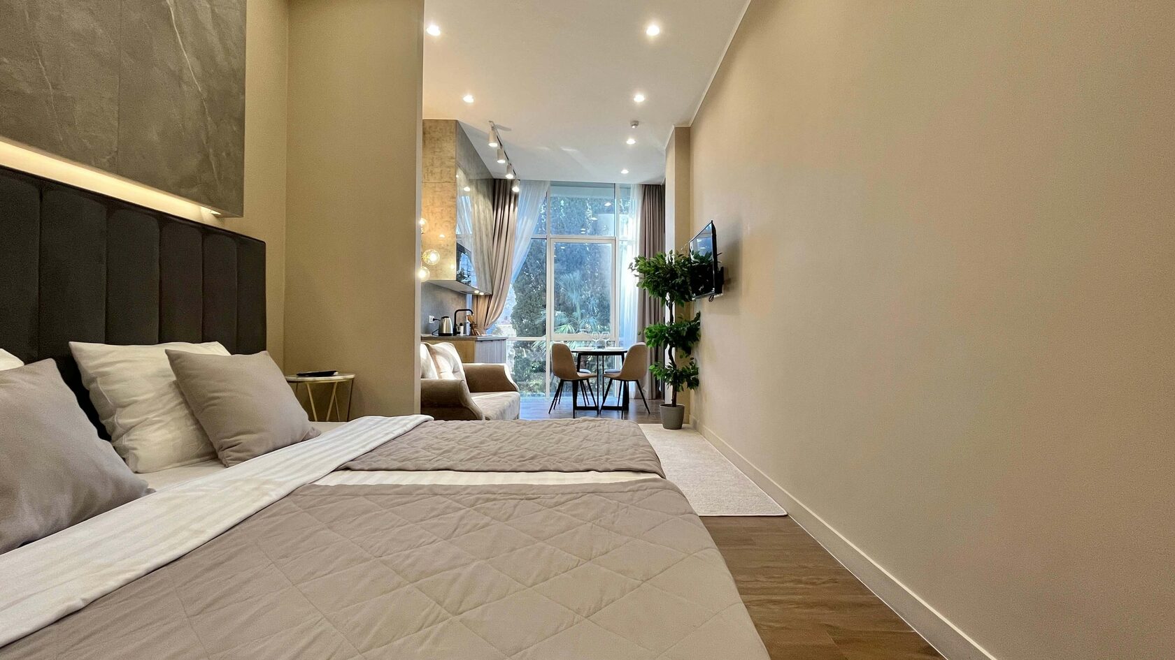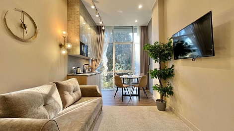 Они светлые и просторные, с ванной комнатой и мини-кухней. В номере есть все необходимое: кондиционер, стиральная машина, фен и плазменный телевизор. На кухне предусмотрен электрочайник, микроволновая печь, холодильник. Из панорамных окон открывается великолепный вид на аллею. К услугам гостей Wi-Fi. На свежем воздухе обустроена детская игровая площадка. Рядом находится оборудованный галечный пляж с раздевалками, шезлонгами и зонтиками.