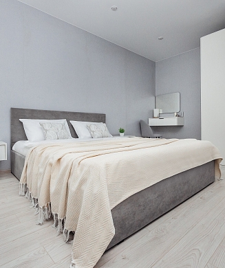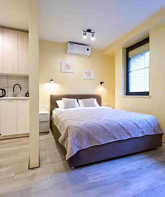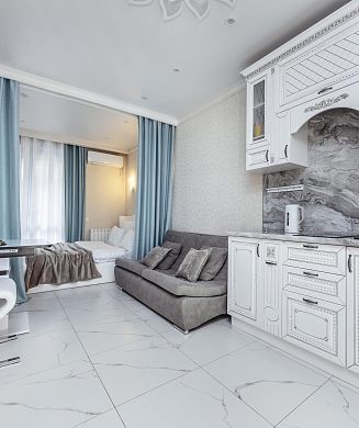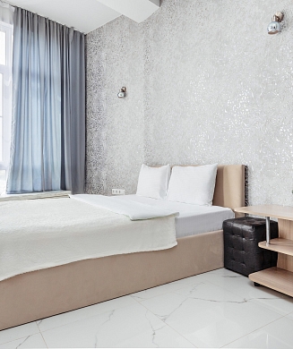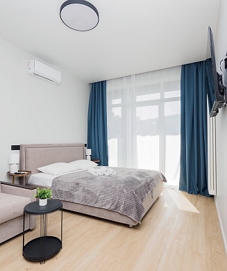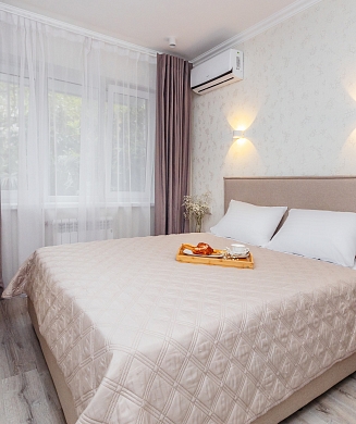 В номере: вешалка, диван раскладной, зеркало, кровать двуспальная, стол, стулья, шкаф, кондиционер, телевизор, холодильник, электрочайник