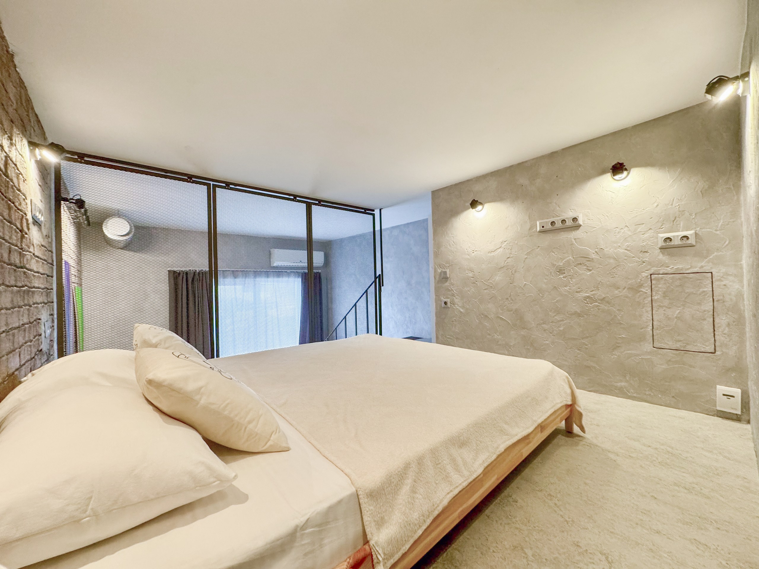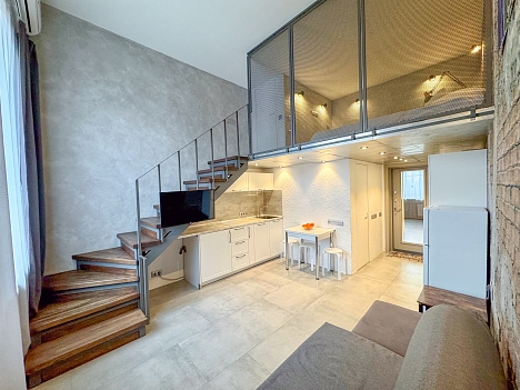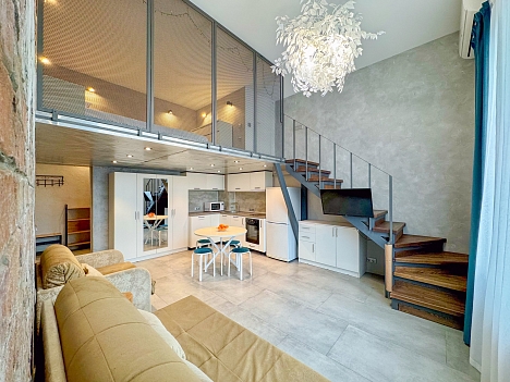 Апартаменты находятся в пятиэтажном современном корпусе, расположенном на территории апарт-отеля на первой береговой линии курортной зоны поселка. В распоряжении гостей двухуровневые номера, оформленные в популярном сегодня стиле лофт. Апартаменты оснащены всем необходимым: есть собственная мини-кухня с электроплитой, два санузла, сплит-система. Среди прочих удобств – теплый пол, стиральная машина, сеть wi-fi. На втором ярусе разместилась уютная спальная зона с большой кроватью. На закрытой охраняемой территории комплекса работают кафе, аптека, фитнес зал. К услугам отдыхающих – два бассейна, детская и спортивная площадки, а автовладельцы смогут припарковать свою машину на охраняемой стоянке. В 500 метрах – живописный галечный пляж. На побережье много водных развлечений, есть раздевалки, лежаки, зонтики.