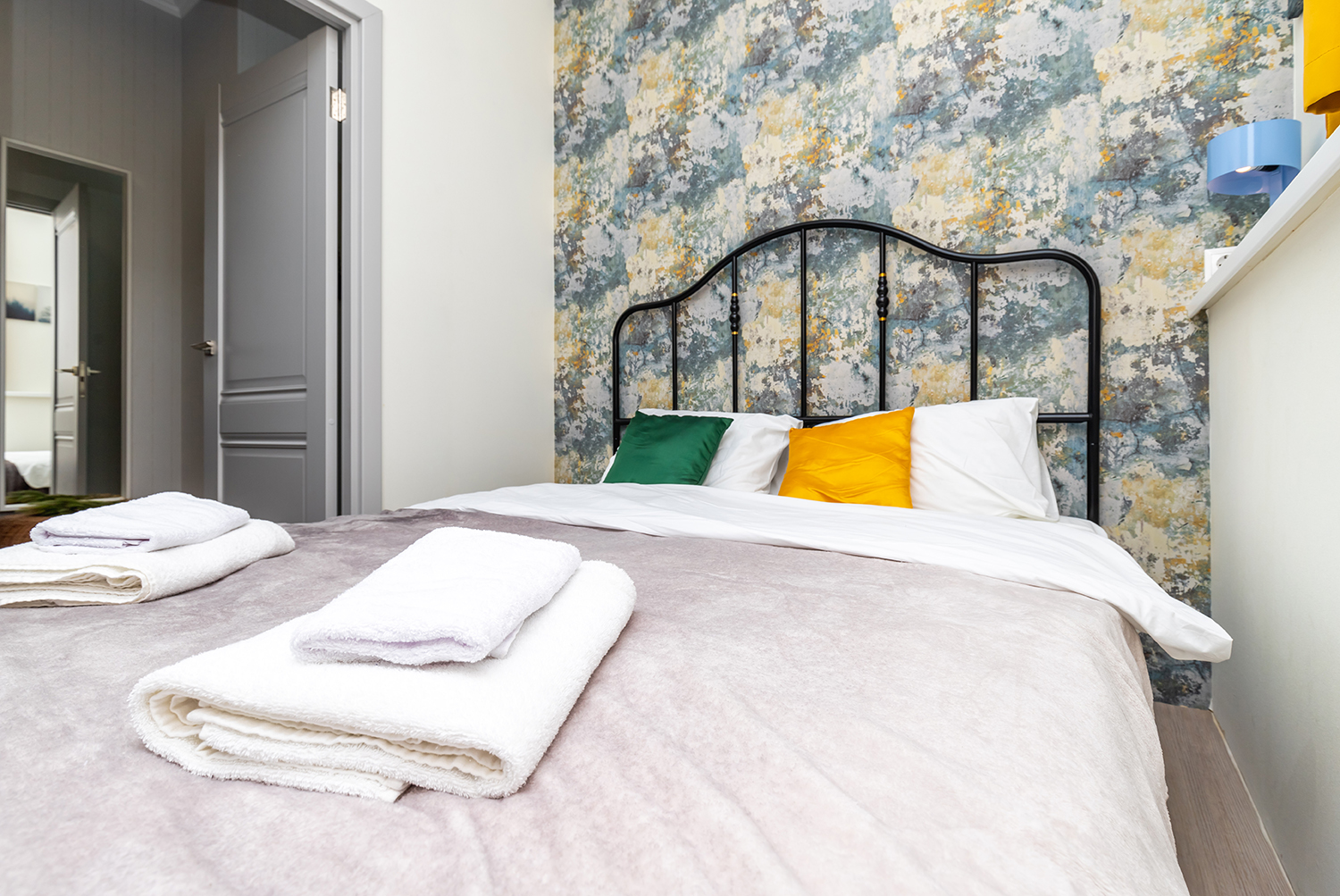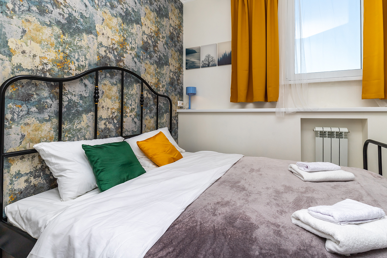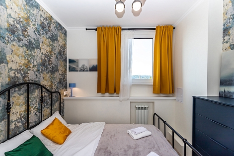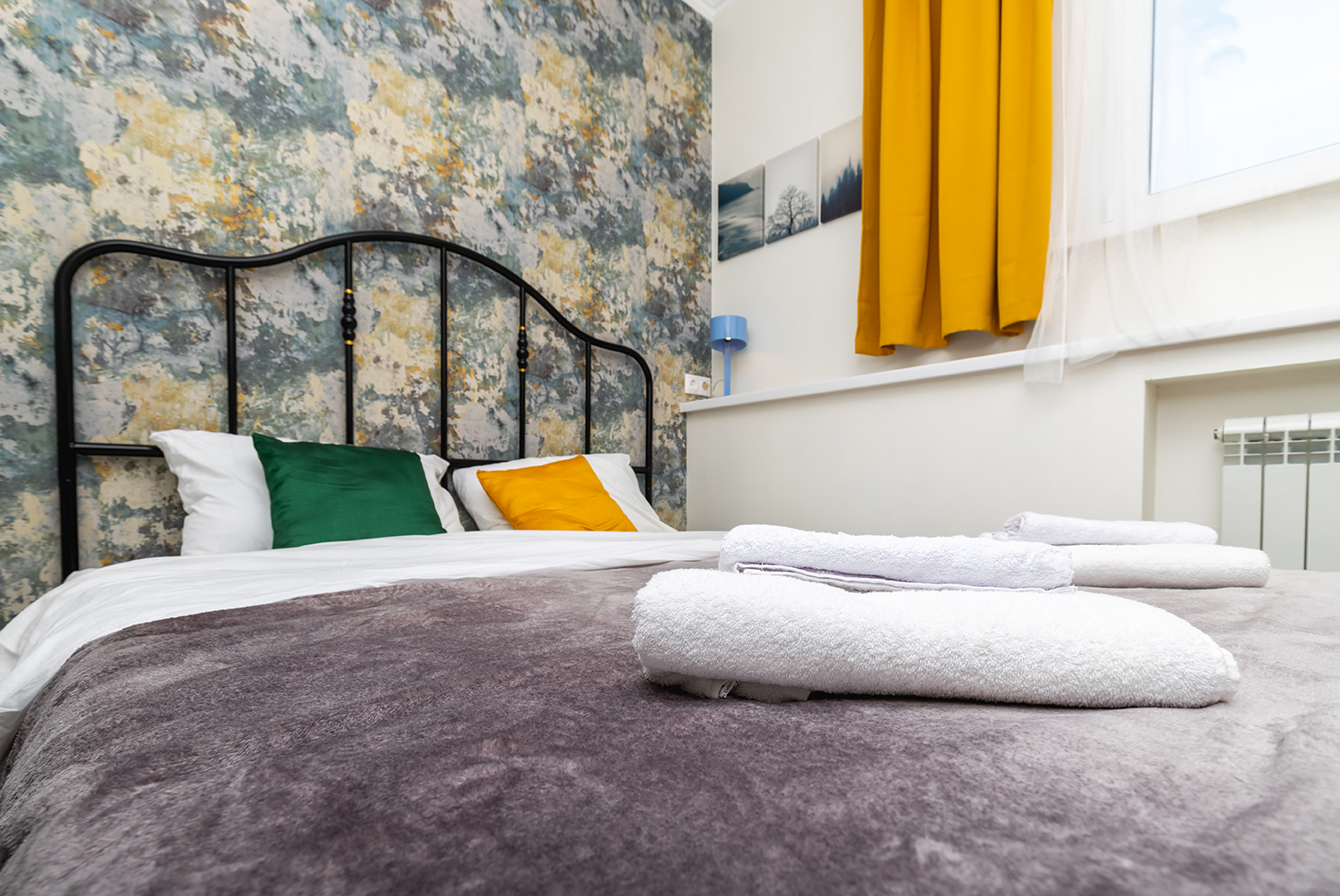 В номере: вешалка, диван, зеркало, кровать двуспальная, стол, стулья, шкаф, гладильная доска, мини-холодильник, набор посуды, сплит-система, стиральная машина, телевизор ЖК, утюг, электрочайник