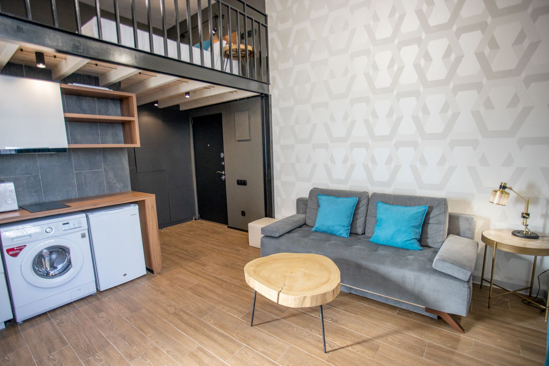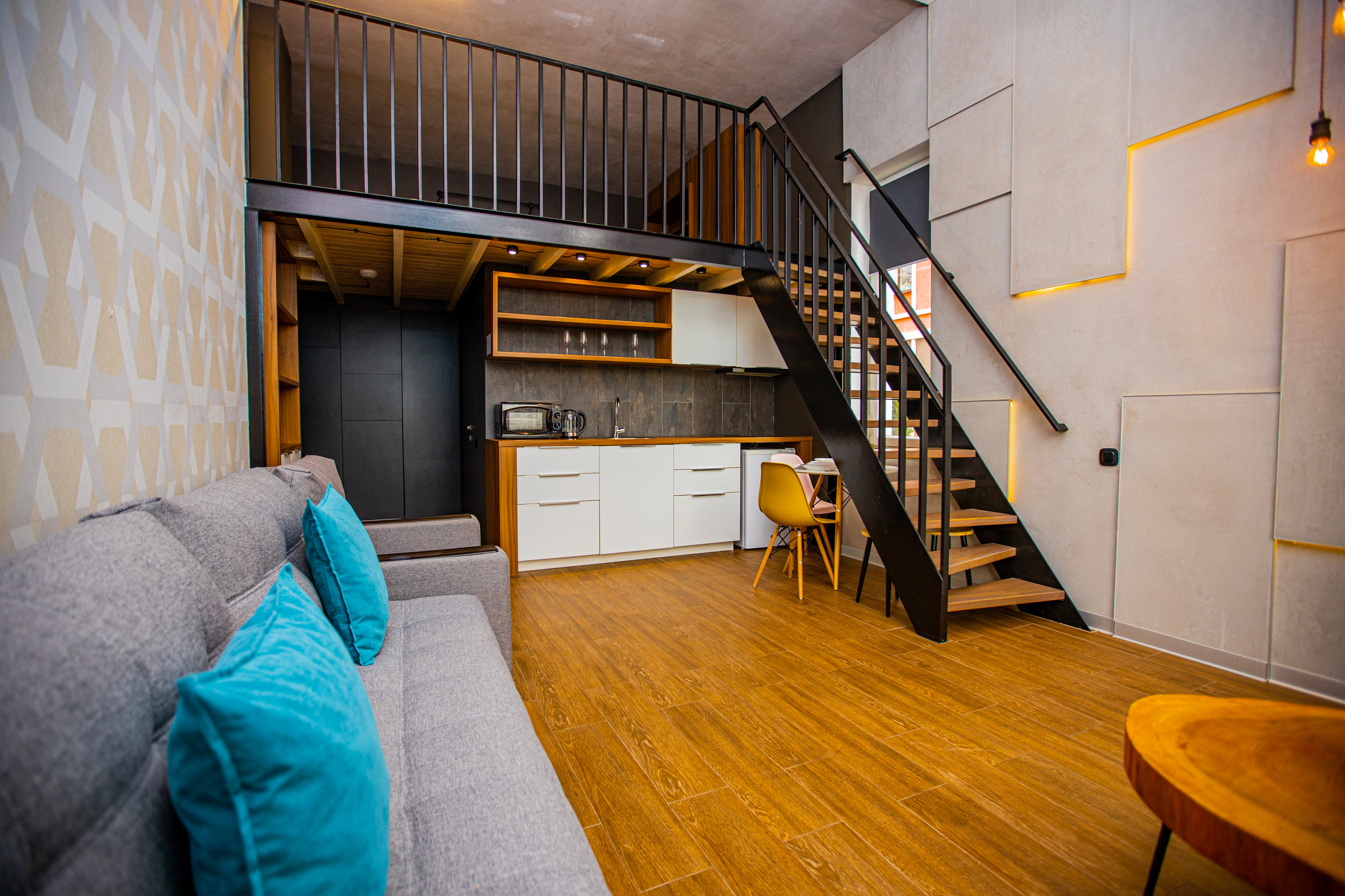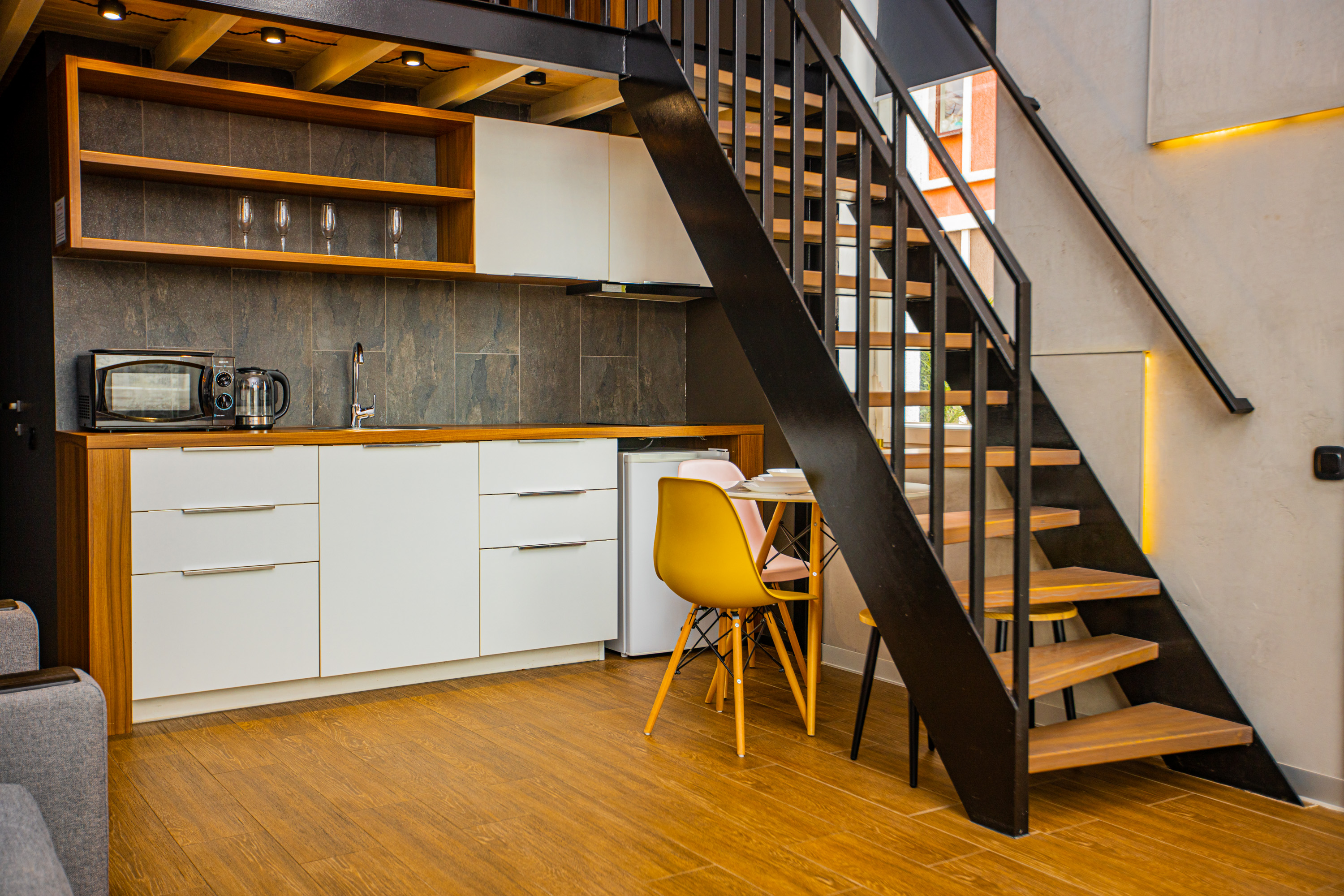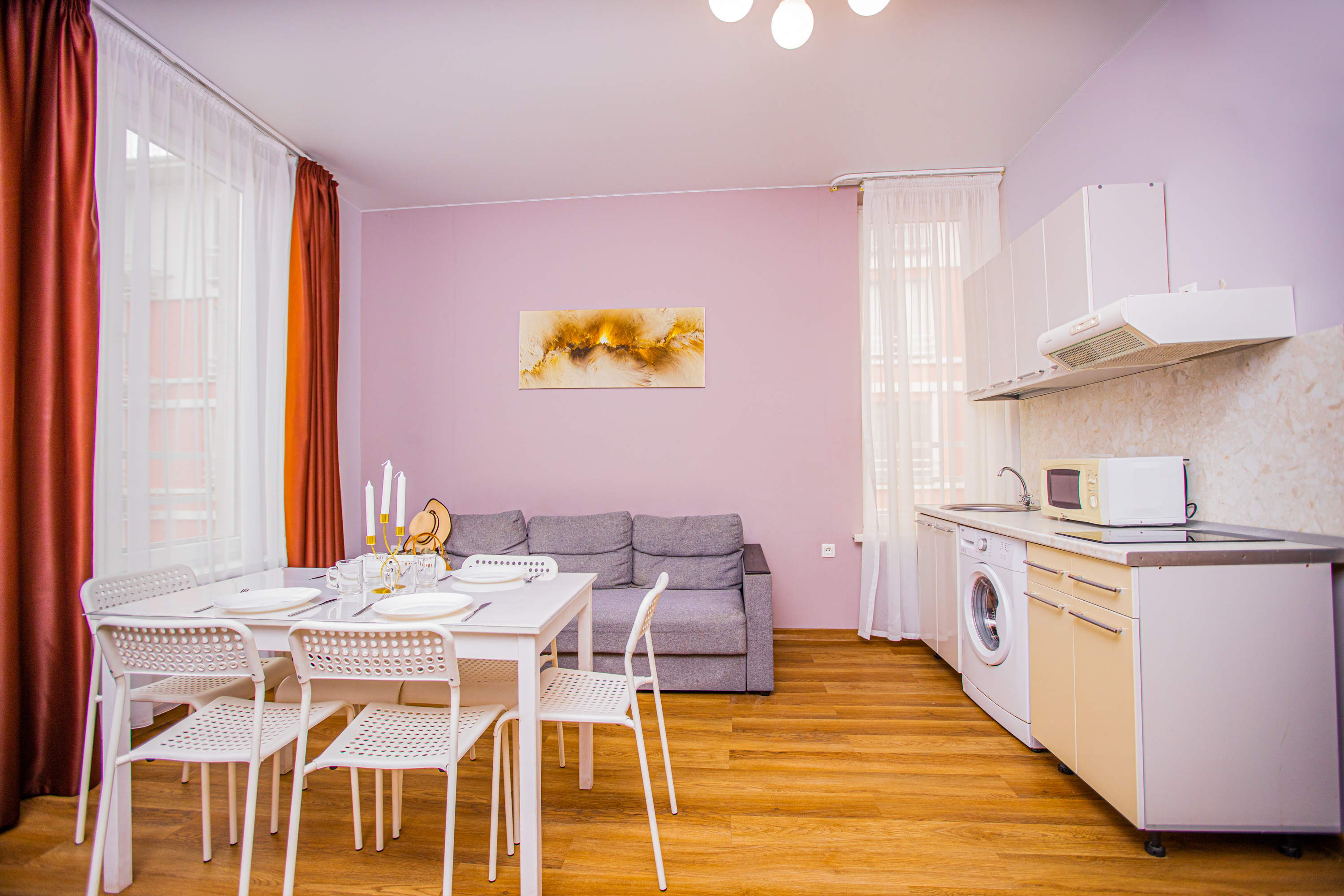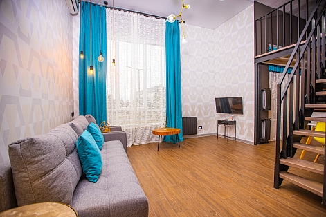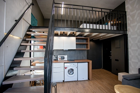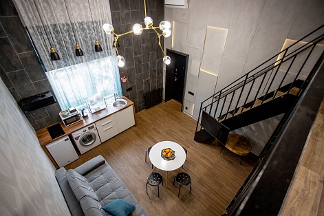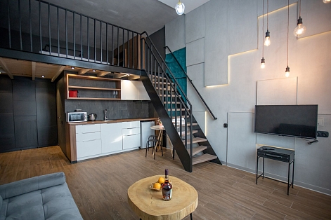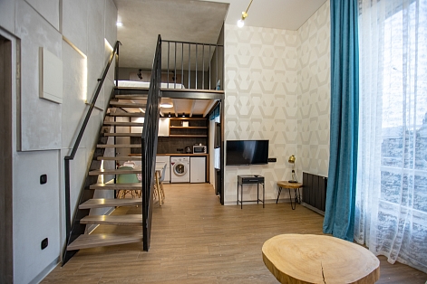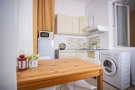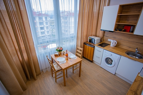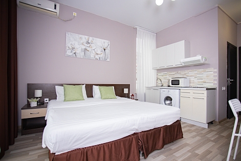 В номере: диван, зеркало, кровать двуспальная, кухонная мебель, прикроватные тумбочки, стол, стулья, шкаф встроенный, гладильная доска, кофемашина, микроволновая печь, набор посуды, плита электрическая, сплит-система, стиральная машина, телевизор ЖК, утюг, холодильник, электрочайник