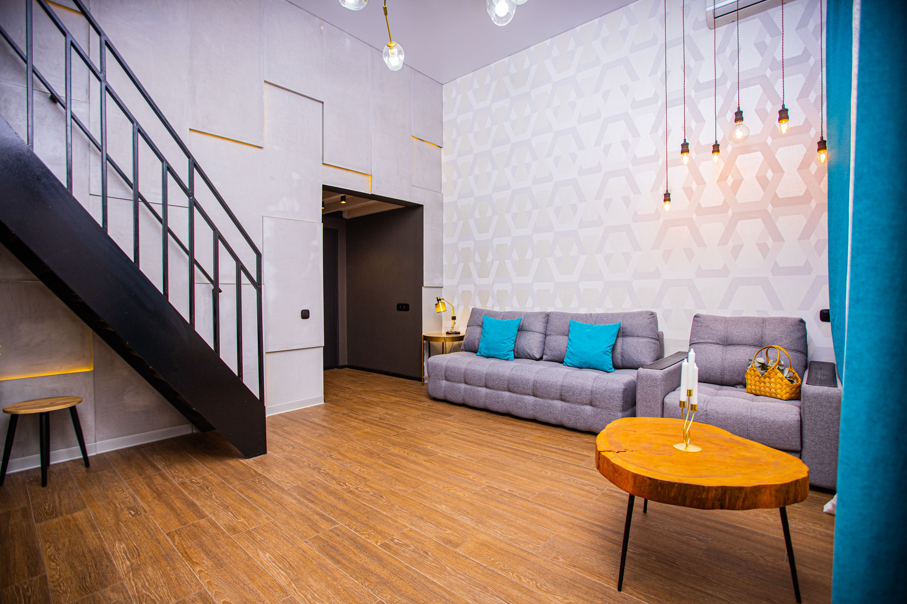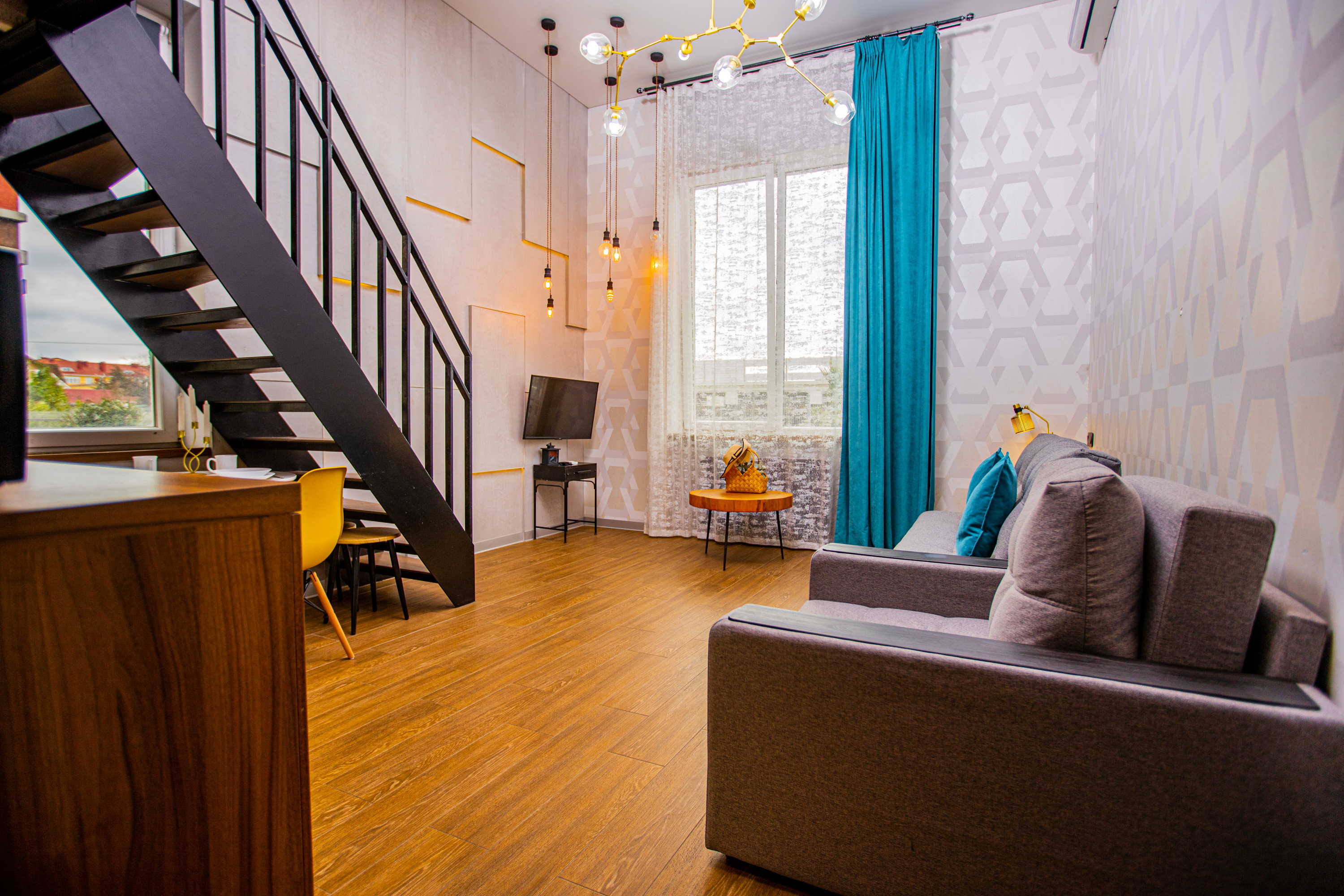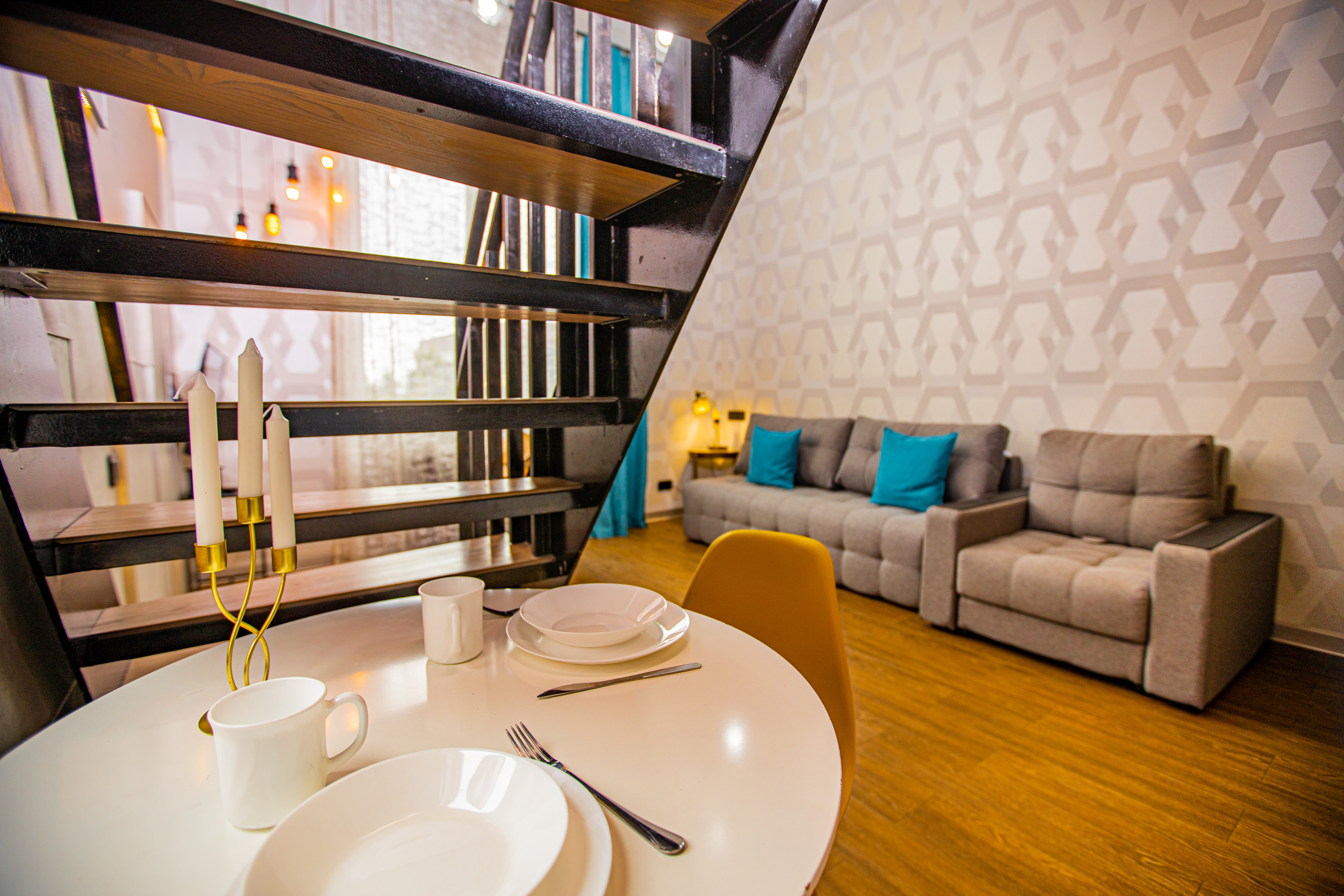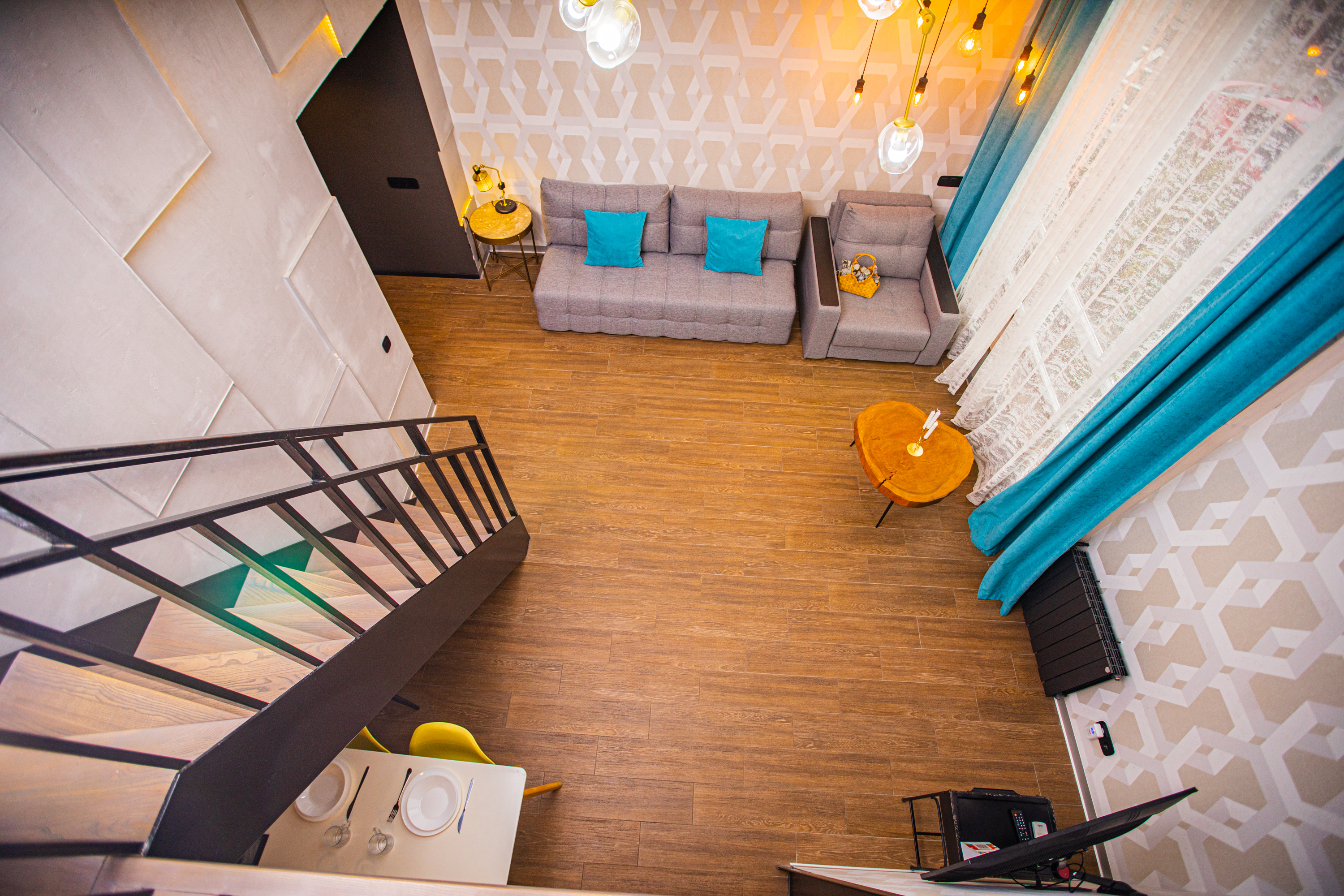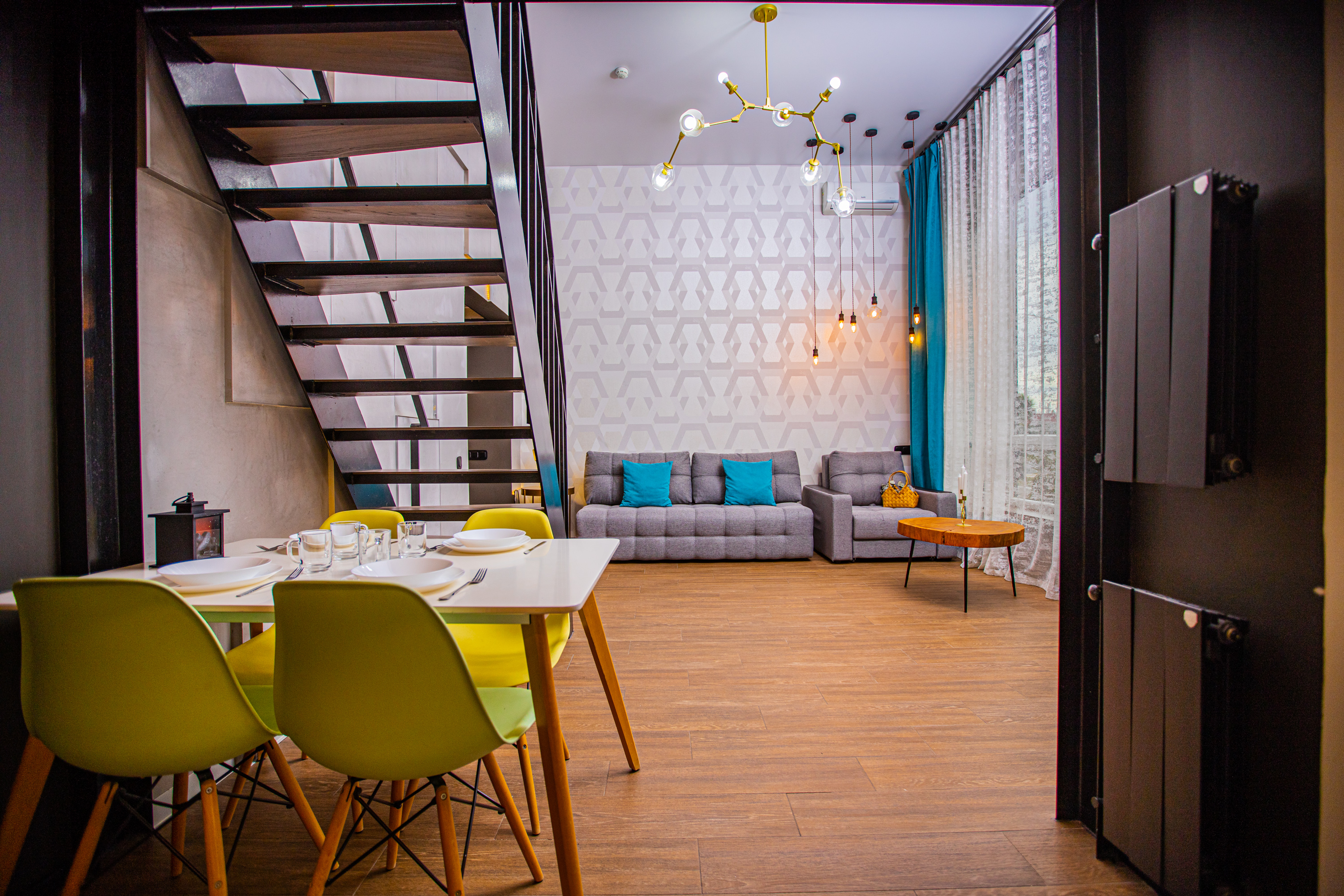 В номере: диван, зеркало, кровать двуспальная, кухонная мебель, прикроватные тумбочки, стол, стулья, шкаф встроенный, гладильная доска, кофемашина, микроволновая печь, набор посуды, плита электрическая, сплит-система, стиральная машина, телевизор ЖК, утюг, холодильник, электрочайник