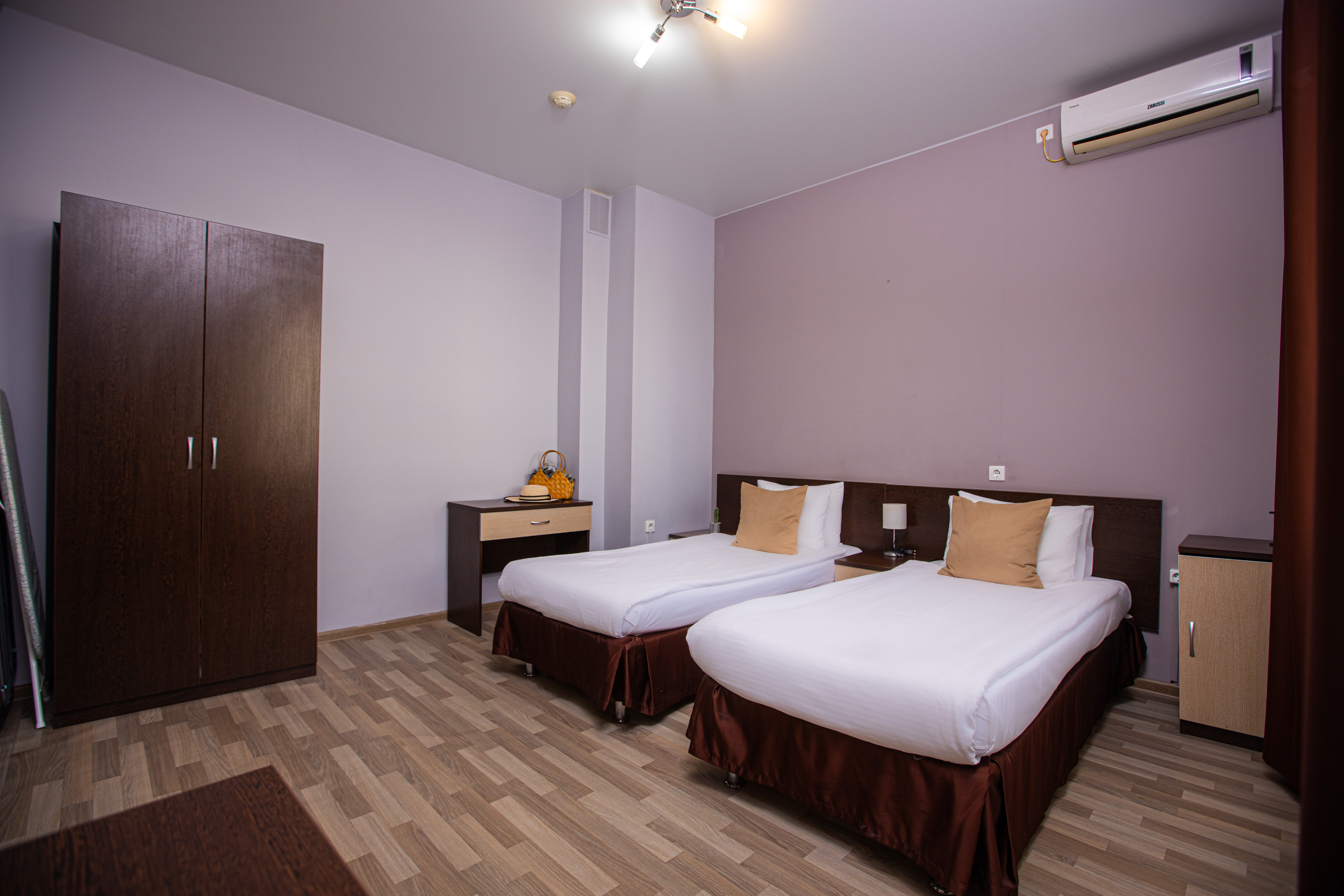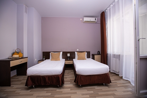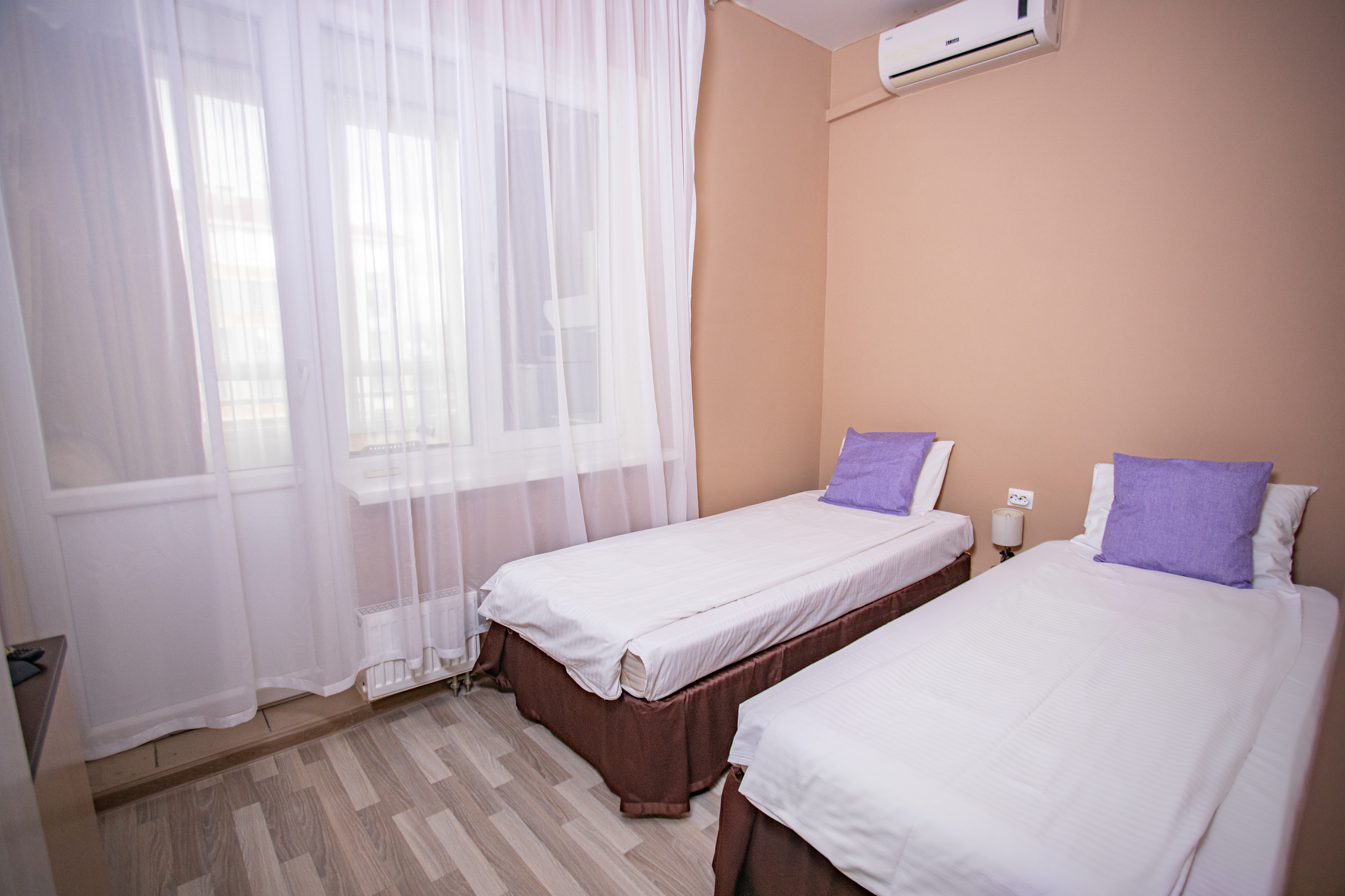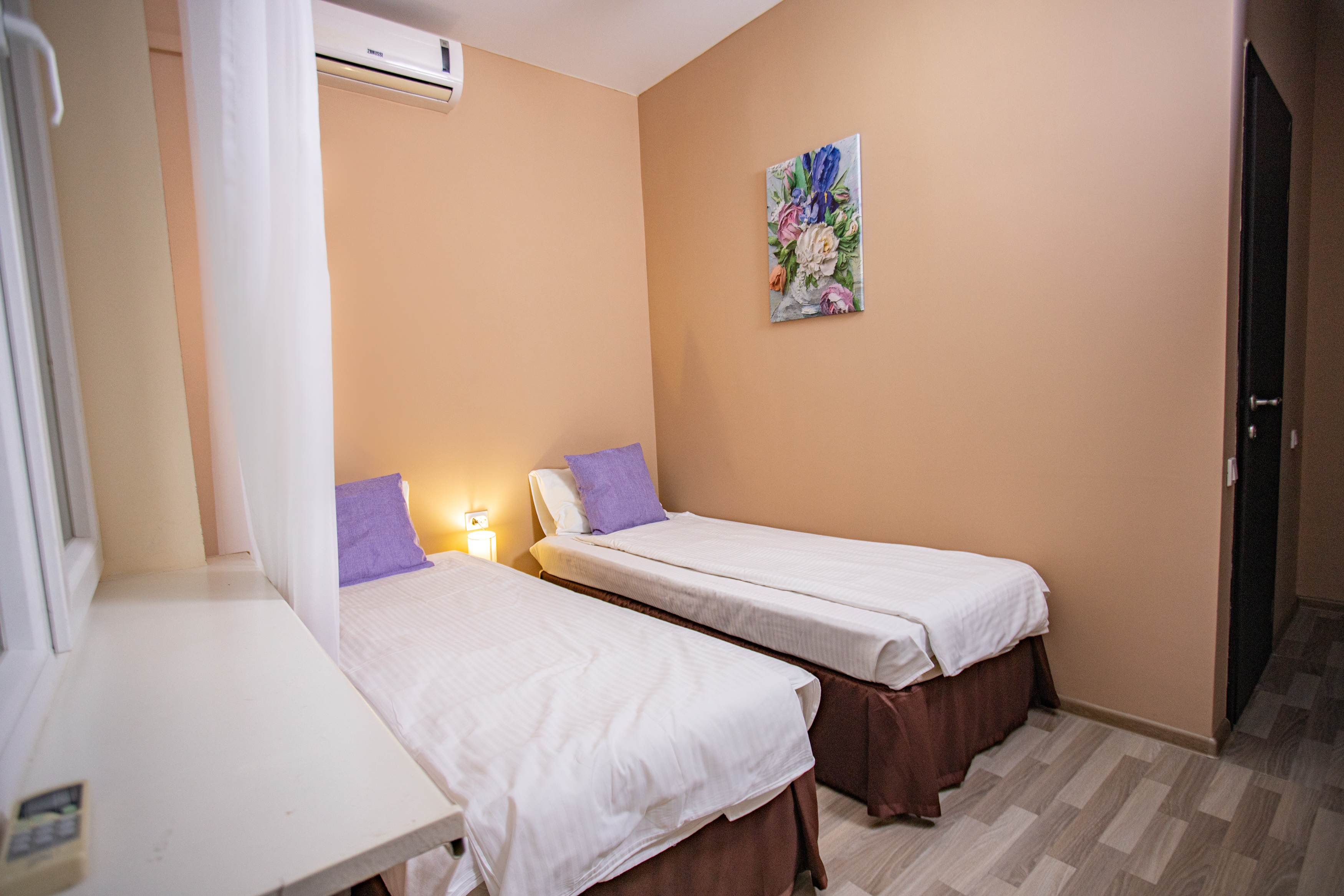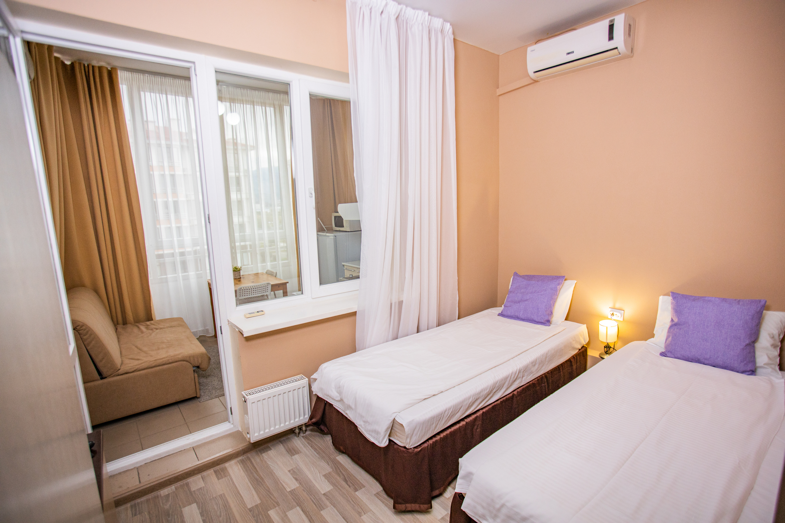 В номере: вешалка, диван, зеркало, кровати односпальные, кухонная мебель, прикроватные тумбочки, стол, стулья, шкаф, гладильная доска, кофемашина, микроволновая печь, набор посуды, плита электрическая, сплит-система, стиральная машина, телевизор ЖК, утюг, электрочайник