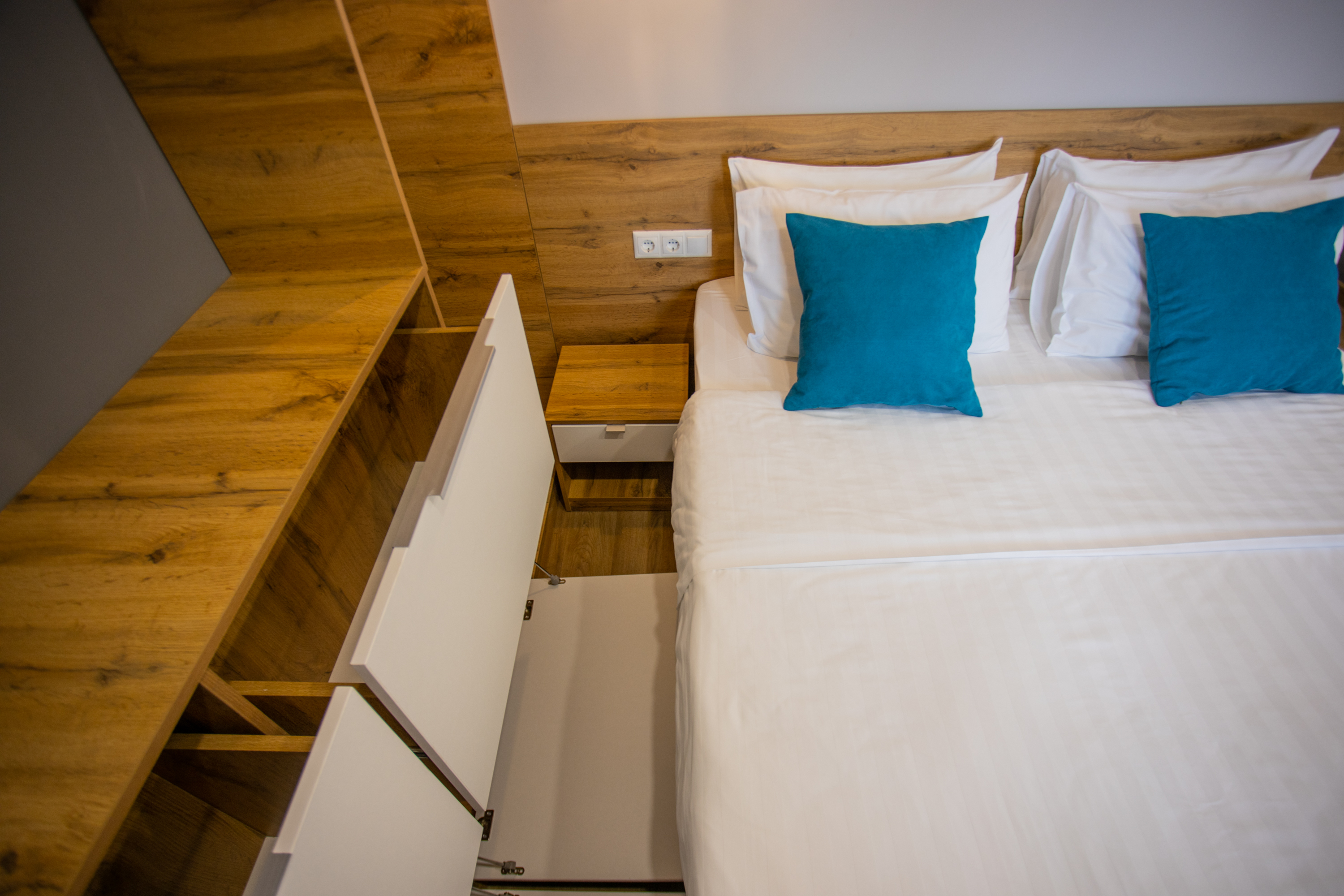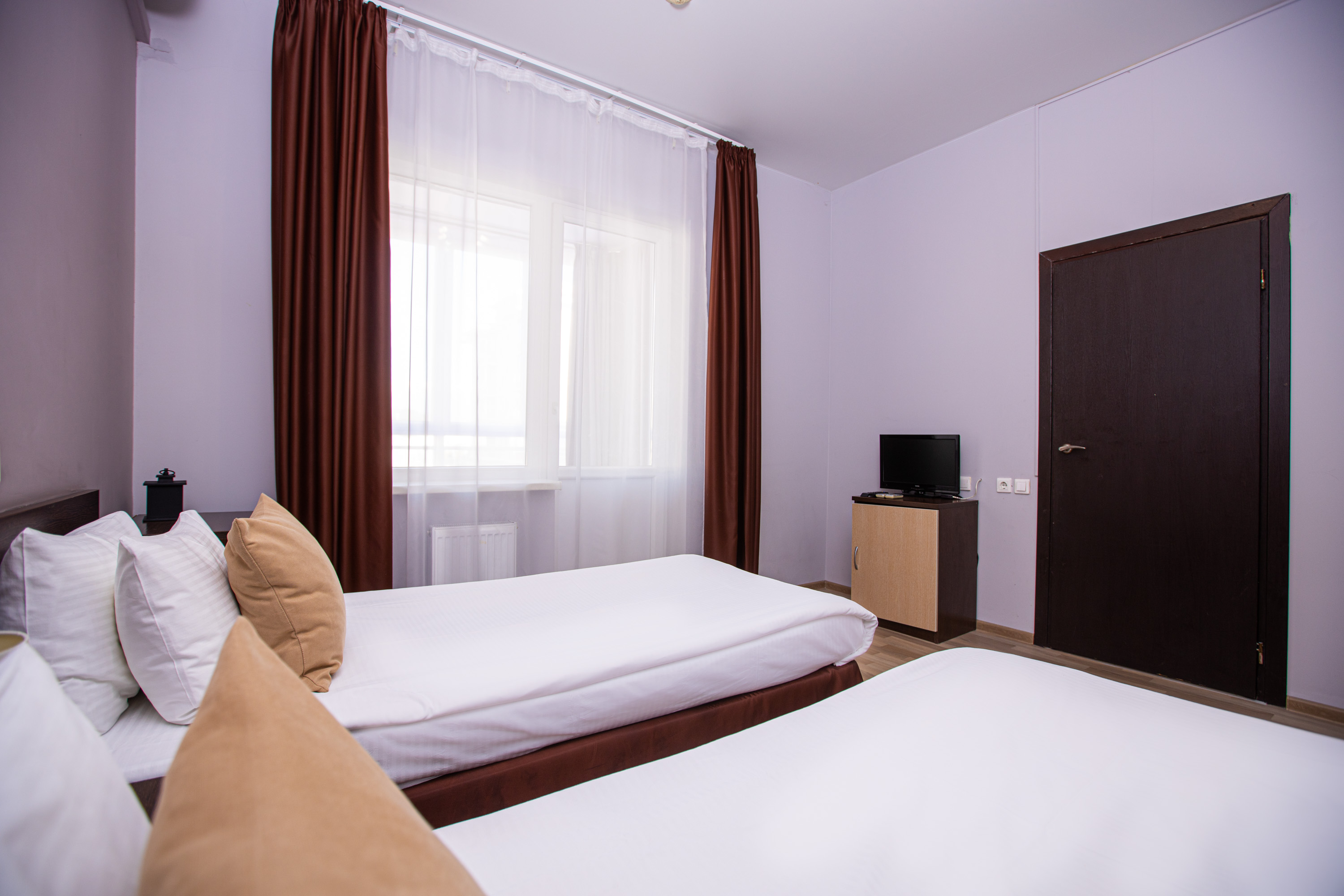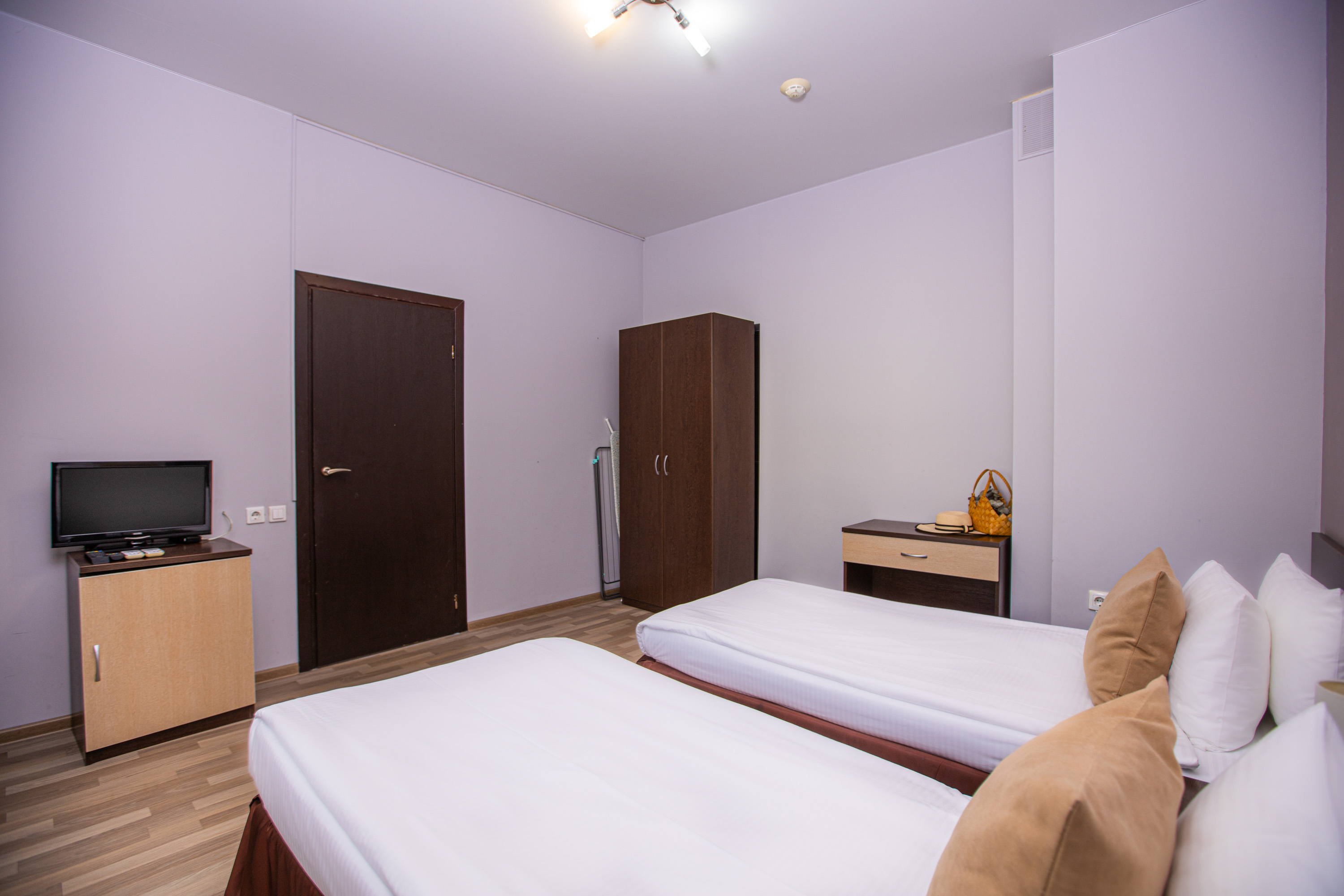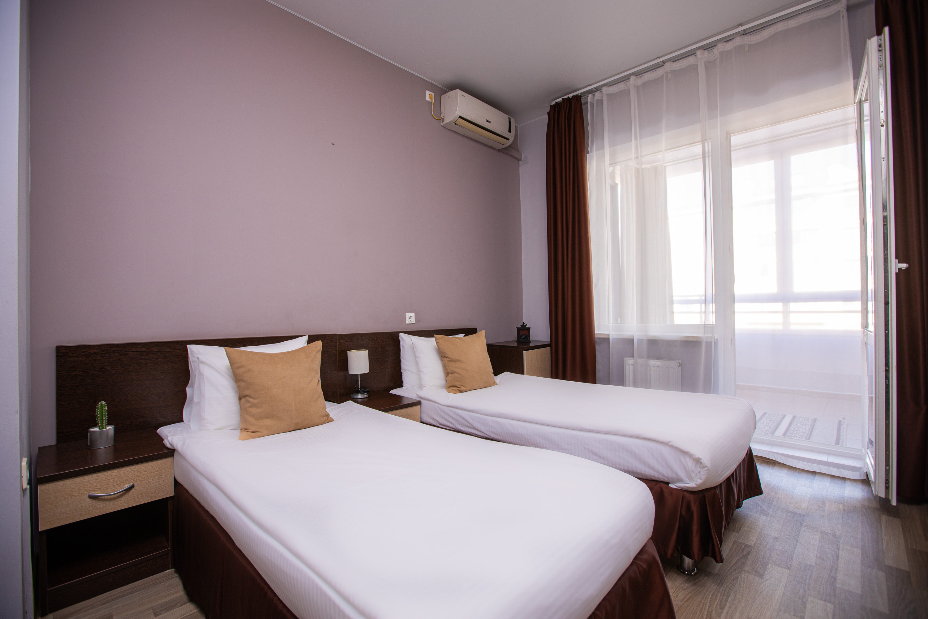 В номере: вешалка, диван, зеркало, кровати односпальные, кухонная мебель, прикроватные тумбочки, стол, стулья, шкаф, гладильная доска, кофемашина, микроволновая печь, набор посуды, плита электрическая, сплит-система, стиральная машина, телевизор ЖК, утюг, электрочайник