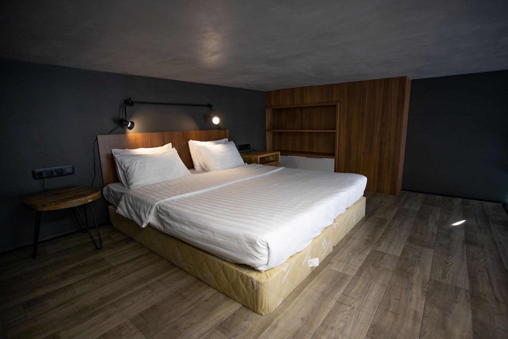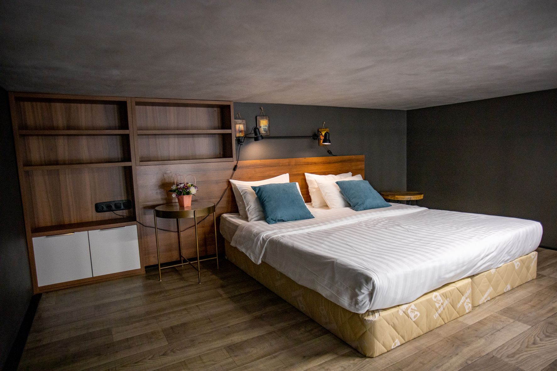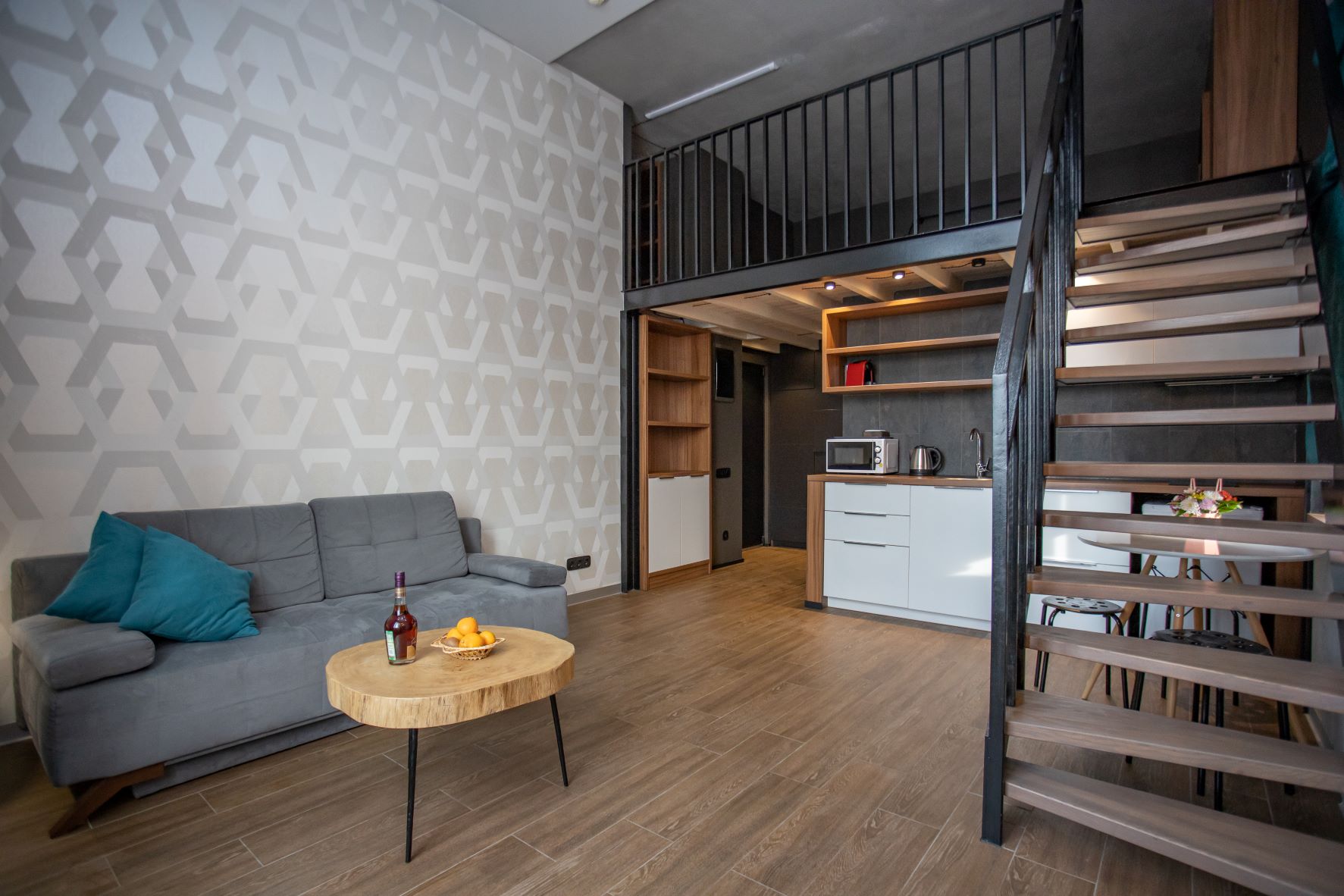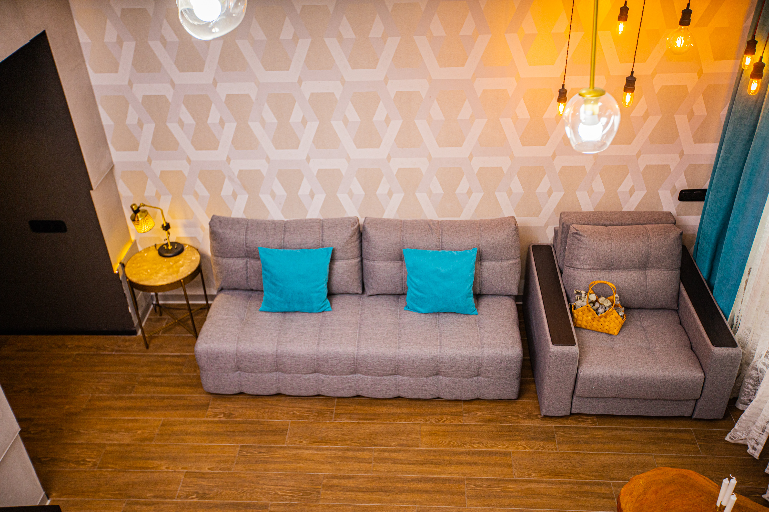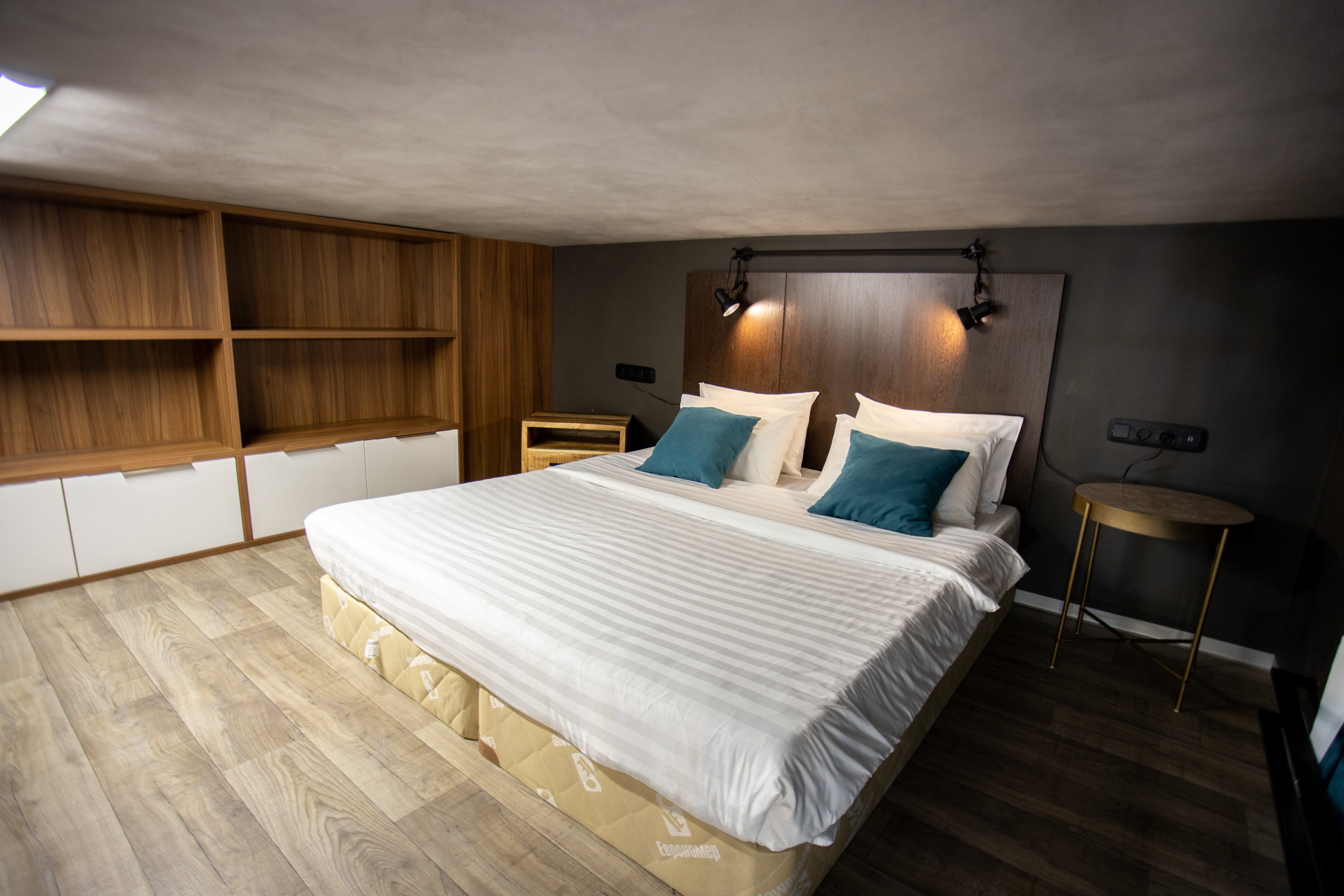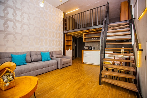 В номере: диван, зеркало, кресло-кровать, кровать двуспальная, кухонная мебель, прикроватные тумбочки, стол, стулья, шкаф встроенный, гладильная доска, кофемашина, набор посуды, плита электрическая, сплит-система, телевизор ЖК, утюг, холодильник, электрочайник