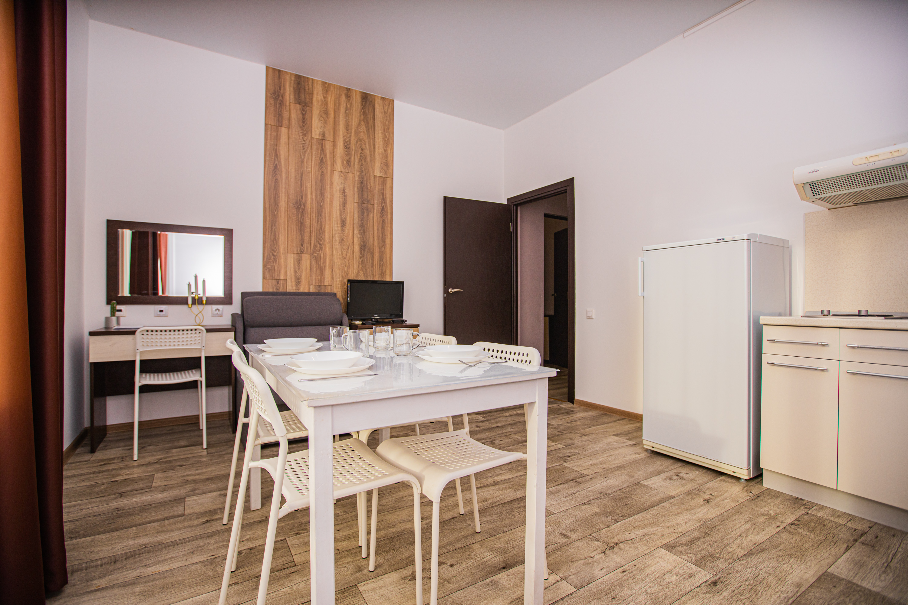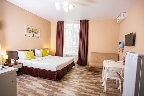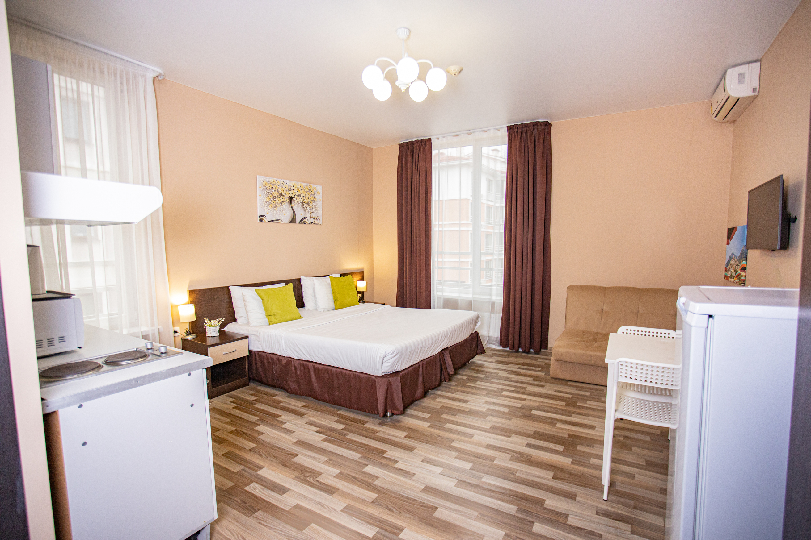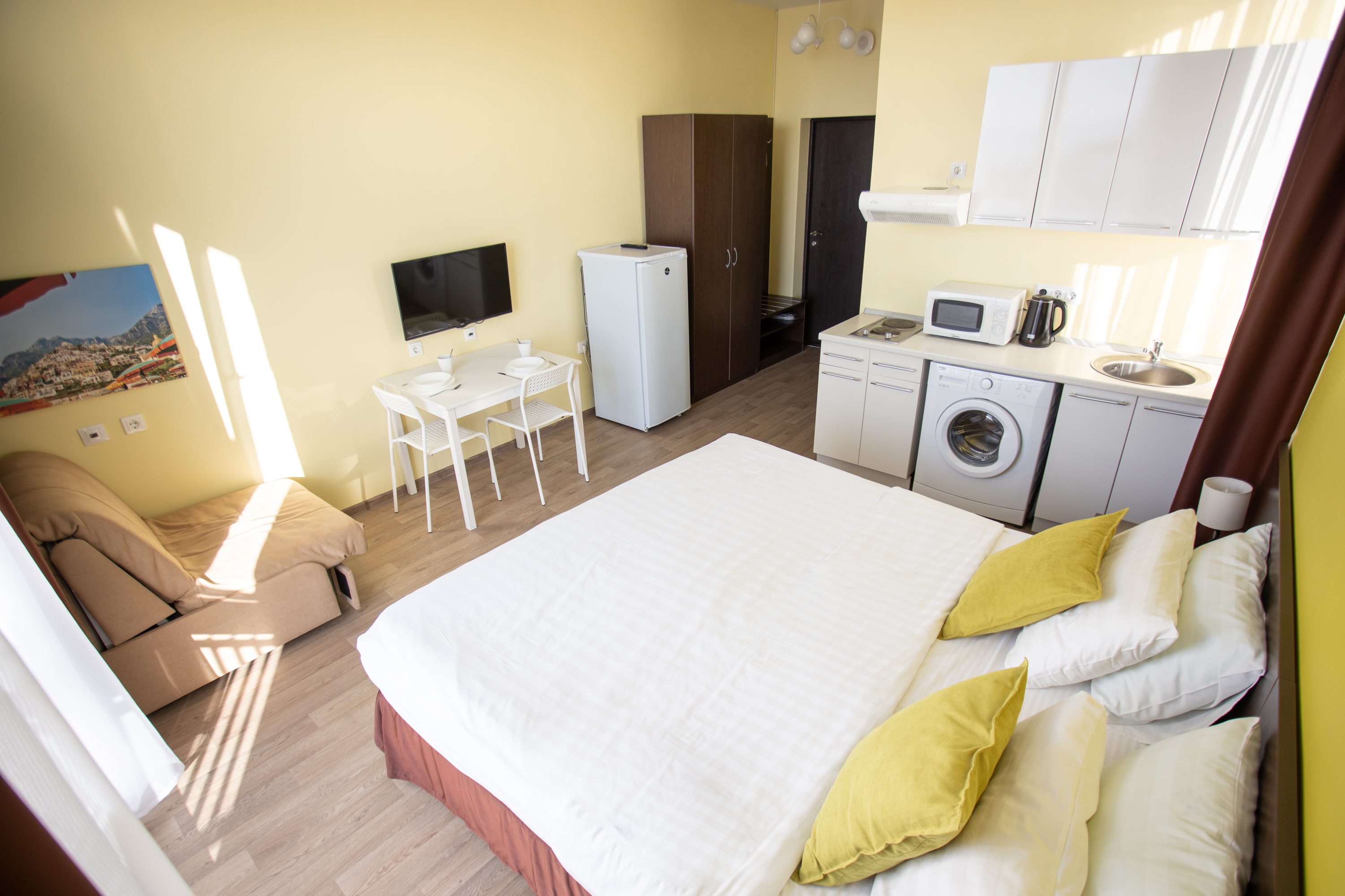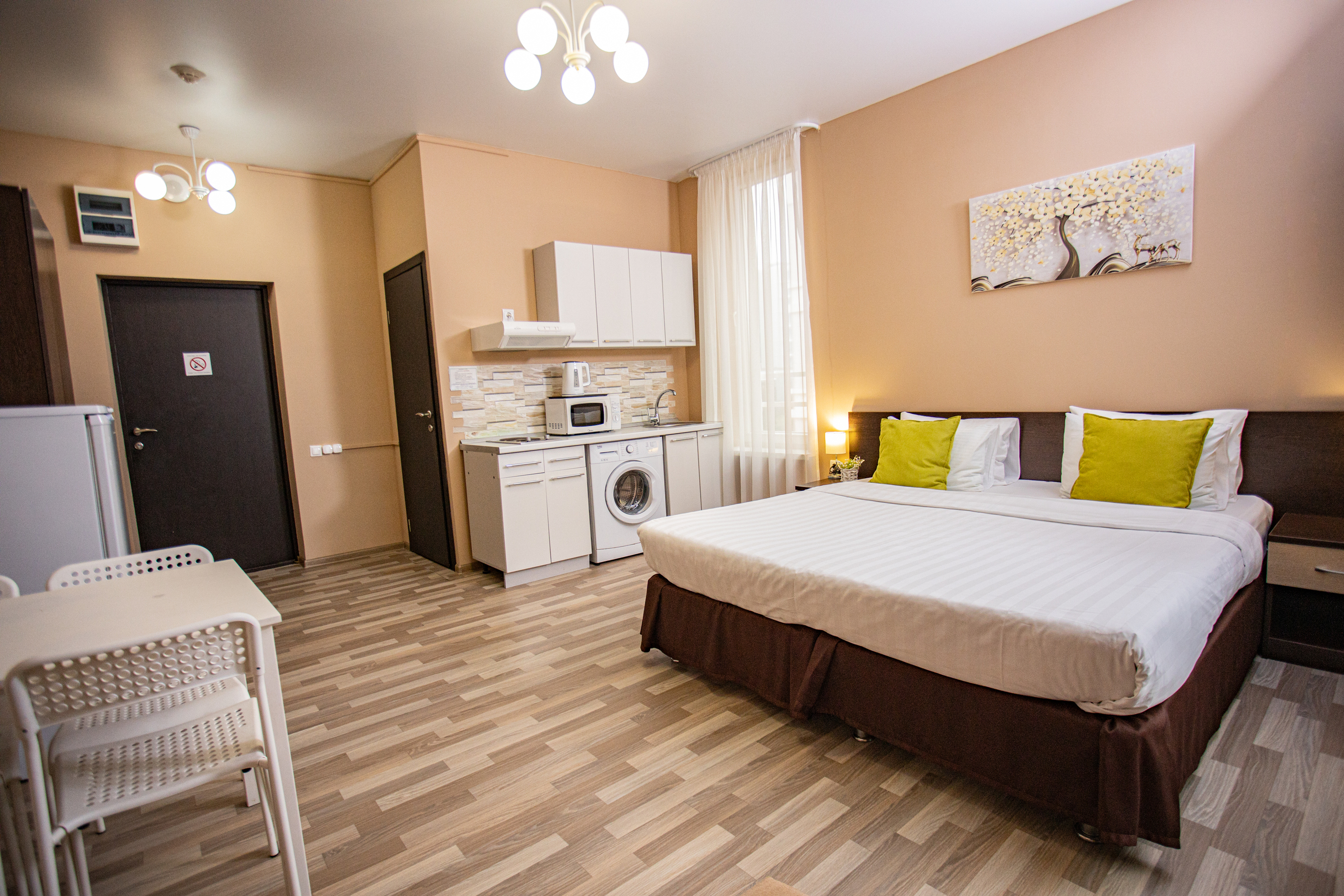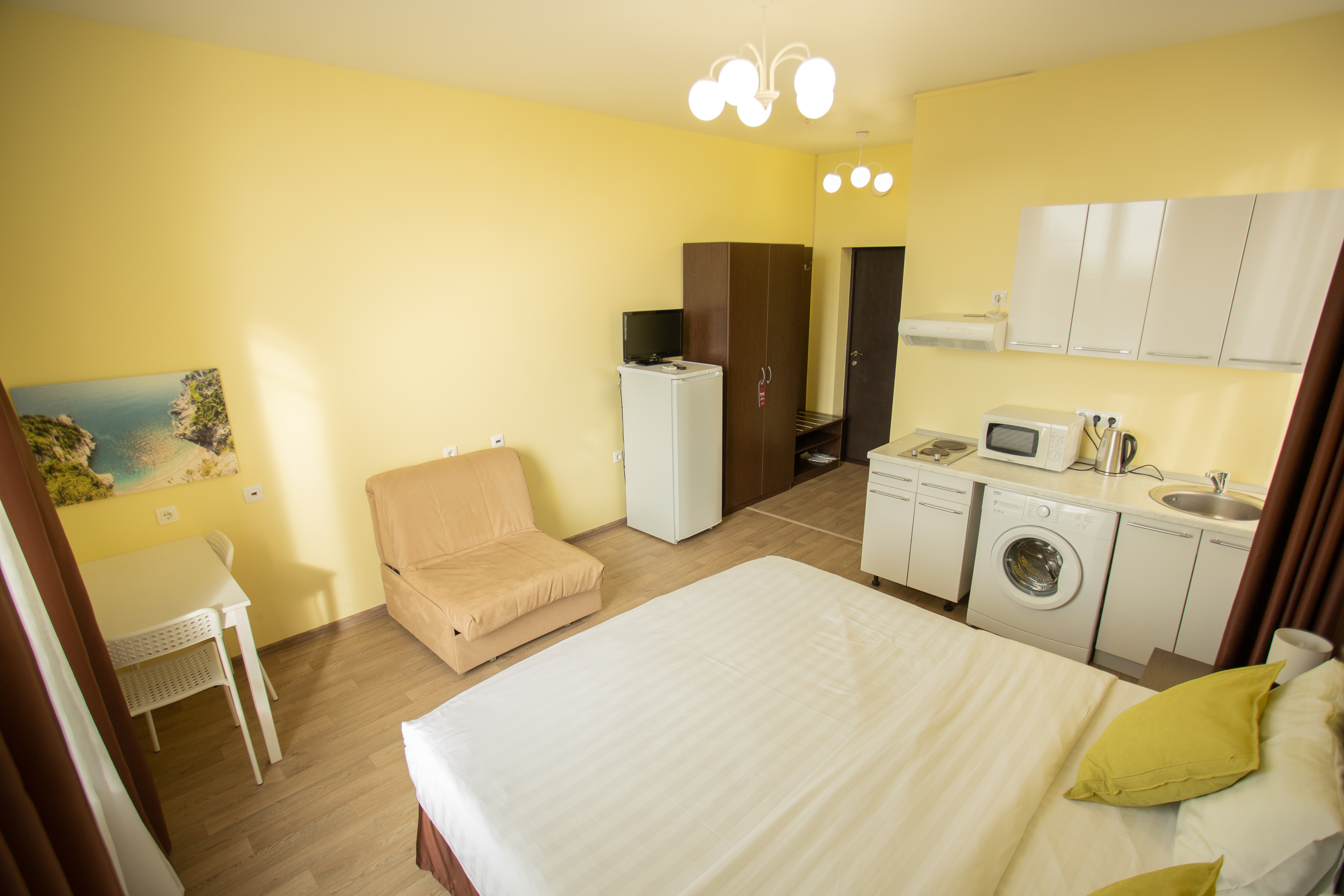 В номере: диван, зеркало, кровать двуспальная, кухонная мебель, прикроватные тумбочки, стол, стулья, шкаф встроенный, гладильная доска, плита электрическая, сплит-система, стиральная машина, телевизор ЖК, утюг, холодильник, электрочайник