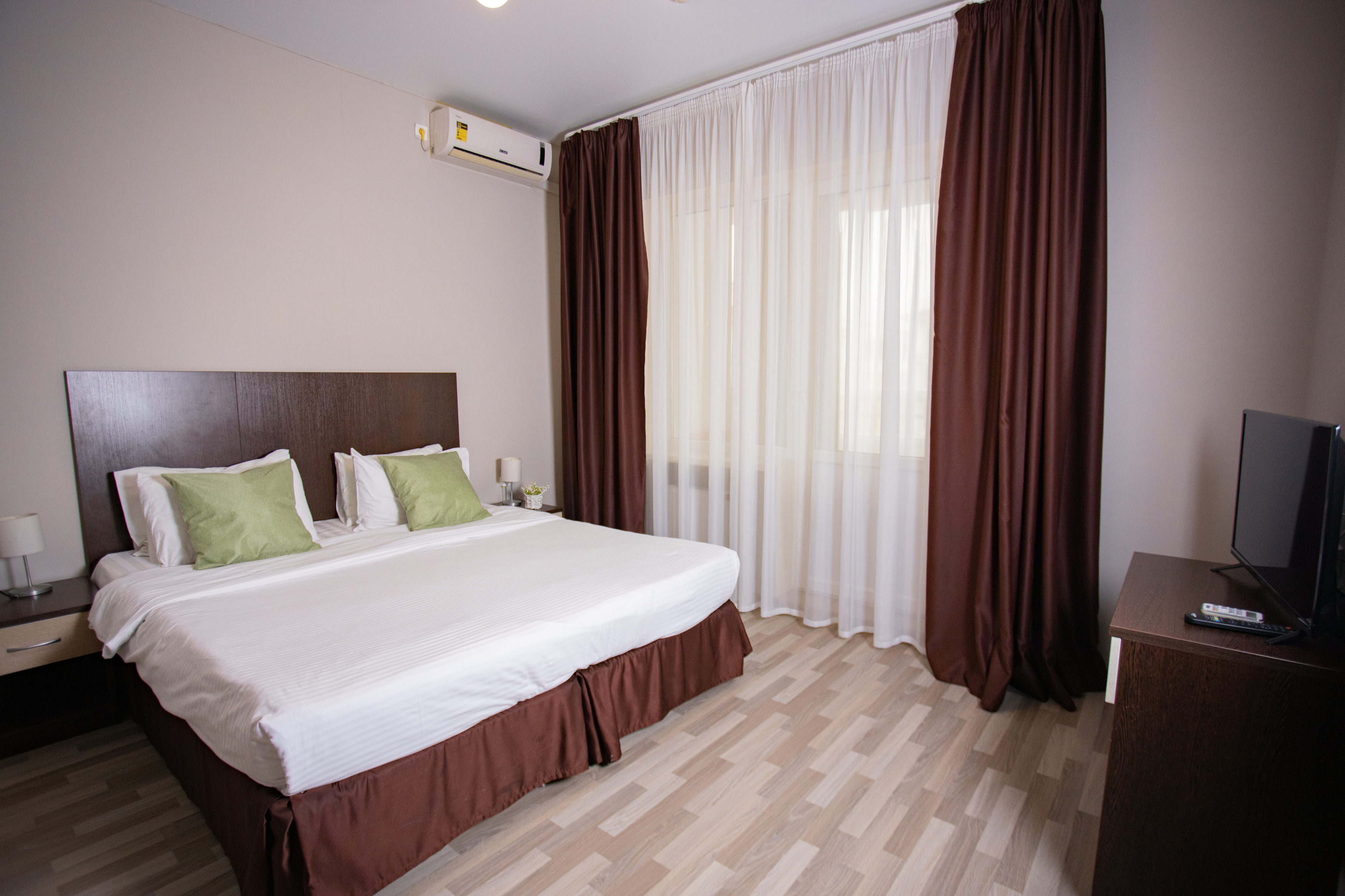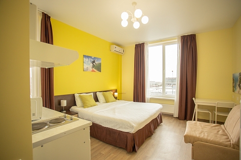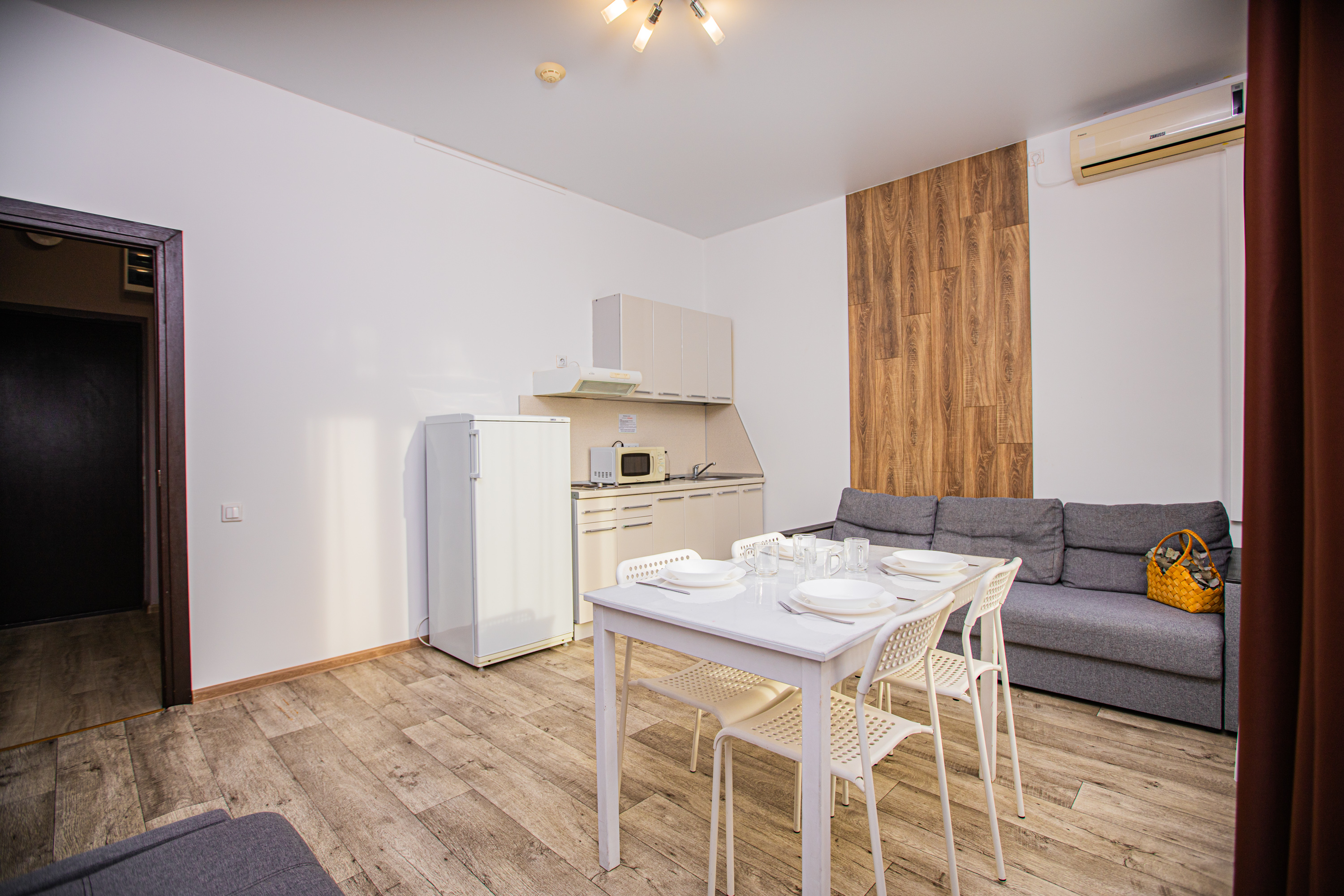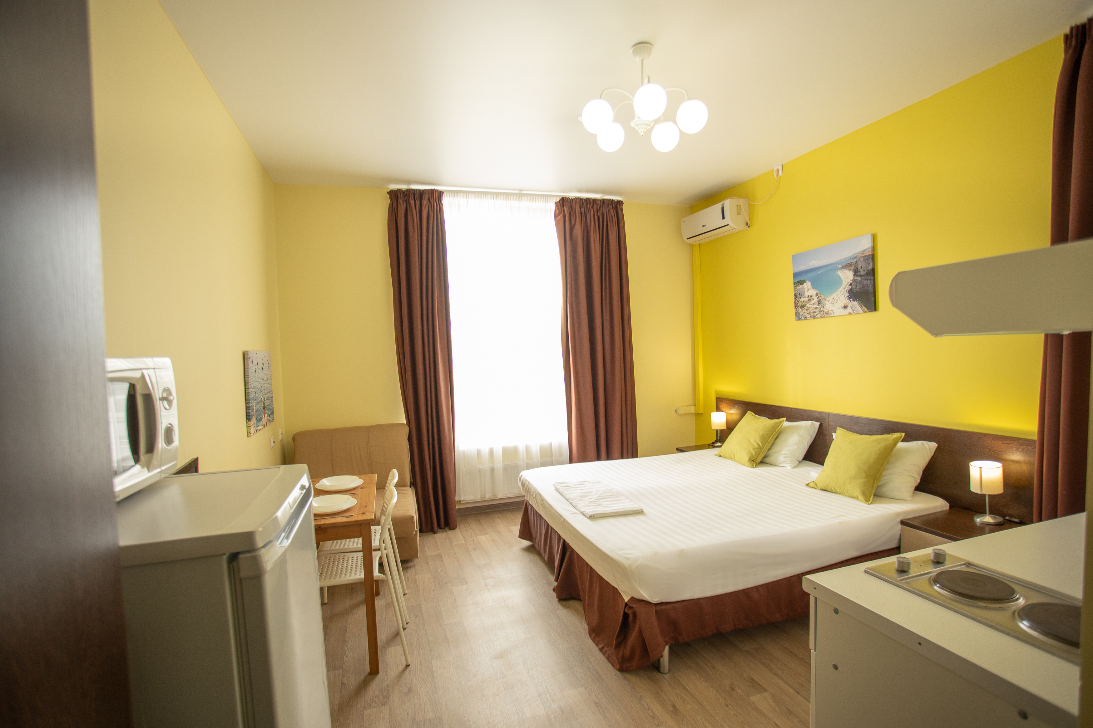 В номере: диван, зеркало, кровать двуспальная, кухонная мебель, прикроватные тумбочки, стулья, шкаф встроенный, гладильная доска, микроволновая печь, набор посуды, плита электрическая, сплит-система, стиральная машина, телевизор ЖК, утюг, электрочайник