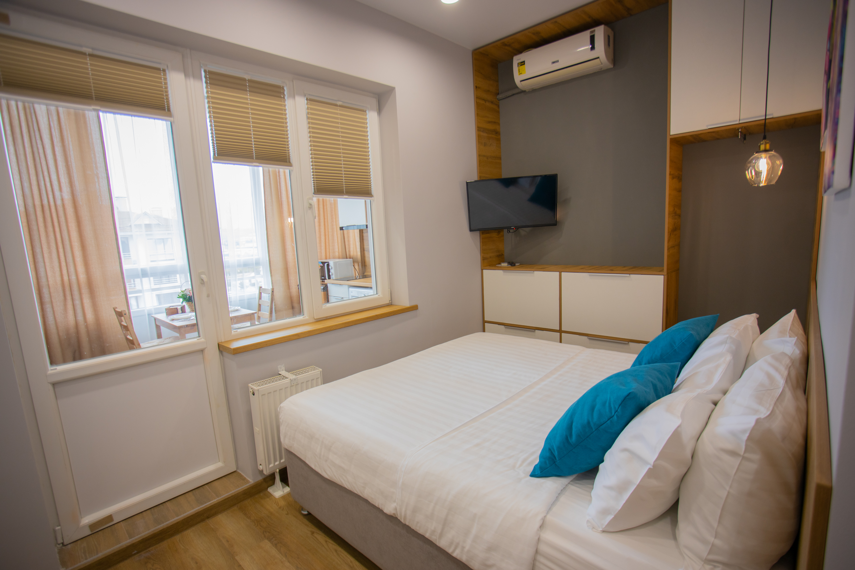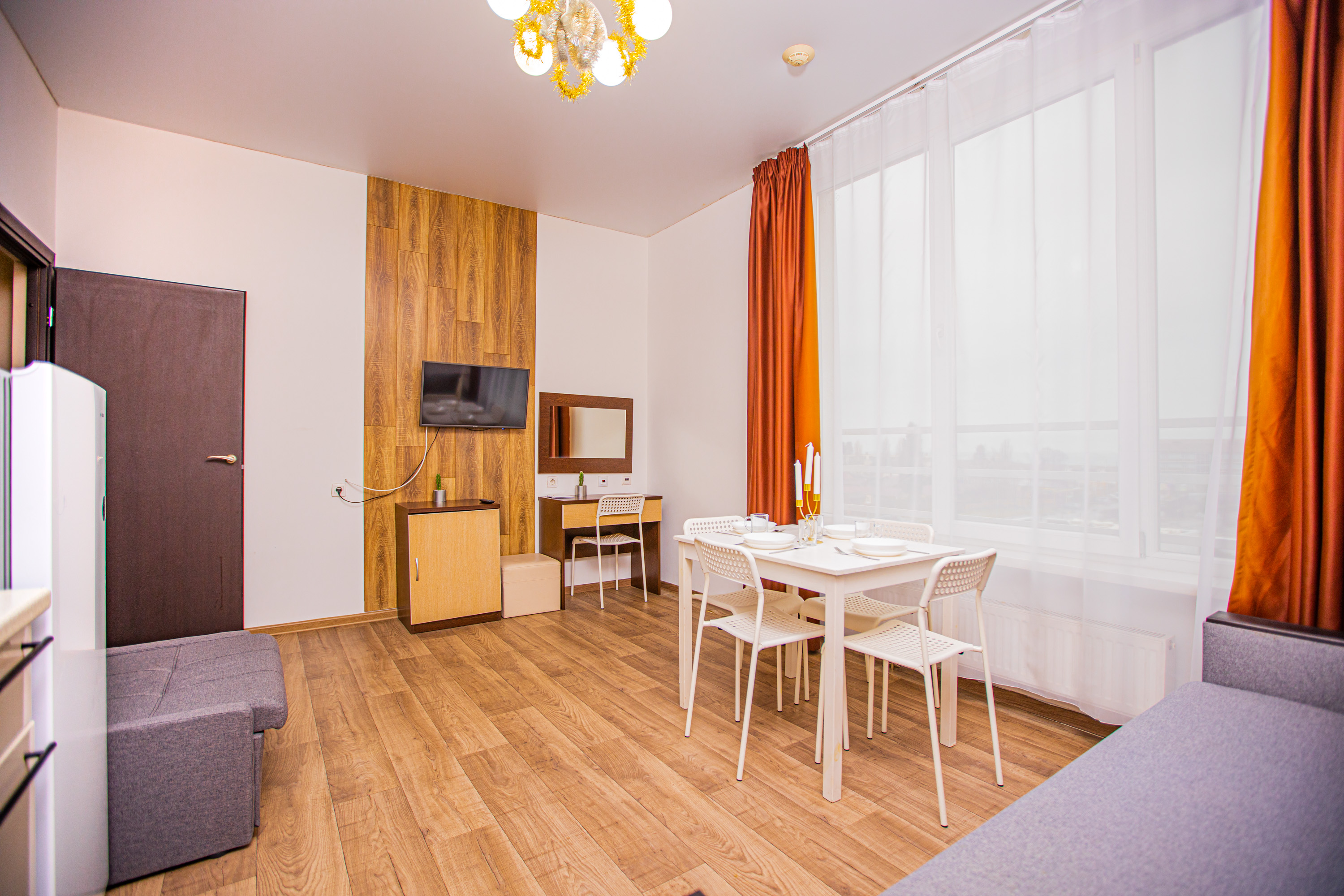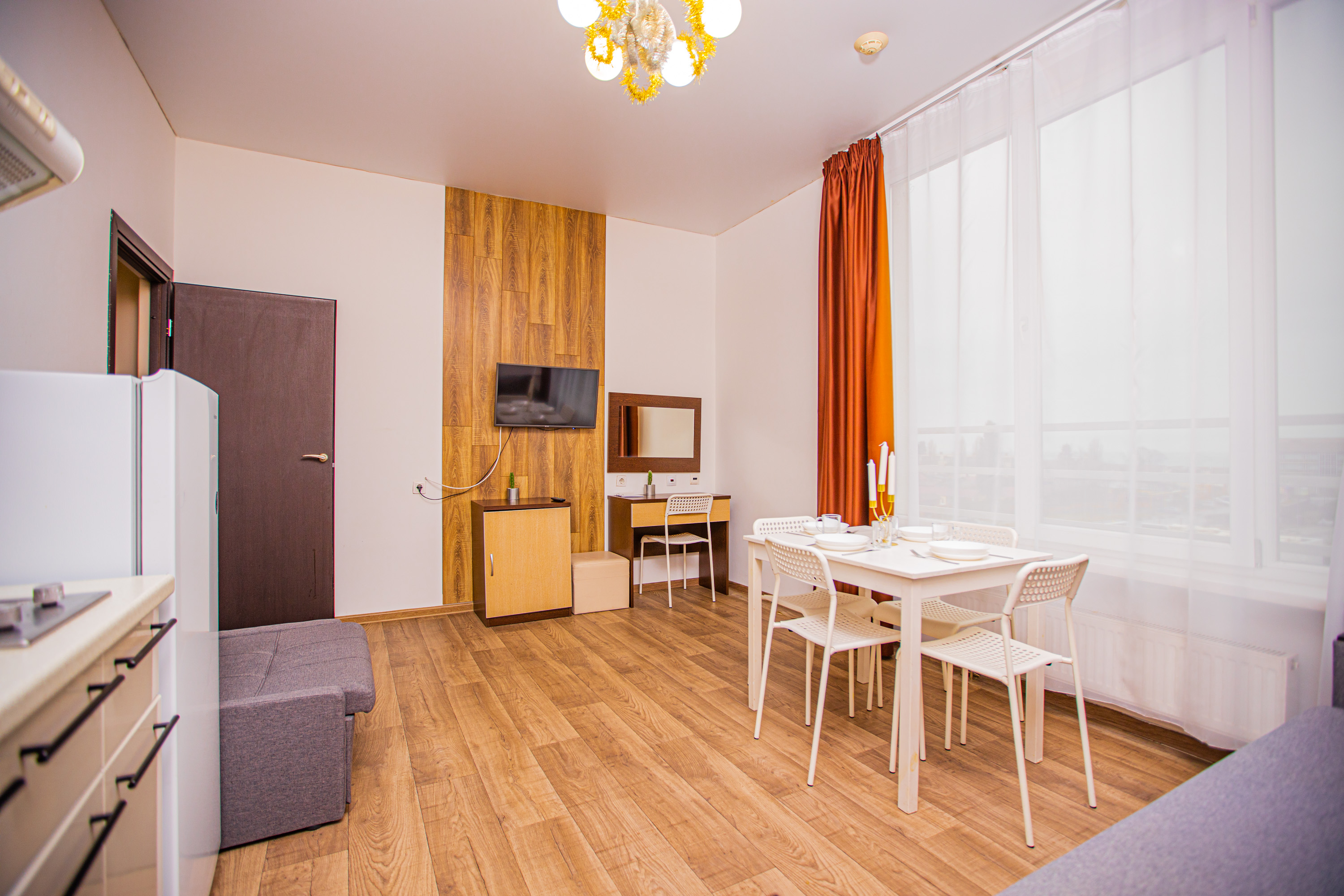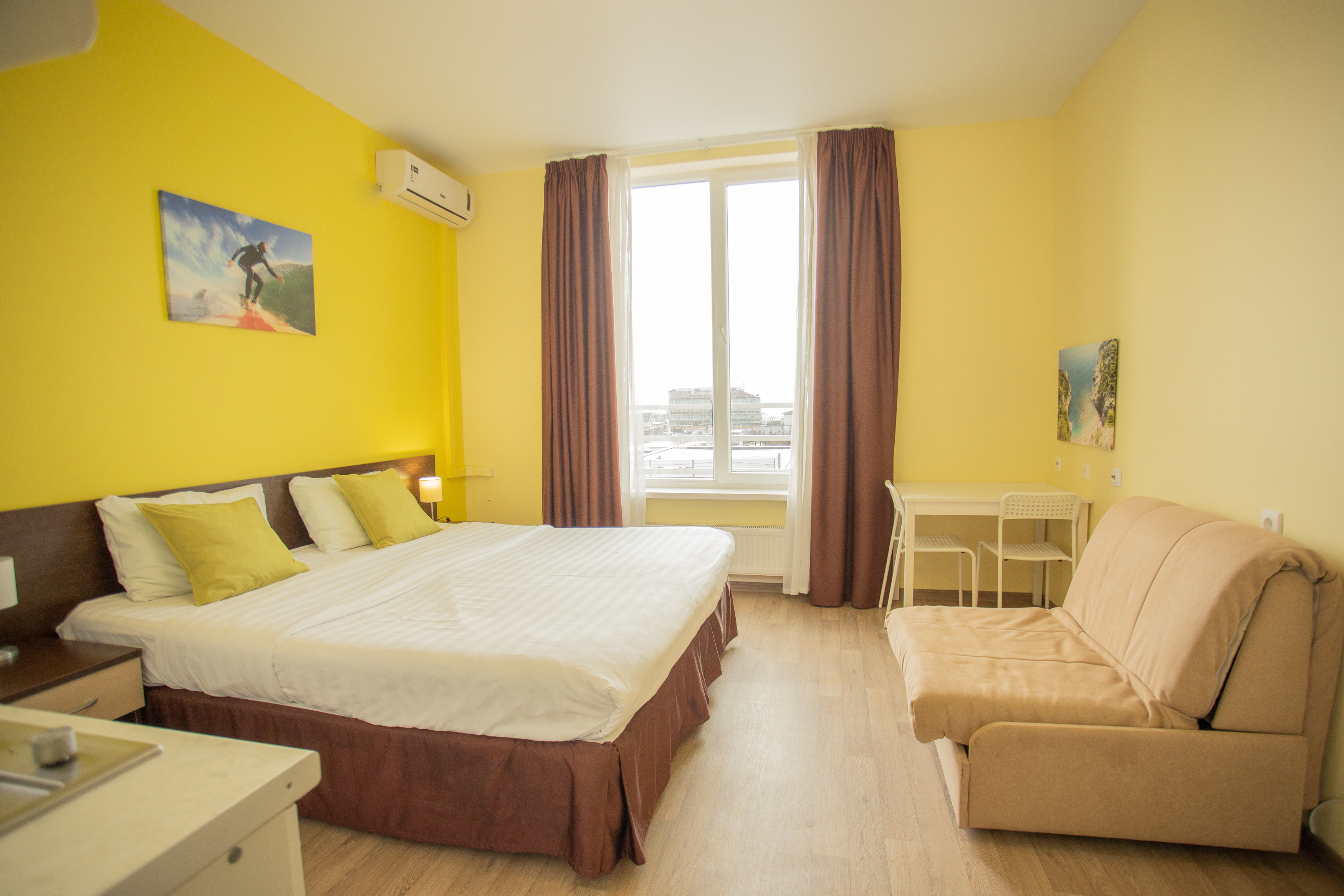 В номере: диван, зеркало, кровать двуспальная, кухонная мебель, прикроватные тумбочки, стулья, шкаф встроенный, гладильная доска, микроволновая печь, набор посуды, плита электрическая, сплит-система, стиральная машина, телевизор ЖК, утюг, электрочайник