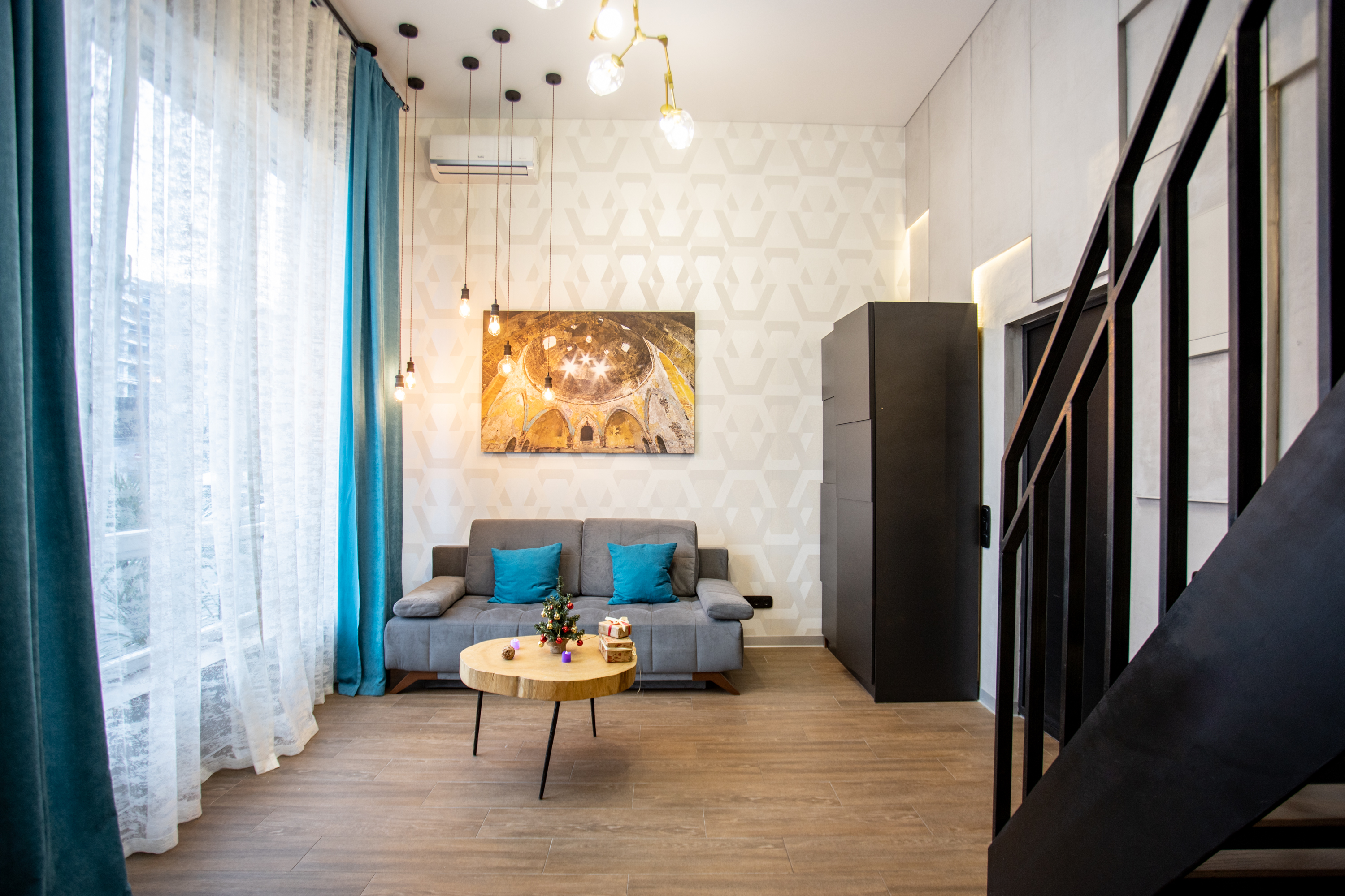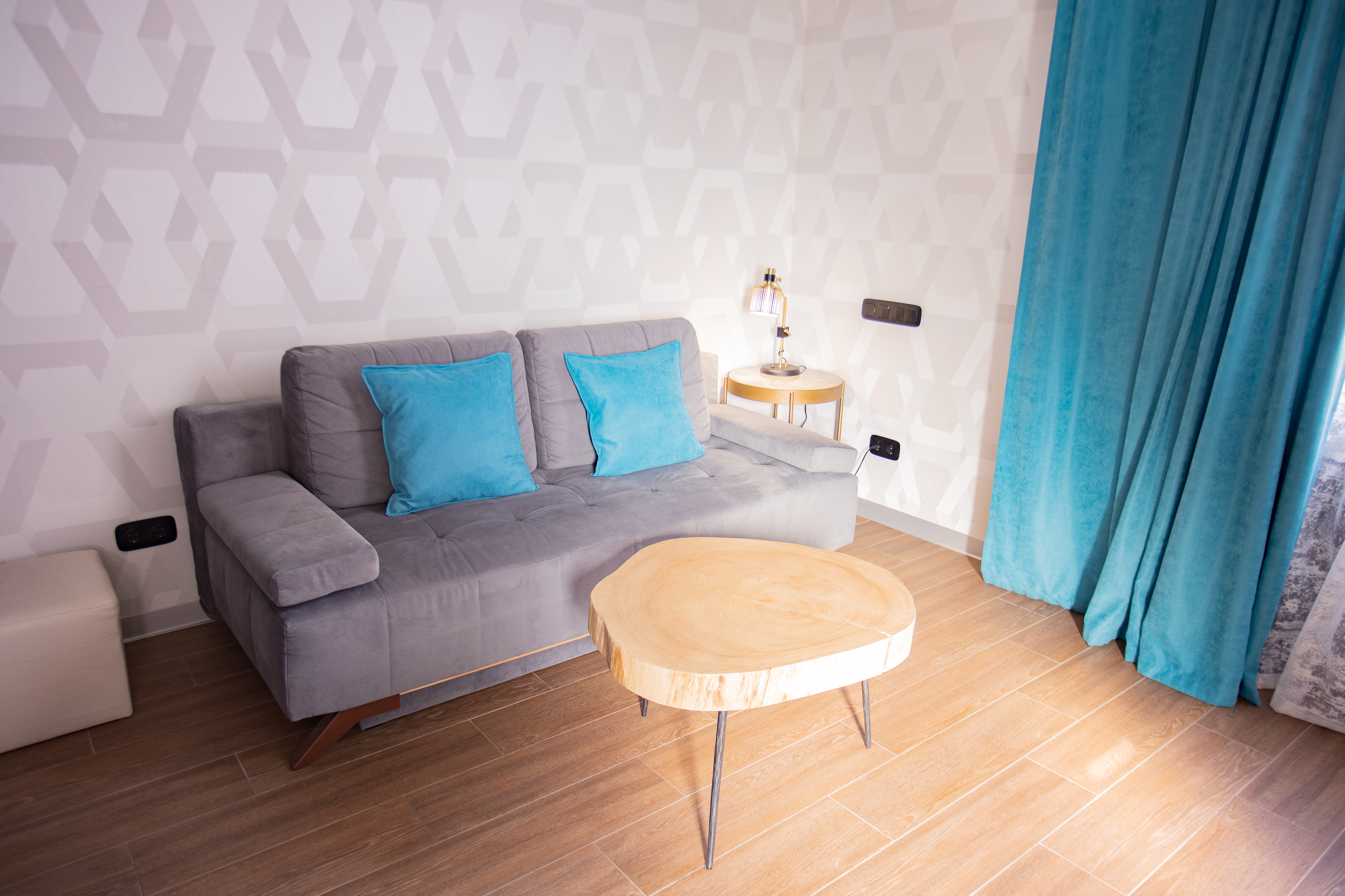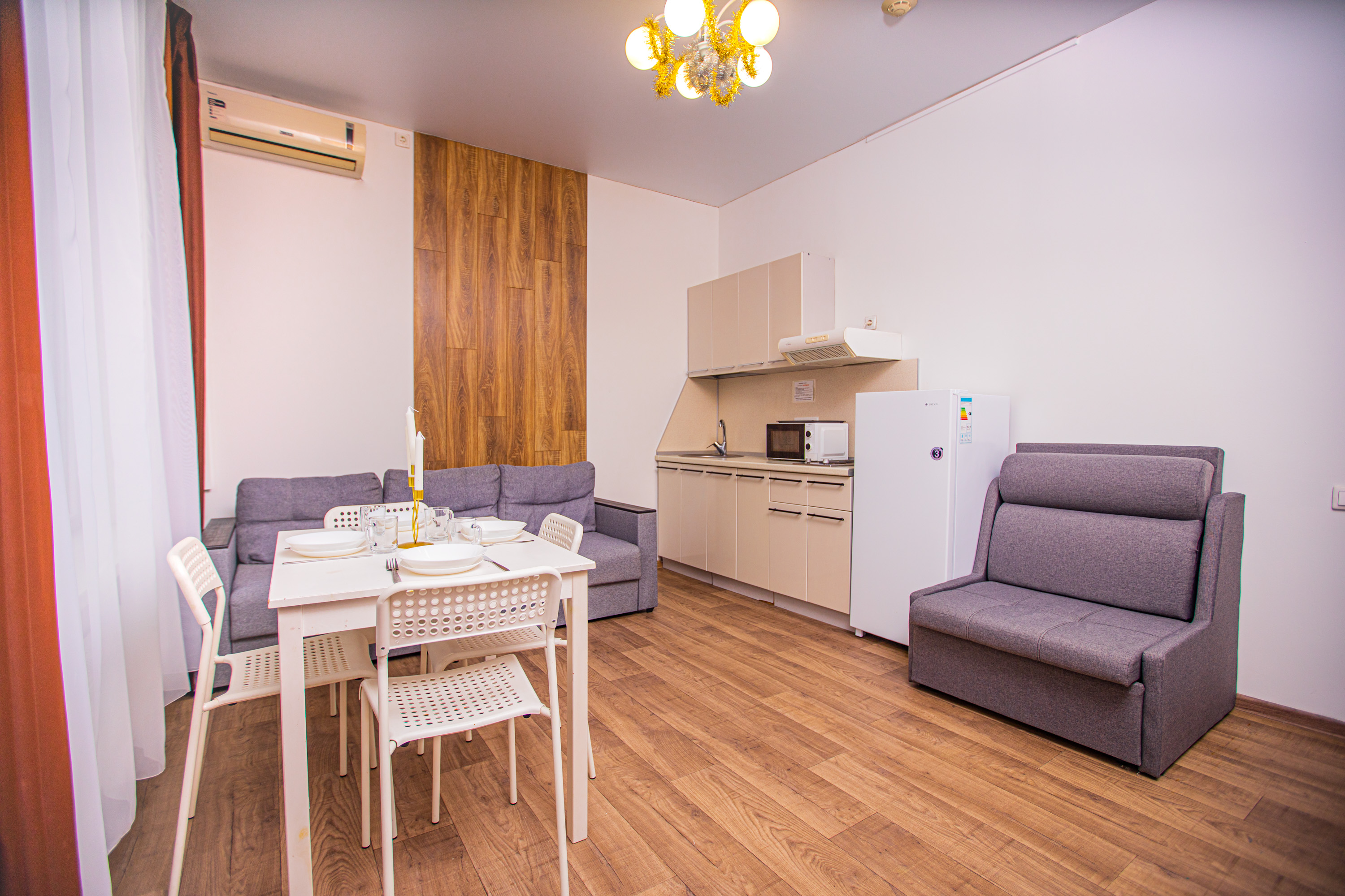 В номере: диван, зеркало, кровать двуспальная, кухонная мебель, прикроватные тумбочки, стол, стулья, шкаф встроенный, гладильная доска, кондиционер, кофемашина, набор посуды, сплит-система, стиральная машина, телевизор ЖК, утюг, холодильник, электрочайник