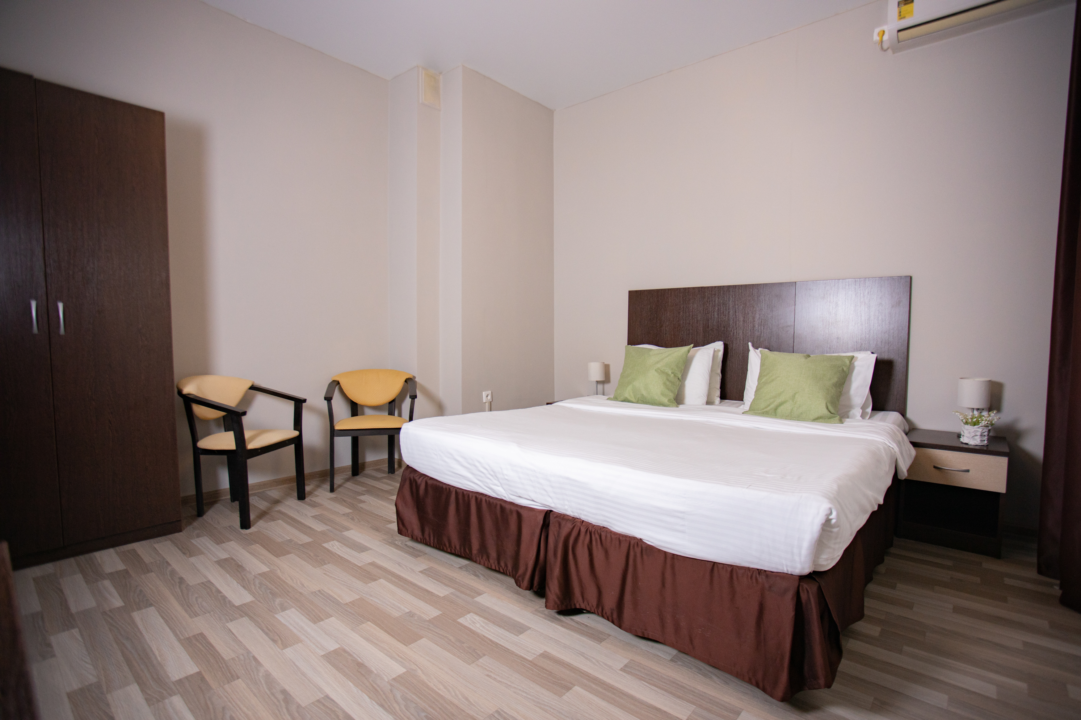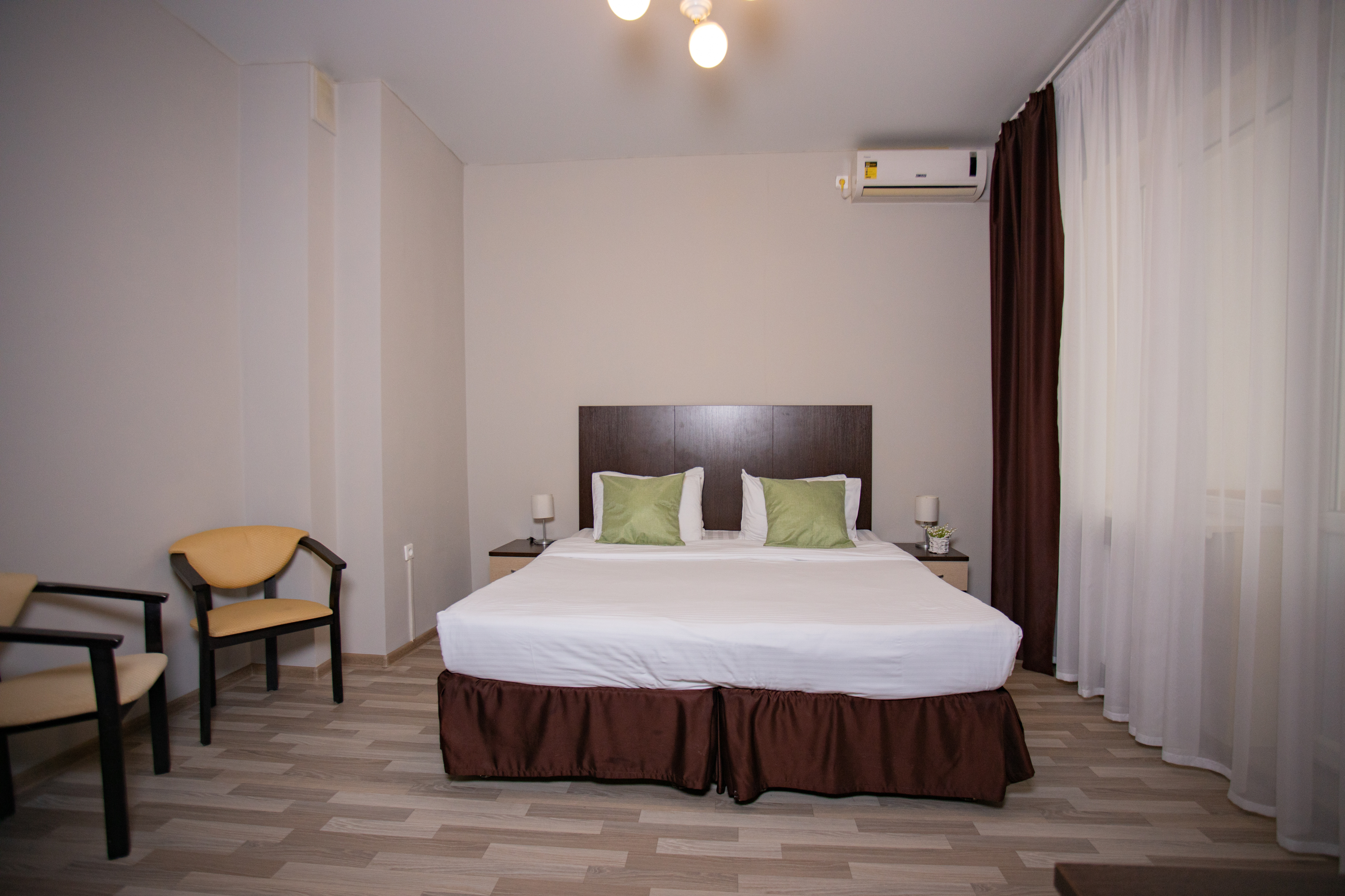 В номере: диван, зеркало, кровать двуспальная, кровать односпальная, кухонная мебель, стол, стулья, шкаф встроенный, гладильная доска, набор посуды, плита электрическая, сплит-система, стиральная машина, телевизор ЖК, утюг, холодильник, электрочайник