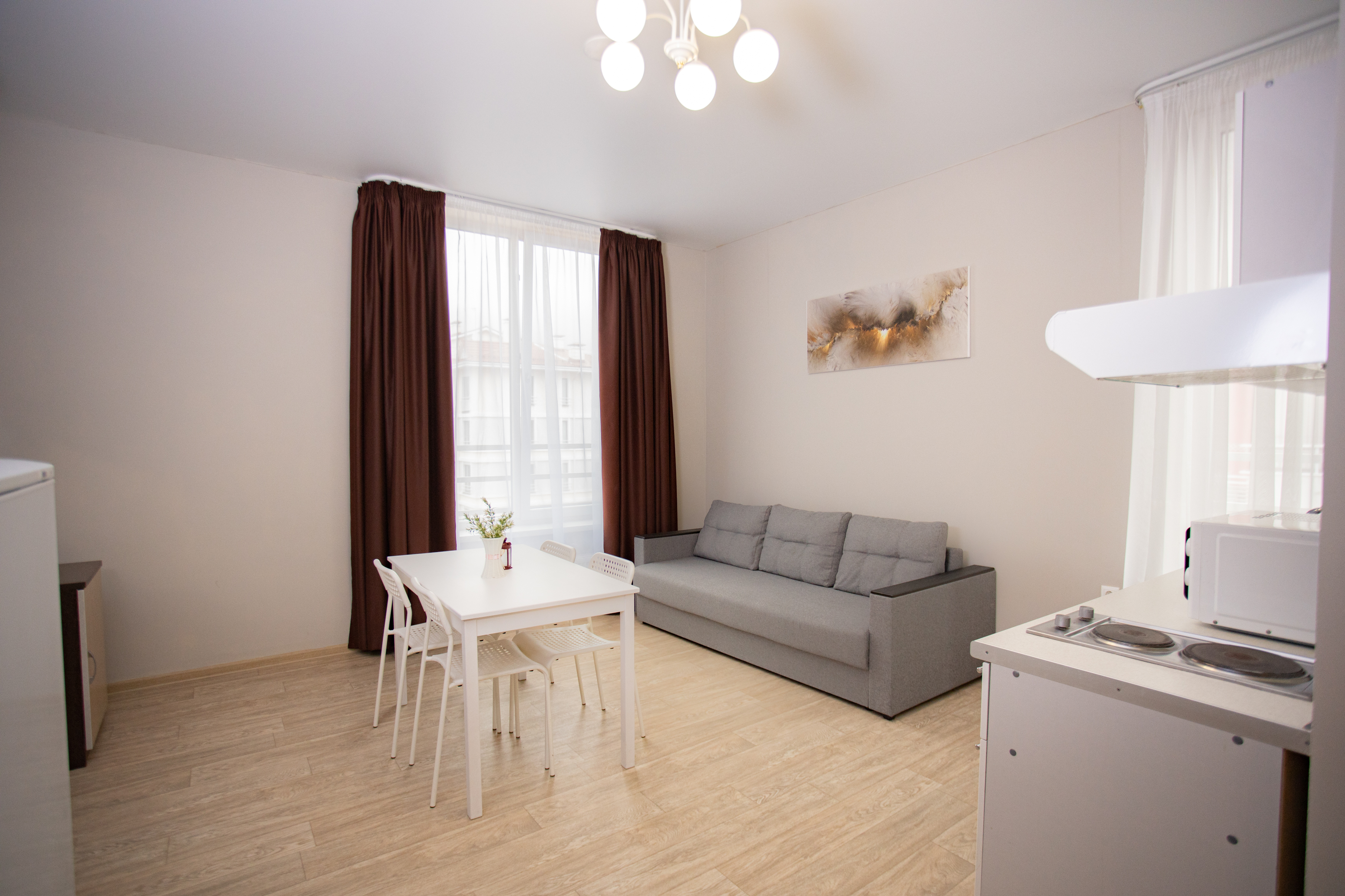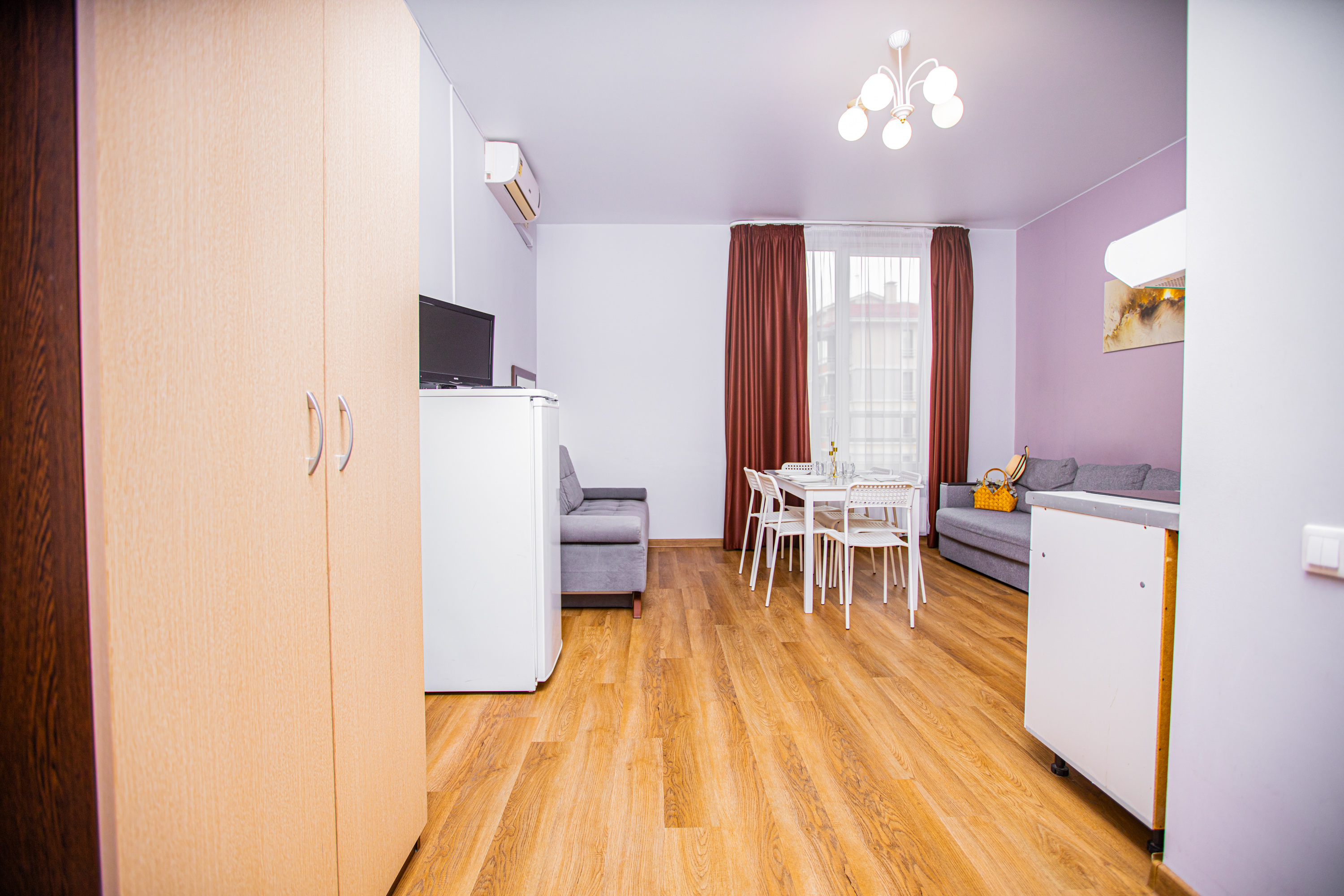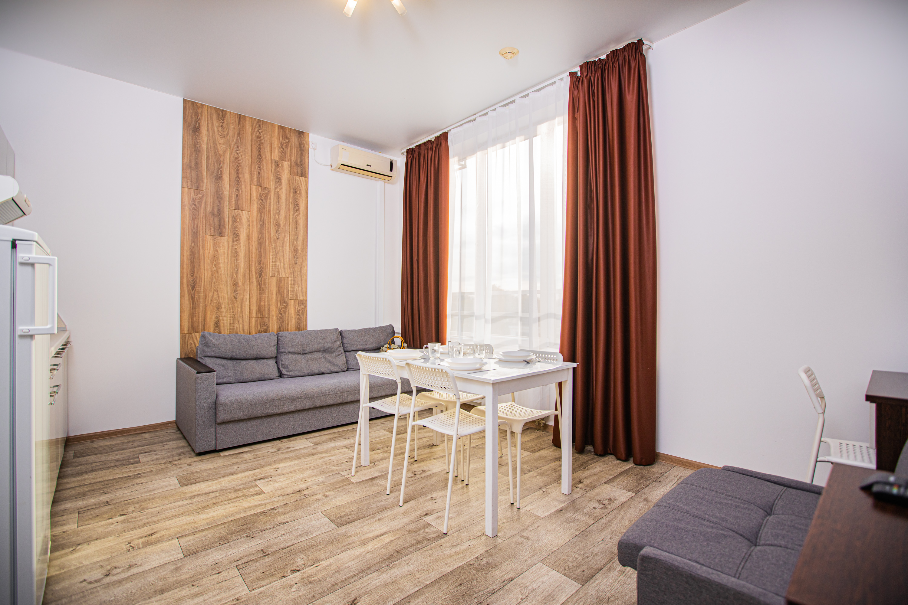 В 3 километрах находится российско-абхазская граница, а в 8 — железнодорожный вокзал, откуда на ласточке легко добраться до курорта Красная Поляна. Пятиэтажный корпус, в котором разместились Апартаменты, возвышается на первой береговой линии. В номерах дизайнерский интерьер и есть все необходимое для комфортного пребывания. Все Апартаменты оснащены индивидуальным санузлом с ванной, собственной кухней, оборудованной посудой и бытовой техникой, также в номерах есть кондиционер, плазменный телевизор, а ванных комнатах — фен и наборы косметических принадлежностей для гостей.В распоряжении отдыхающих открытый бассейн, по периметру которого организована зона отдыха с шезлонгами. Для автовладельцев доступна охраняемая парковка.В 5 минутах ходьбы находится один из лучших пляжей Сочи. Галечный пляж хорошо оборудован: на побережье установлены навесы и пляжные зонтики от солнца, есть раздевалки, лежаки, различные водные развлечения как для взрослых, так и для детей.