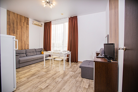 В номере: вешалка, диван, зеркало, кровать двуспальная, кухонная мебель, прикроватные тумбочки, стол, стулья, шкаф встроенный, гладильная доска, микроволновая печь, набор посуды, плита электрическая, сплит-система, стиральная машина, телевизор ЖК, утюг, холодильник, чайный набор посуды, электрочайник