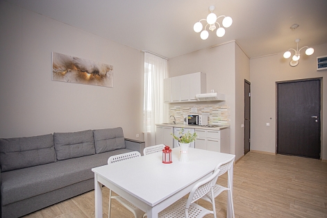 В номере: диван, кресло, кресло-кровать, кровать двуспальная, кухонная мебель, прикроватные тумбочки, стол, столик журнальный, стулья, шкаф встроенный, гладильная доска, микроволновая печь, набор посуды, плита электрическая, сплит-система, стиральная машина, телевизор ЖК, утюг, холодильник, электрочайник