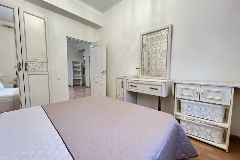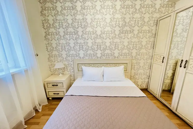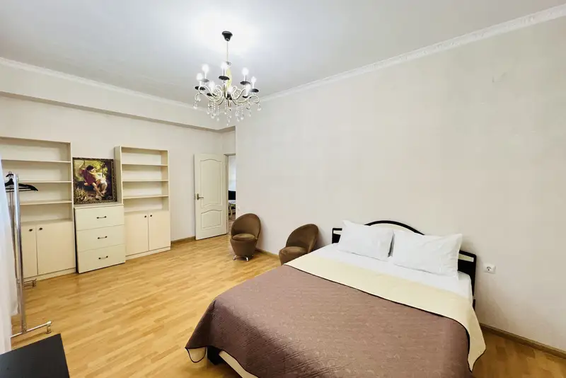 В номере: вешалка, диван, зеркало, кресла, кровать двуспальная, стол, столик туалетный, стулья, духовой шкаф, кондиционер, микроволновая печь, плита газовая, телевизор, холодильник, электрочайник