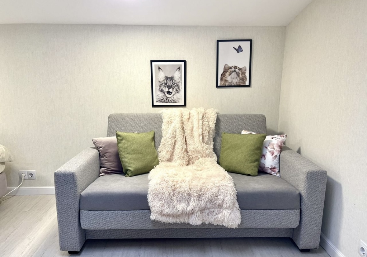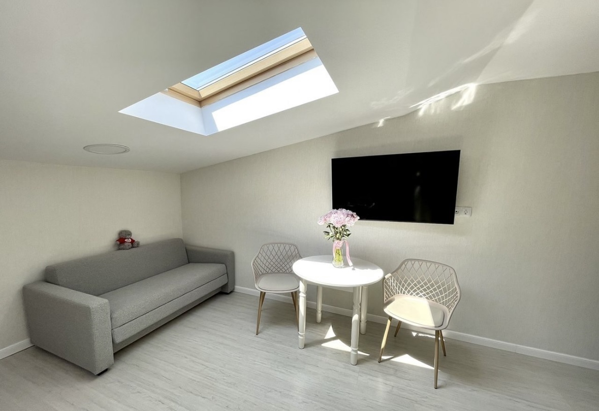 В номере: диван раскладной, кровать двуспальная, стол, стулья, гладильная доска, кондиционер, набор посуды, стиральная машина, сушилка для белья, телевизор, утюг, холодильник, чайник