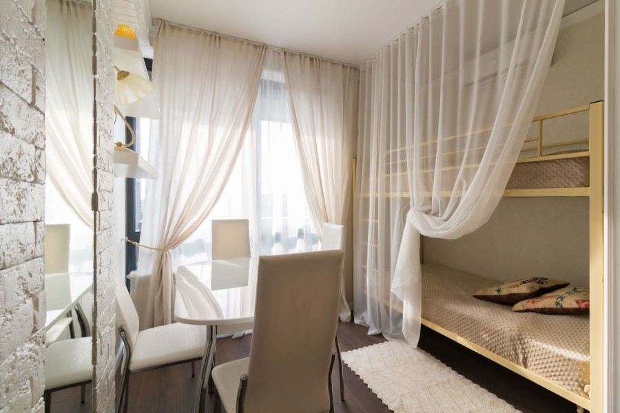 В номере: вешалка, диван, зеркало, кровать двухъярусная, стол, стулья, шкаф, духовой шкаф, микроволновая печь, набор посуды, плита электрическая, сплит-система, стиральная машина, телевизор, холодильник, электрочайник