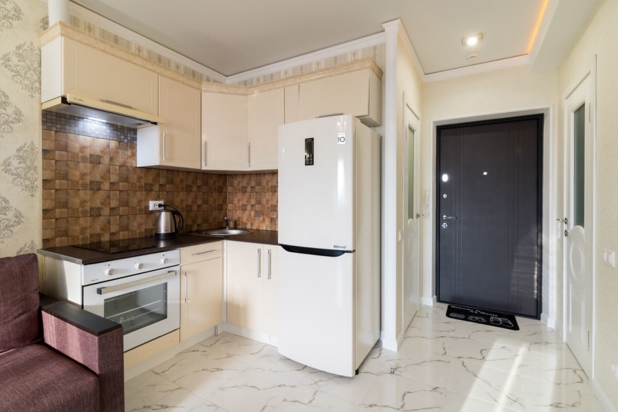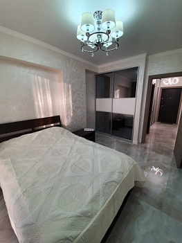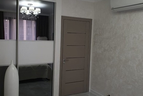 В номере: вешалка, зеркало, кровать двуспальная, прикроватные тумбочки, стол, стулья, шкаф, духовой шкаф, микроволновая печь, набор посуды, плита электрическая, сплит-система, стиральная машина, телевизор, холодильник, электрочайник