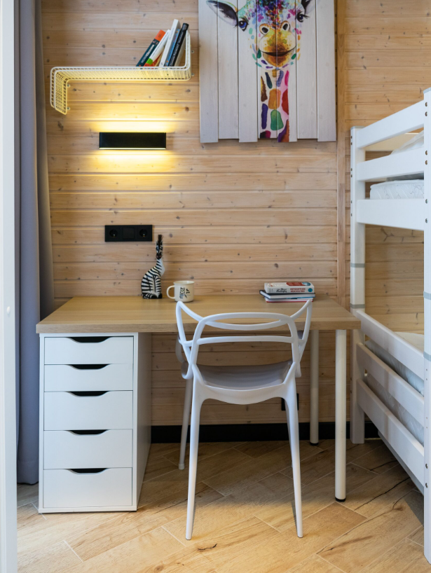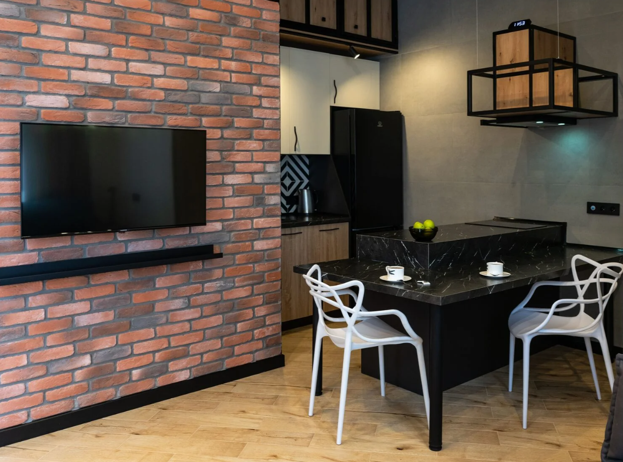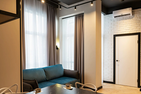В номере: вешалка, диван, зеркало, кровать двухъярусная, стол, стулья, шкаф, гладильная доска, микроволновая печь, набор посуды, плита электрическая, посудомоечная машина, сплит-система, стиральная машина, телевизор, утюг, холодильник, электрочайник