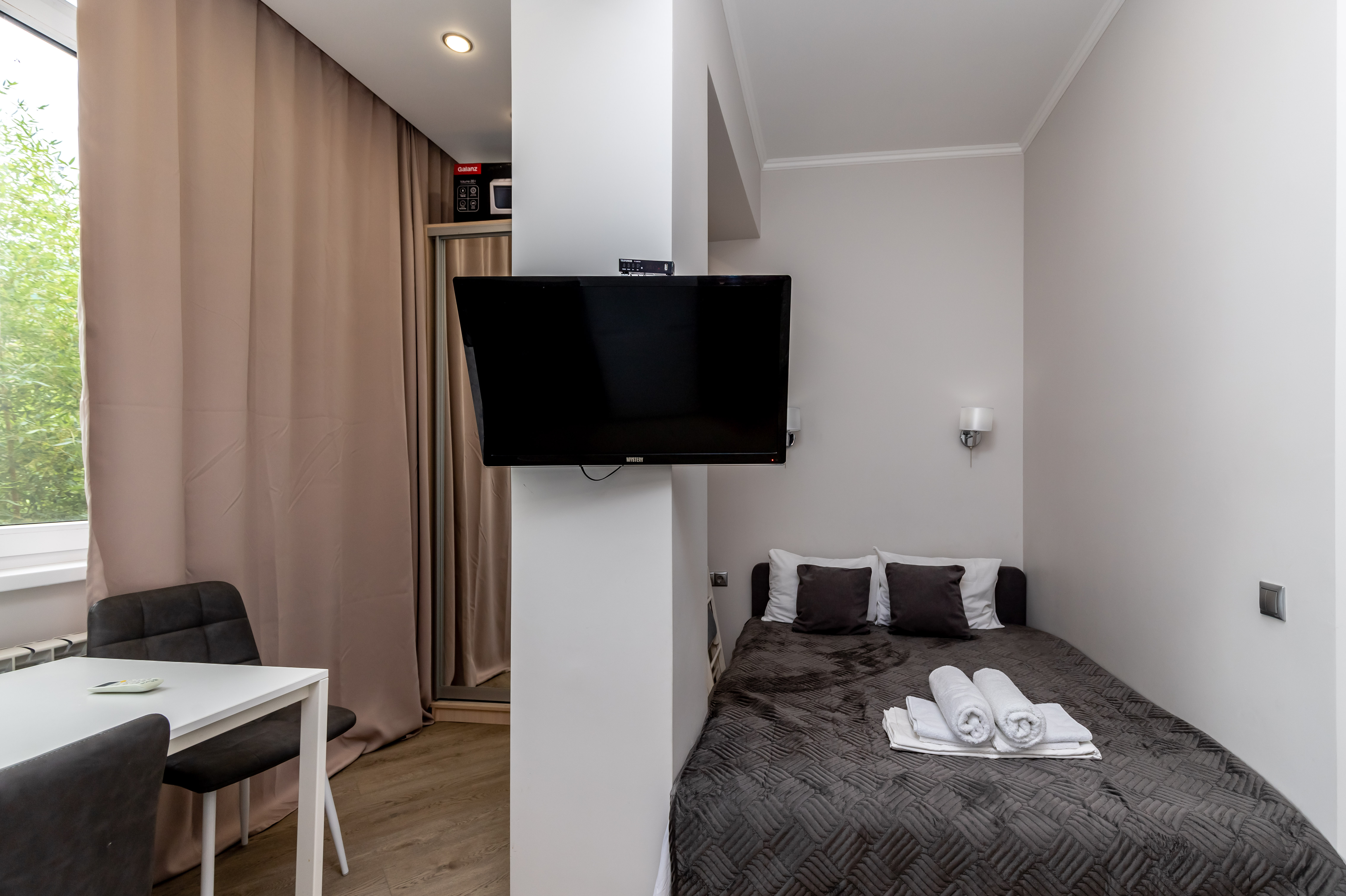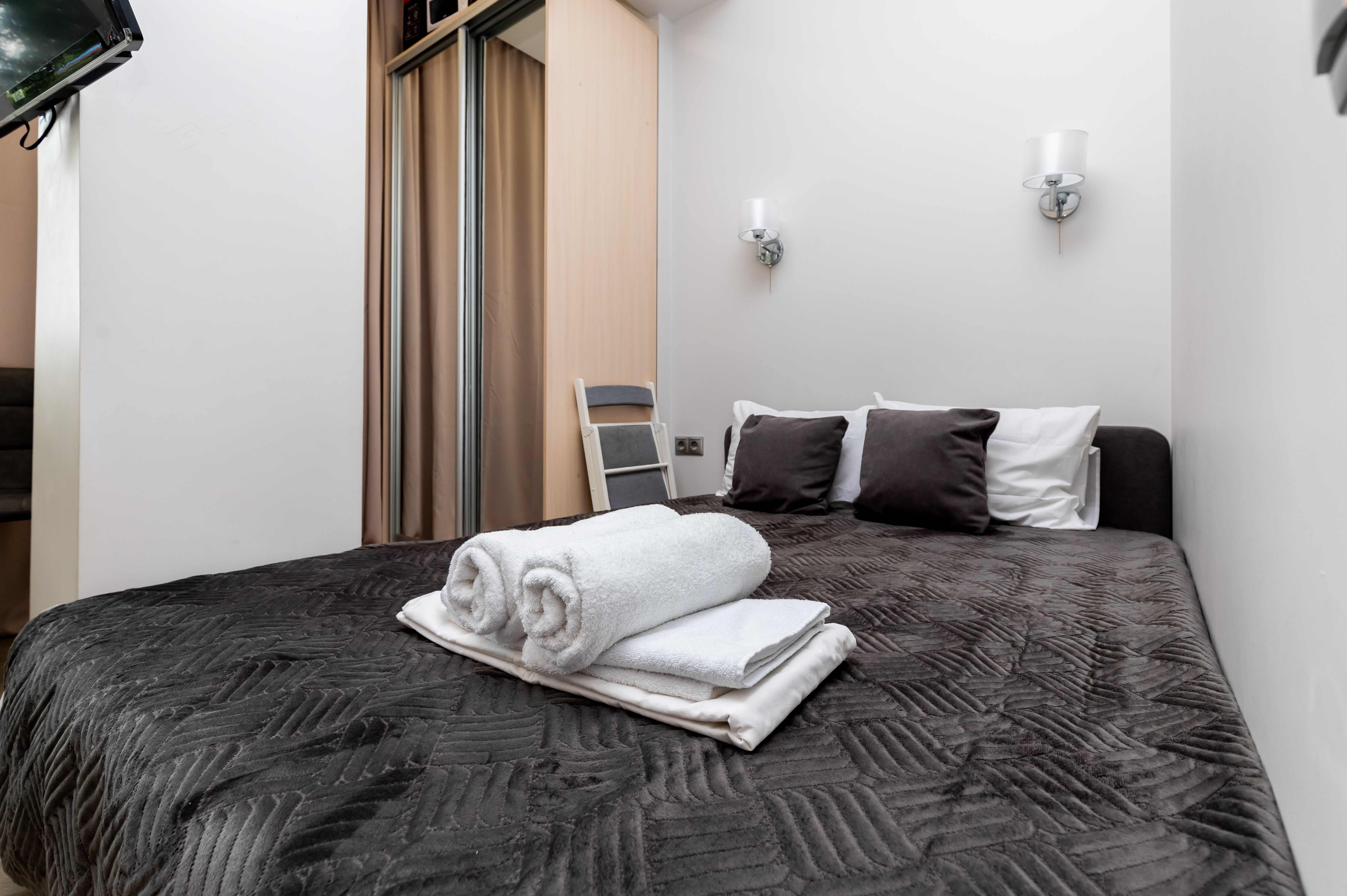 В номере: вешалка, диван, зеркало, кровать двуспальная, кровать двухъярусная, стол, стулья, шкаф, гладильная доска, мини-холодильник, набор посуды, сплит-система, стиральная машина, телевизор ЖК, утюг, электрочайник