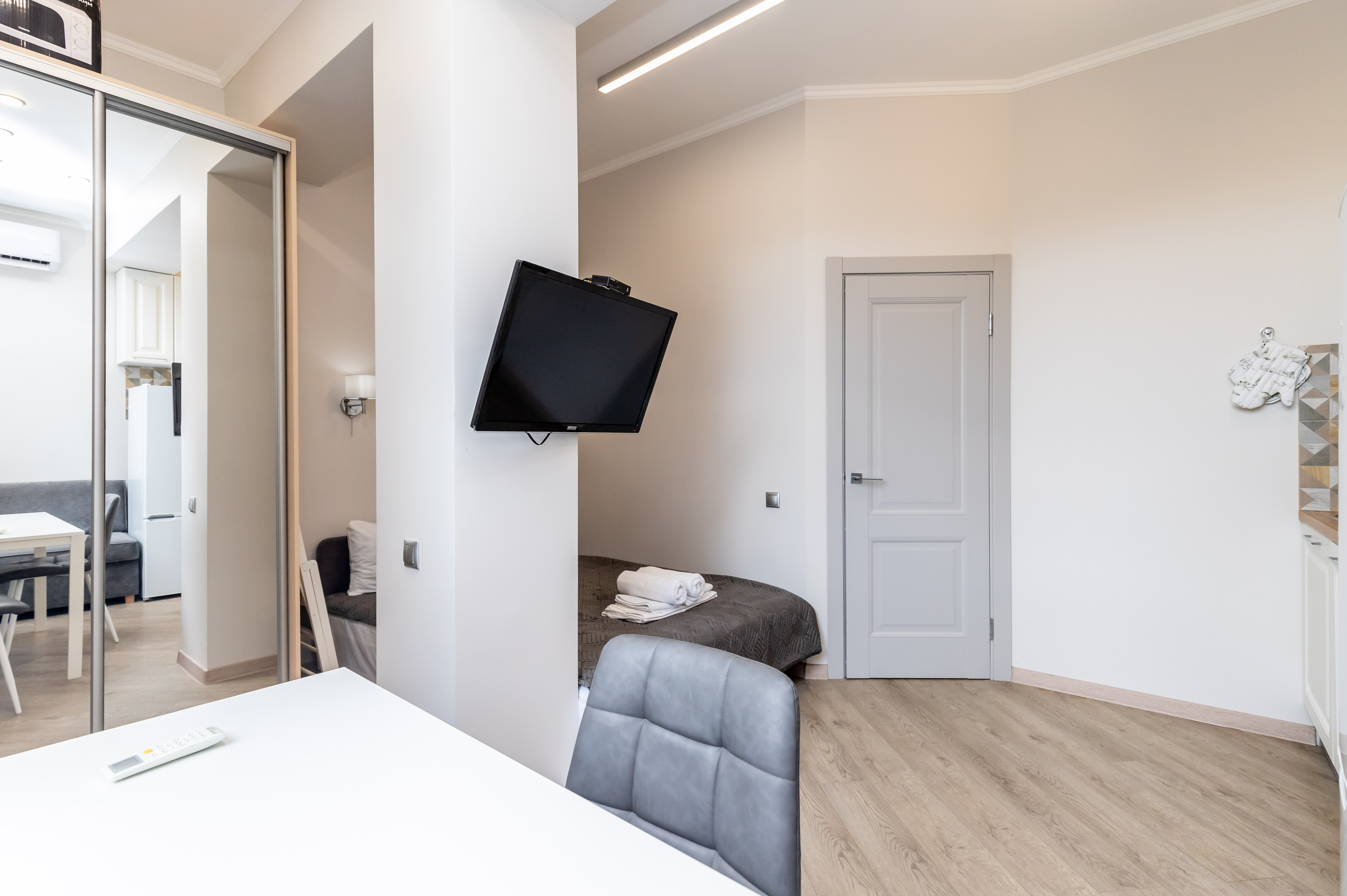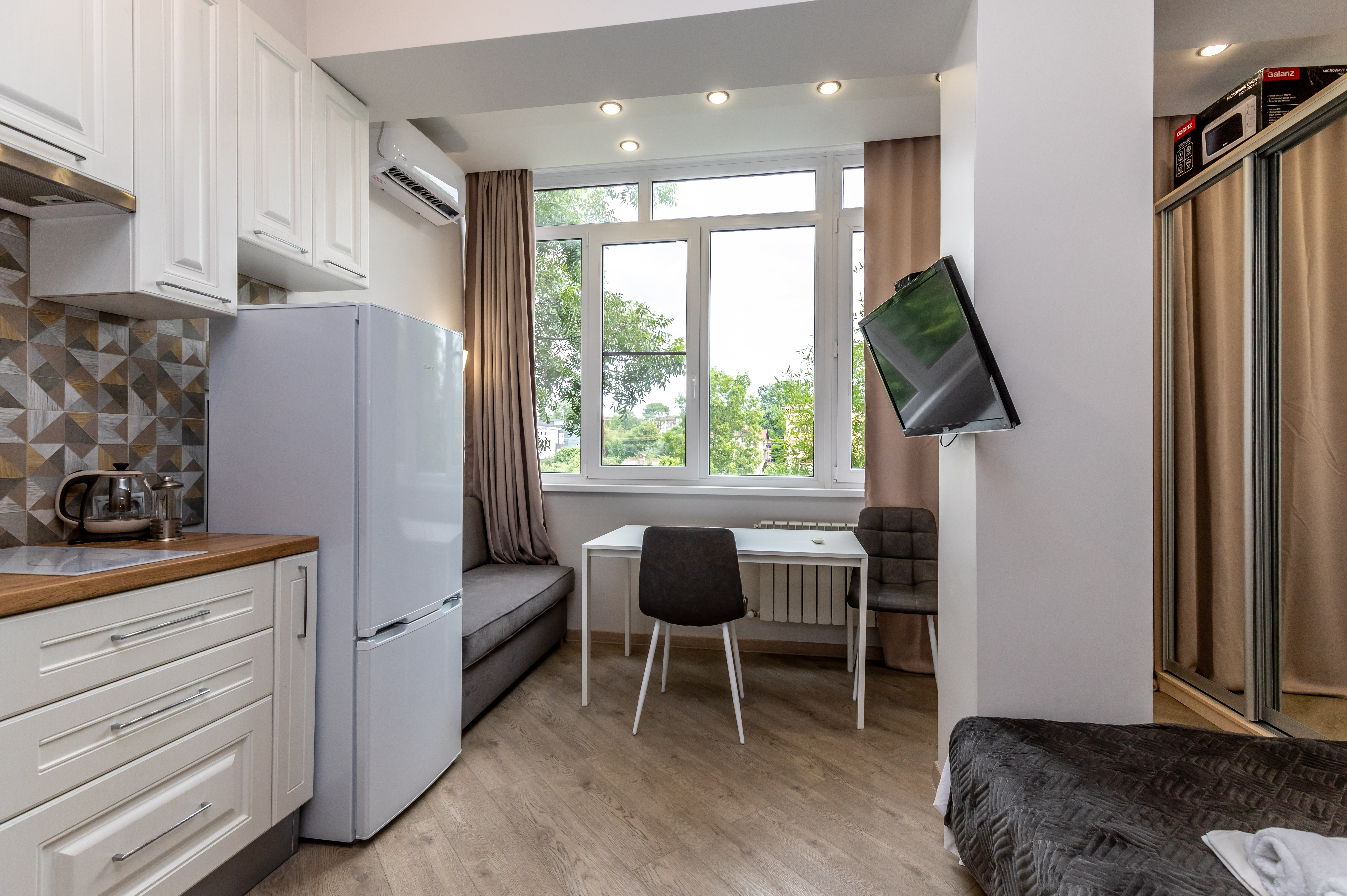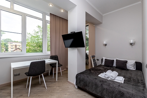 Дизайн выполнен в современном стиле, что позволяет создать уютную и комфортную атмосферу для проживания. Мебель в комнатах изготовлена из качественных материалов и имеет стильный дизайн, который идеально сочетается с общим интерьером апартаментов. К услугам гостей телевизор, кондиционер, высокоскоростной интернет, стиральная машина. Санузел с душем. Кухонная зона оборудована всем необходимым для приготовления и хранения пищи. Здесь есть плита, холодильник, микроволновая печь, чайник, посуда и столовые приборы. Личный транспорт можно оставить на парковке возле дома.