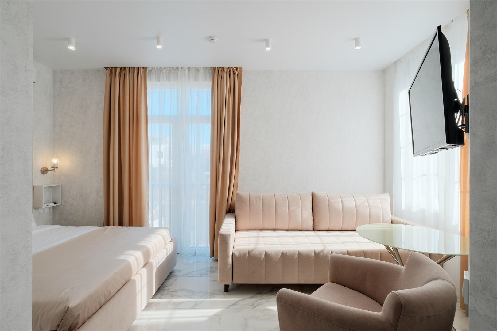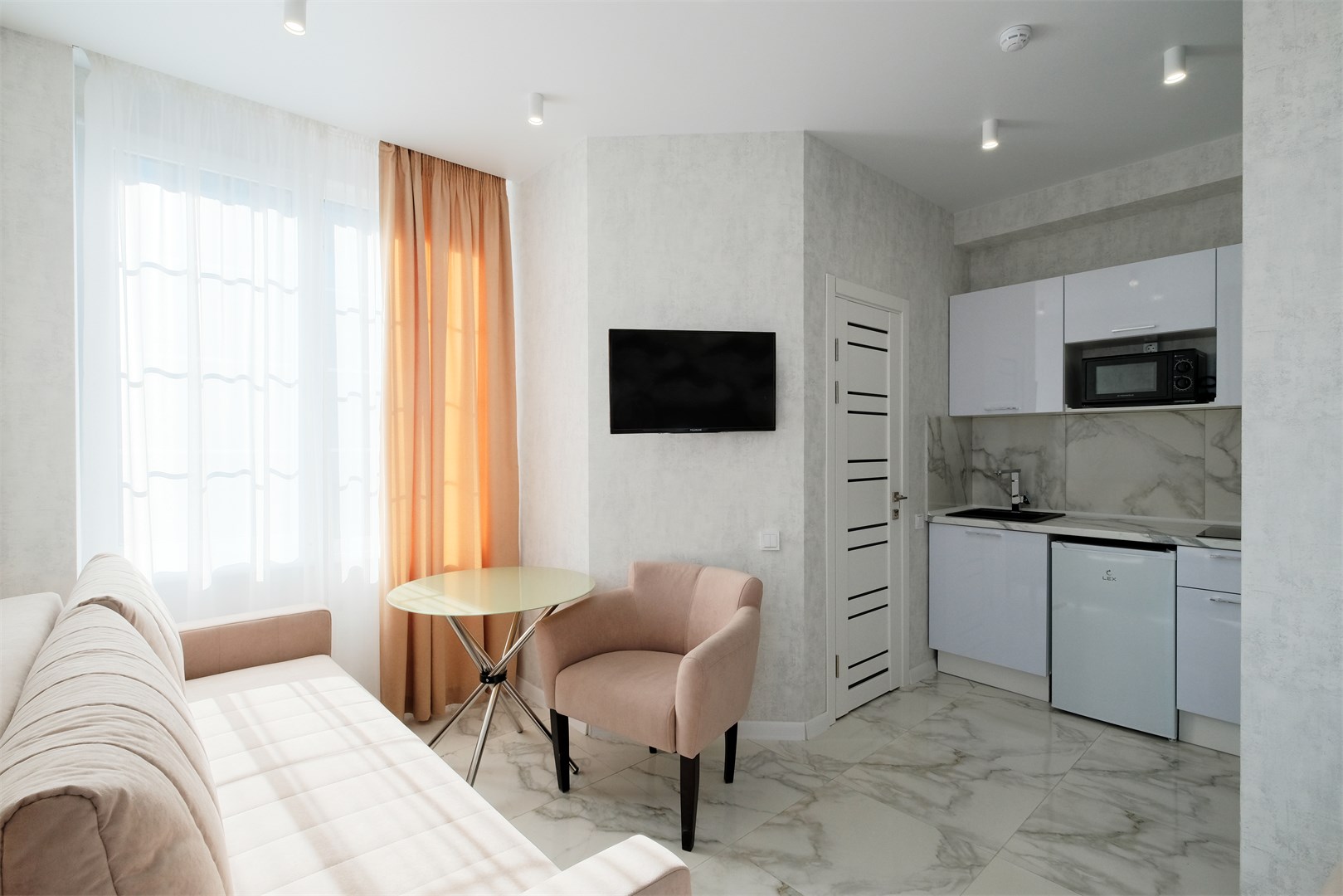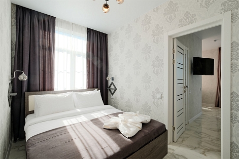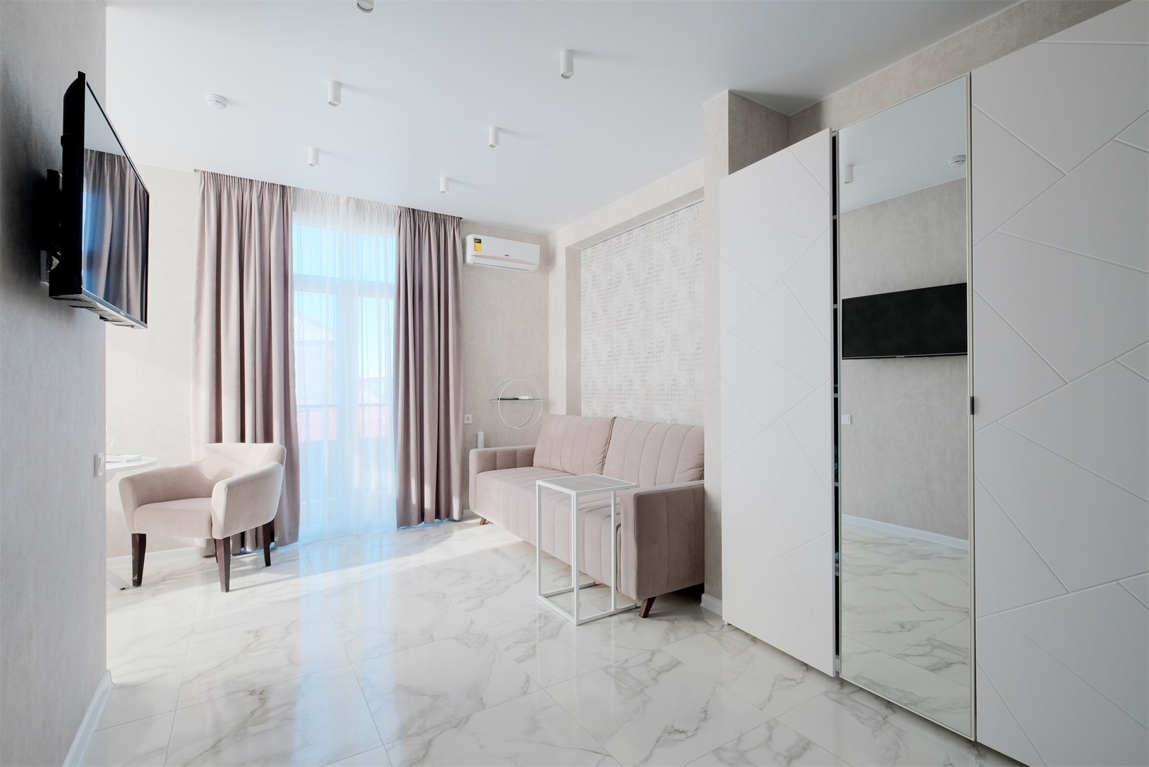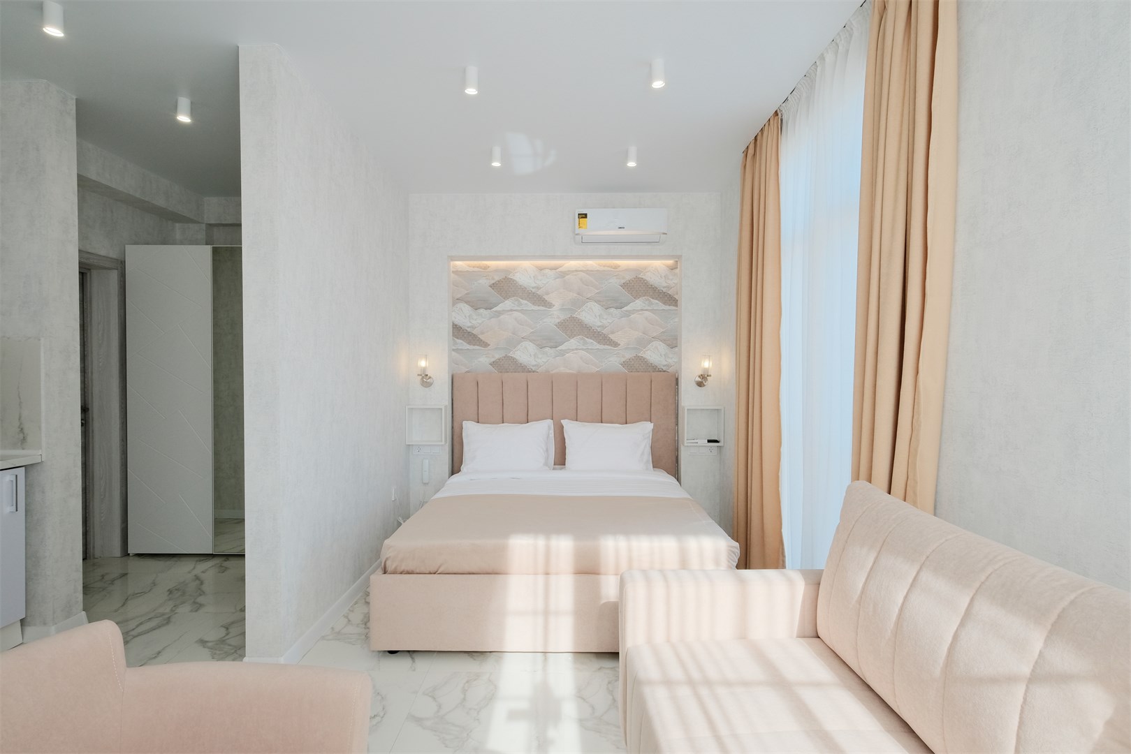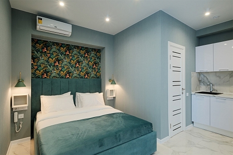 В номере: вешалка, зеркало, кресла, кровать двуспальная, стол, шкаф, кондиционер, набор посуды, плита электрическая, телевизор ЖК, холодильник, электрочайник