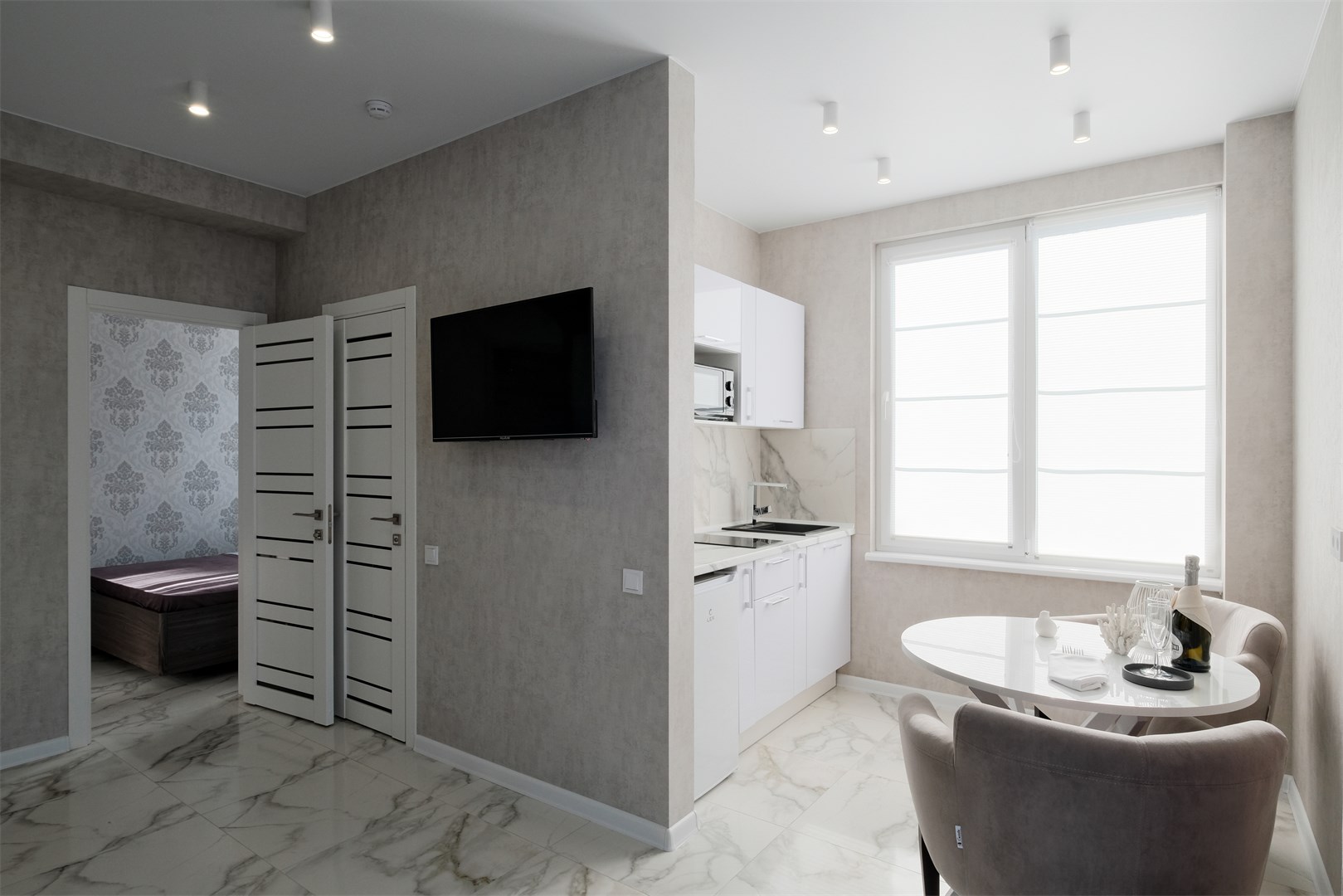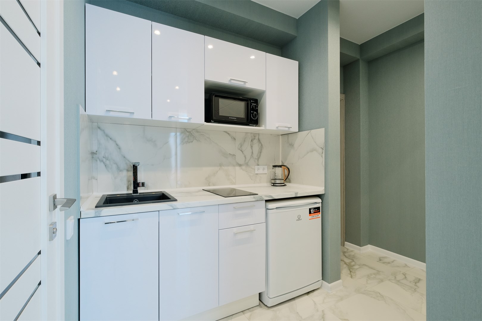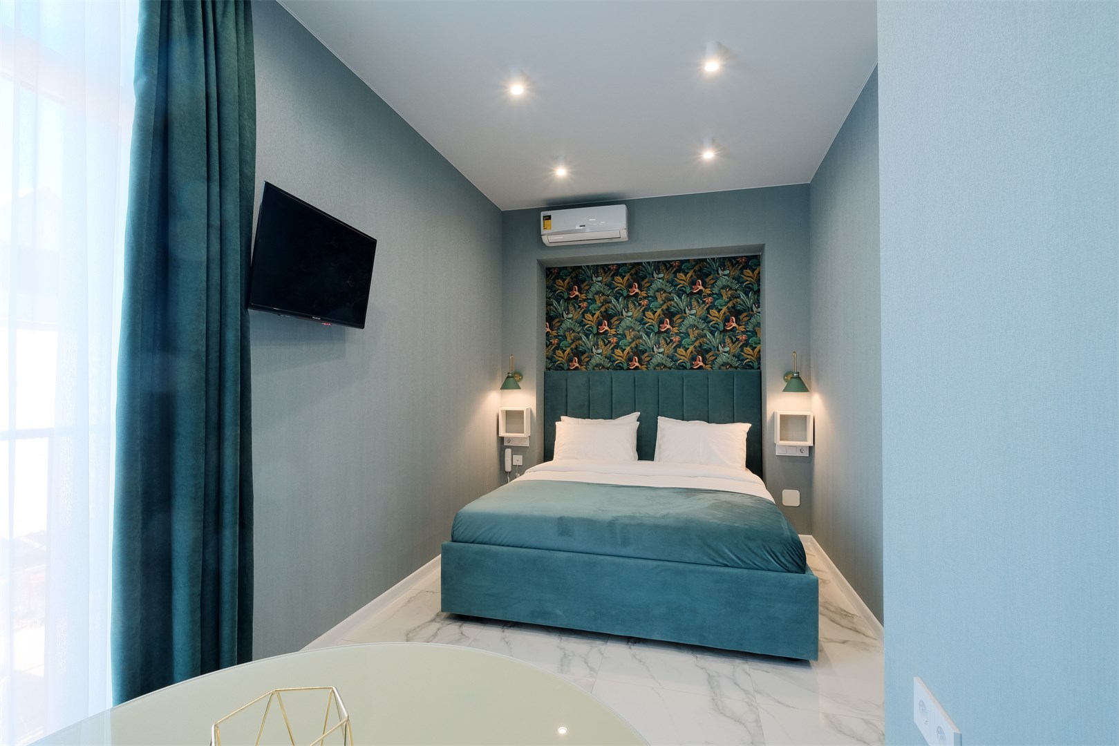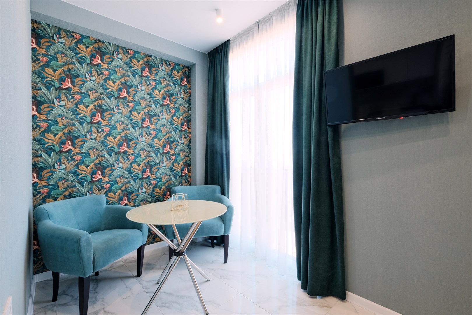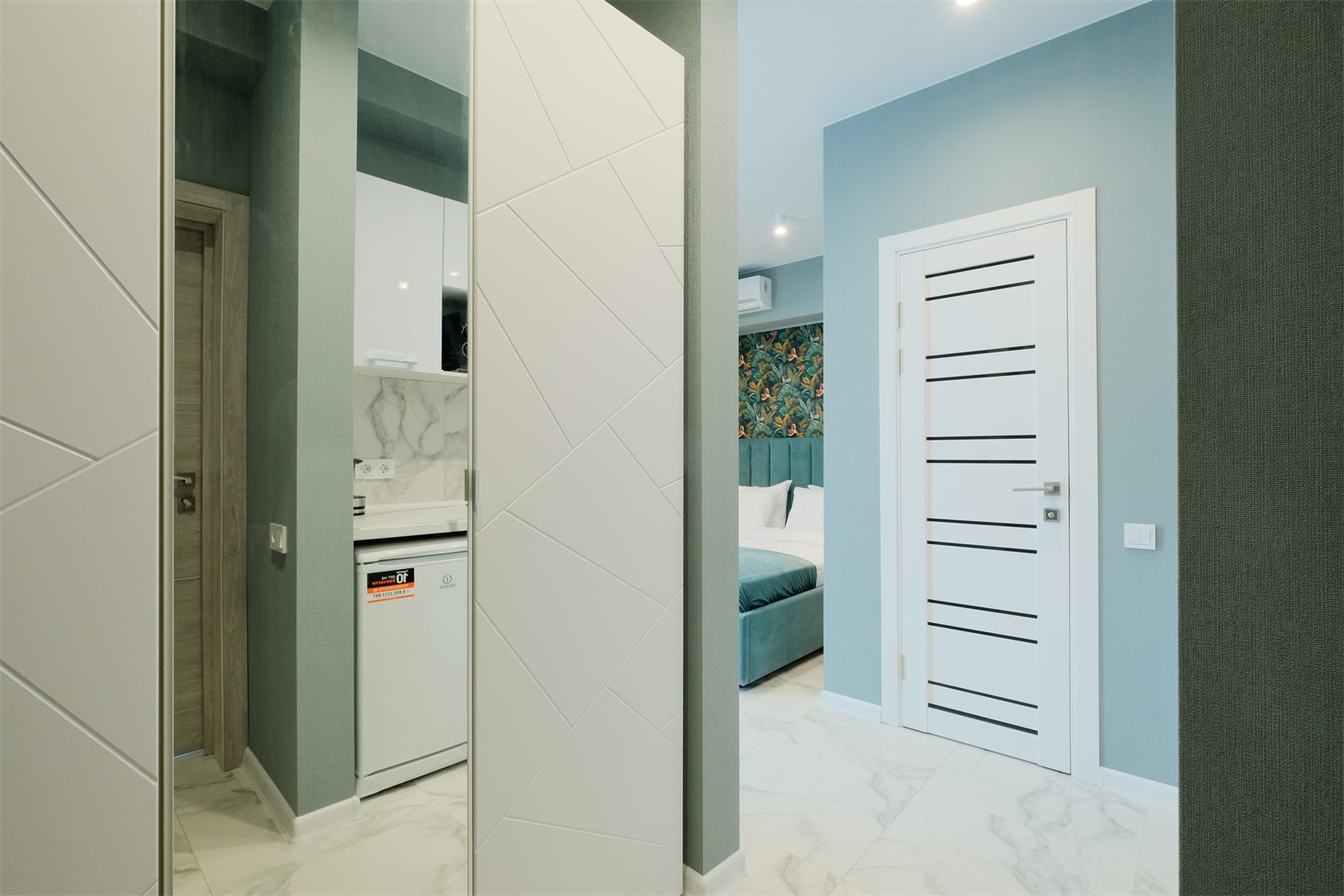 В номере: вешалка, зеркало, кресла, кровать двуспальная, стол, шкаф, кондиционер, набор посуды, плита электрическая, телевизор ЖК, холодильник, электрочайник