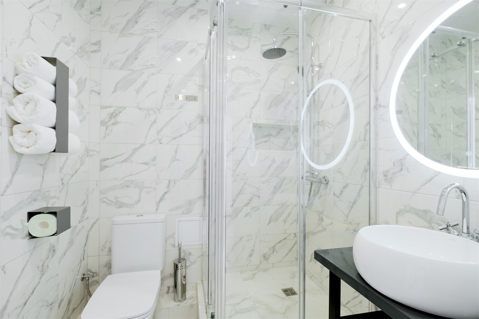 Санузел: с душевой кабиной, тапочки, туалетные принадлежности, фен, халат