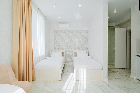 В номере: вешалка, зеркало, кресла, кровати односпальные, стол, шкаф, кондиционер, набор посуды, плита электрическая, телевизор ЖК, холодильник, электрочайник