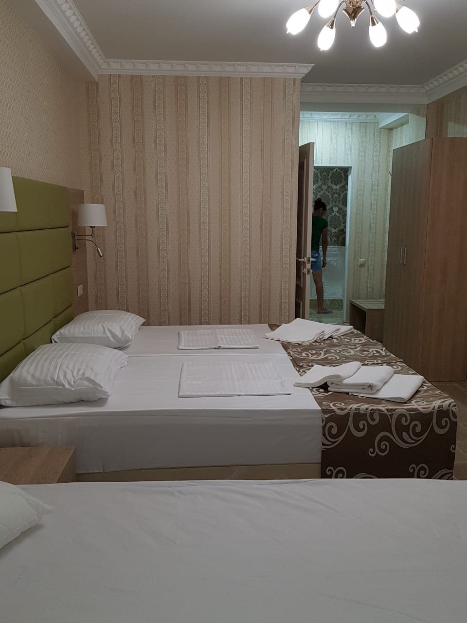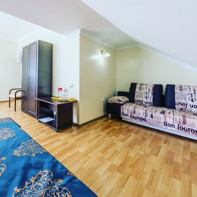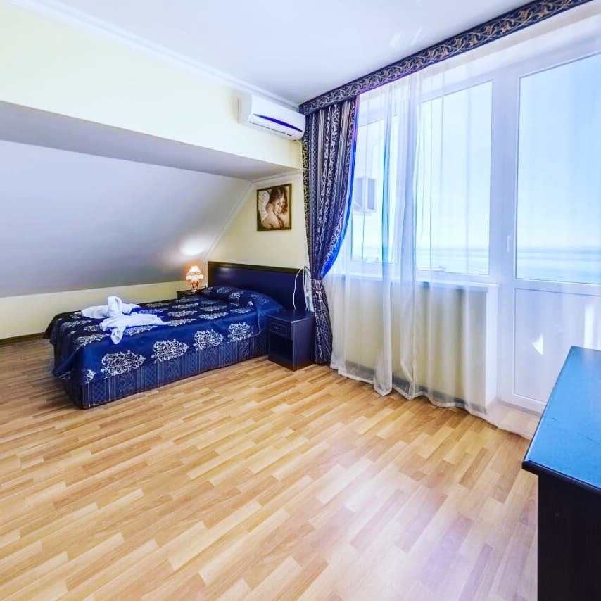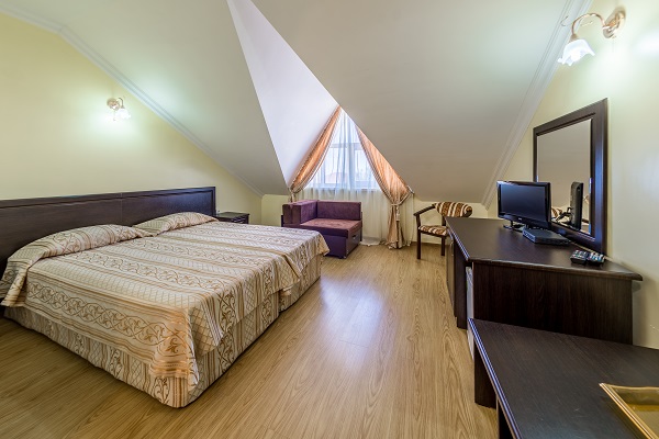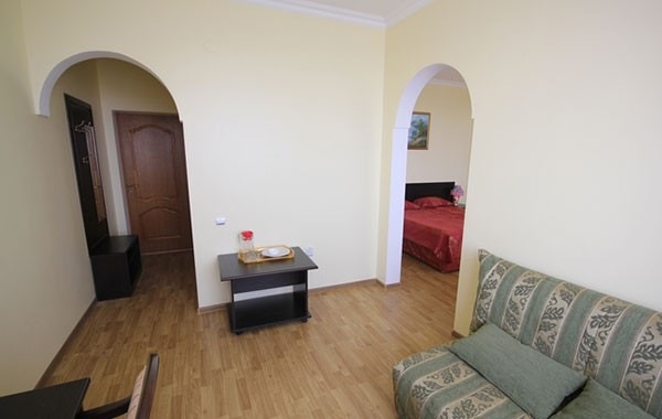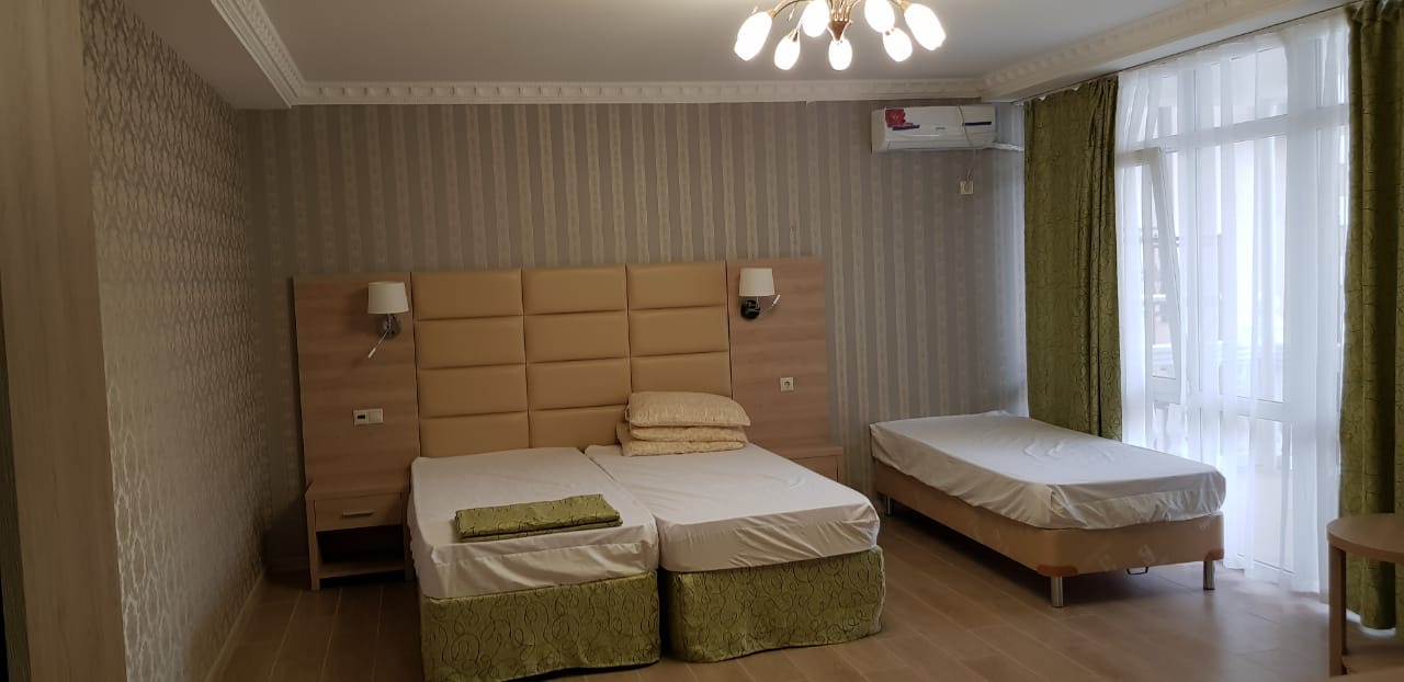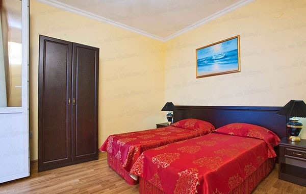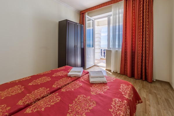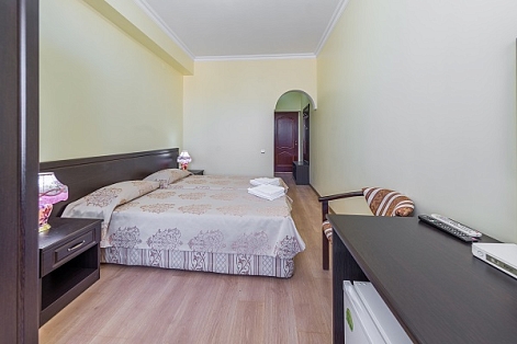 В номере: диван, кровати односпальные /одна двуспальная кровать, прикроватные тумбочки, стол, стул, шкаф, кондиционер, мини-холодильник, набор посуды, сейф, сплит-система, телевизор