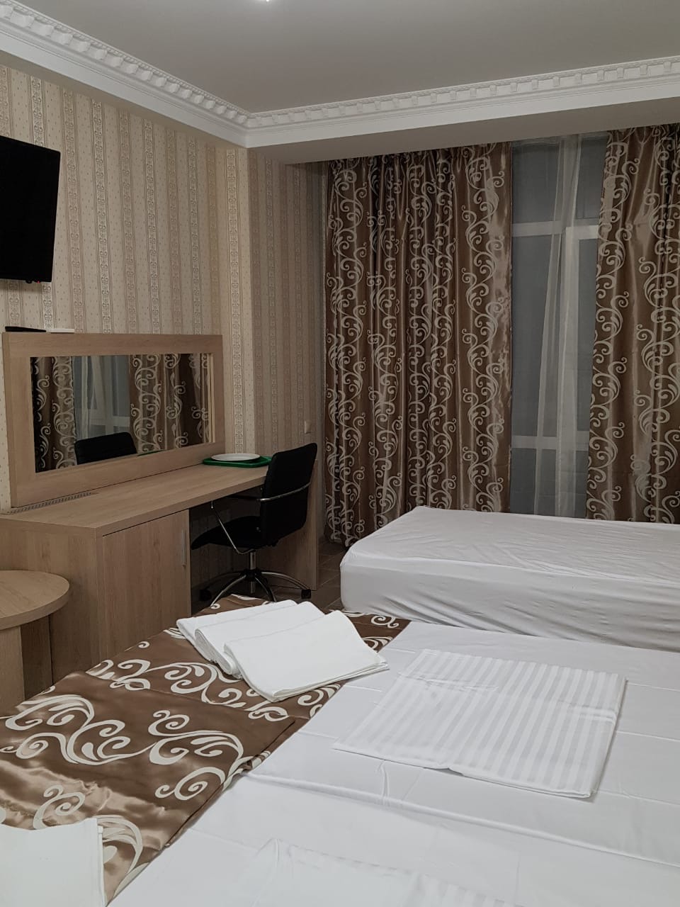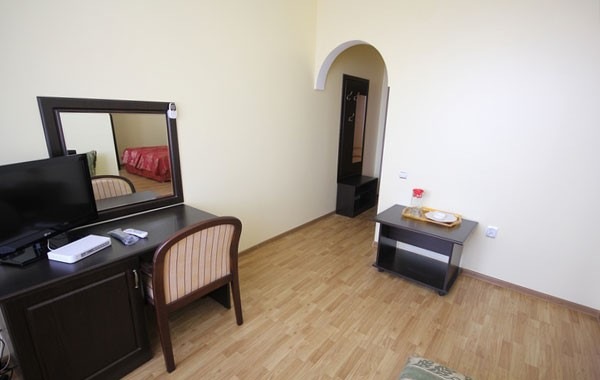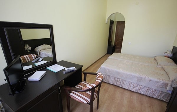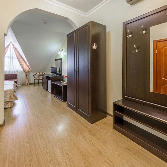 В номере: вешалка, зеркало, кровати односпальные /одна двуспальная кровать, кровать односпальная, прикроватные тумбочки, столик журнальный, столик туалетный, стул, шкаф, кондиционер, мини-холодильник, набор посуды, сейф, сплит-система, телевизор