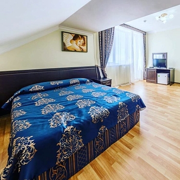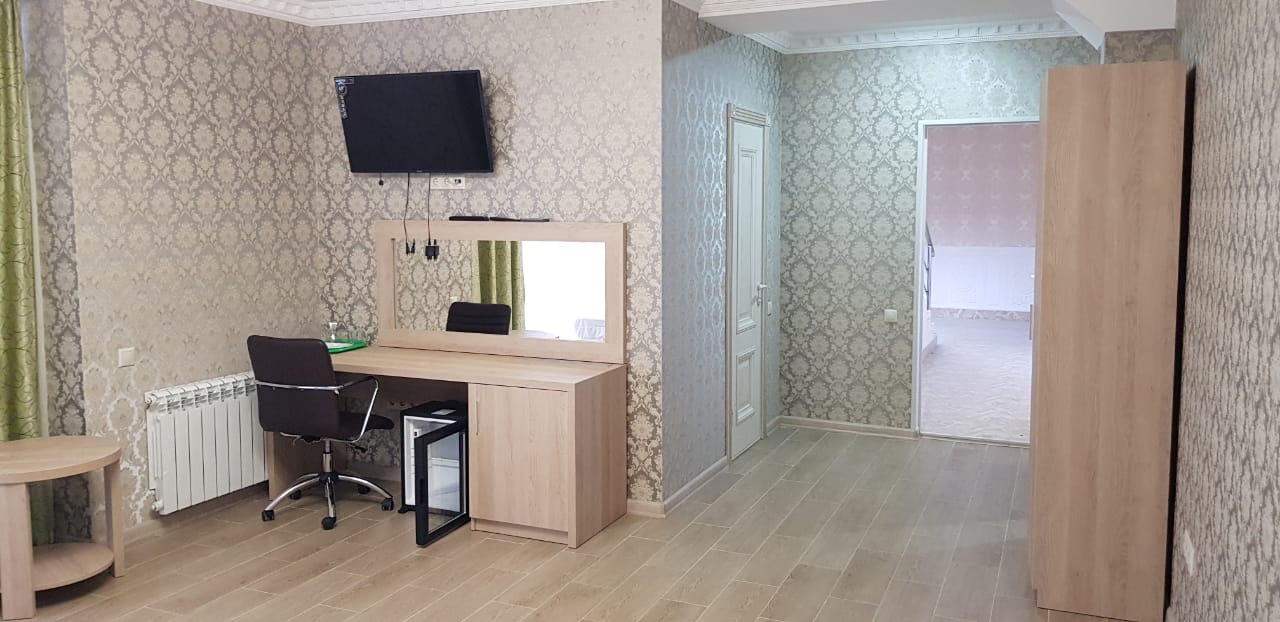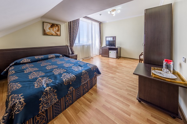 В номере: диван, кровать двуспальная, набор мягкой мебели, прикроватные тумбочки, стол, стул, шкаф, кондиционер, мини-холодильник, набор посуды, сейф, сплит-система, телевизор