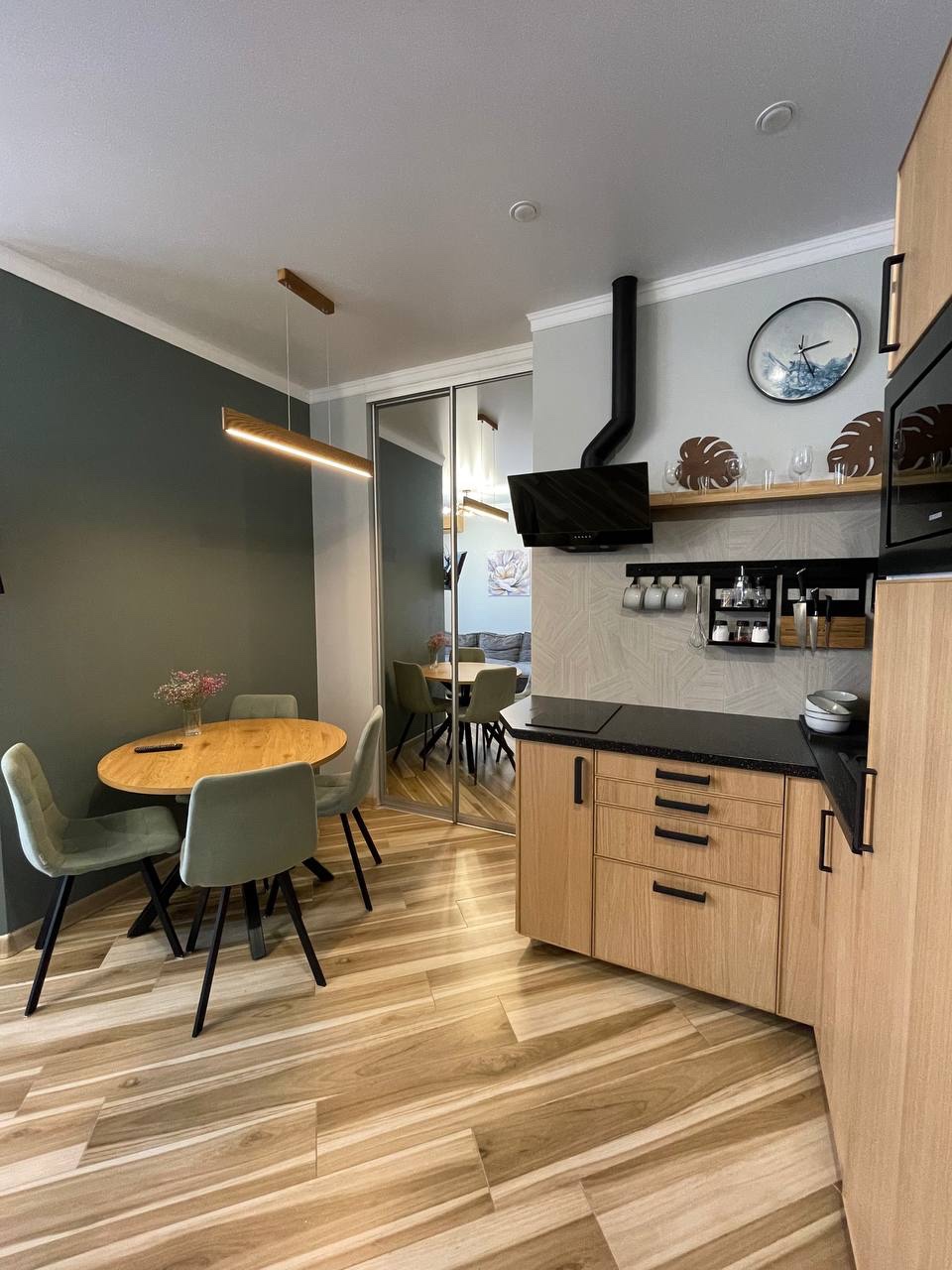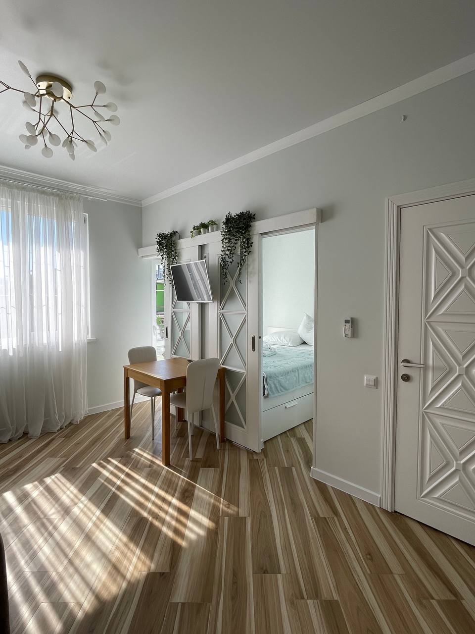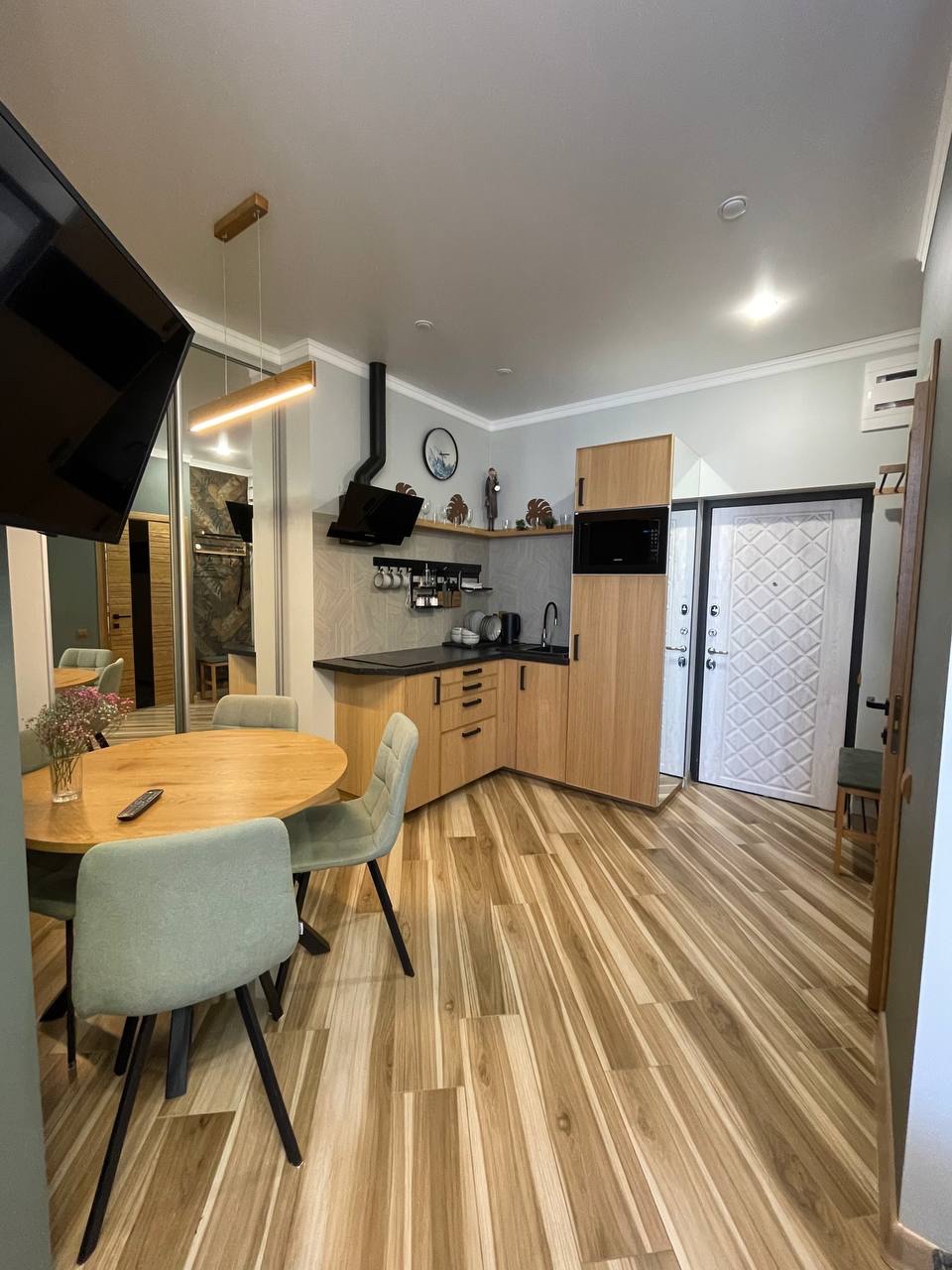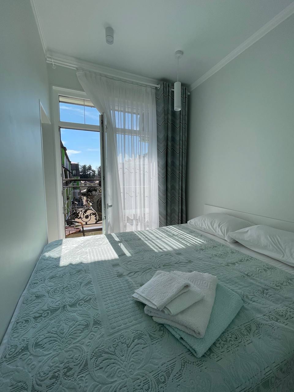 В номере: вешалка, диван раскладной, зеркало, кровать двуспальная, стол, стулья, шкаф встроенный, кондиционер, микроволновая печь, набор посуды, плита электрическая, стиральная машина, телевизор, холодильник, электрочайник