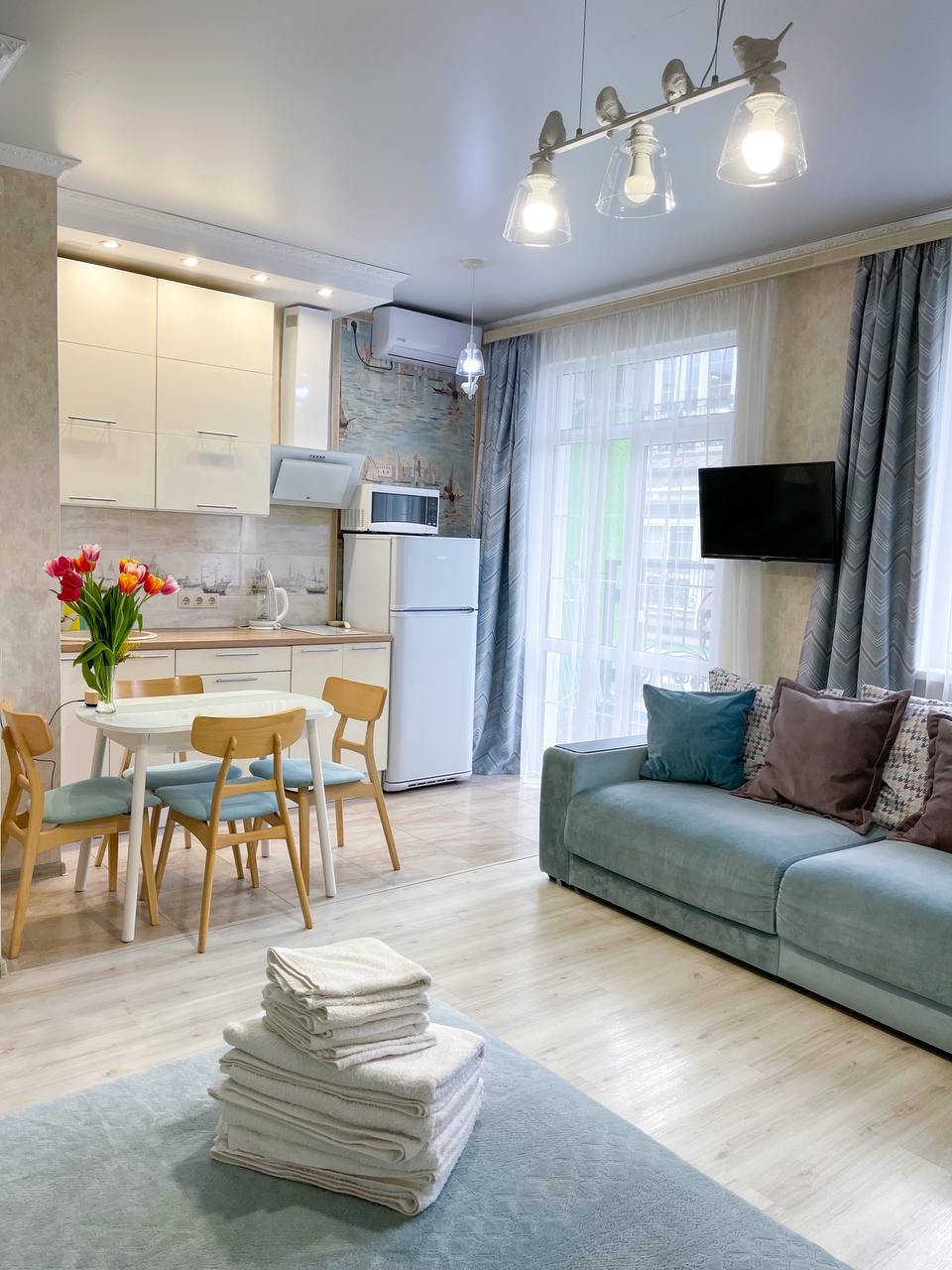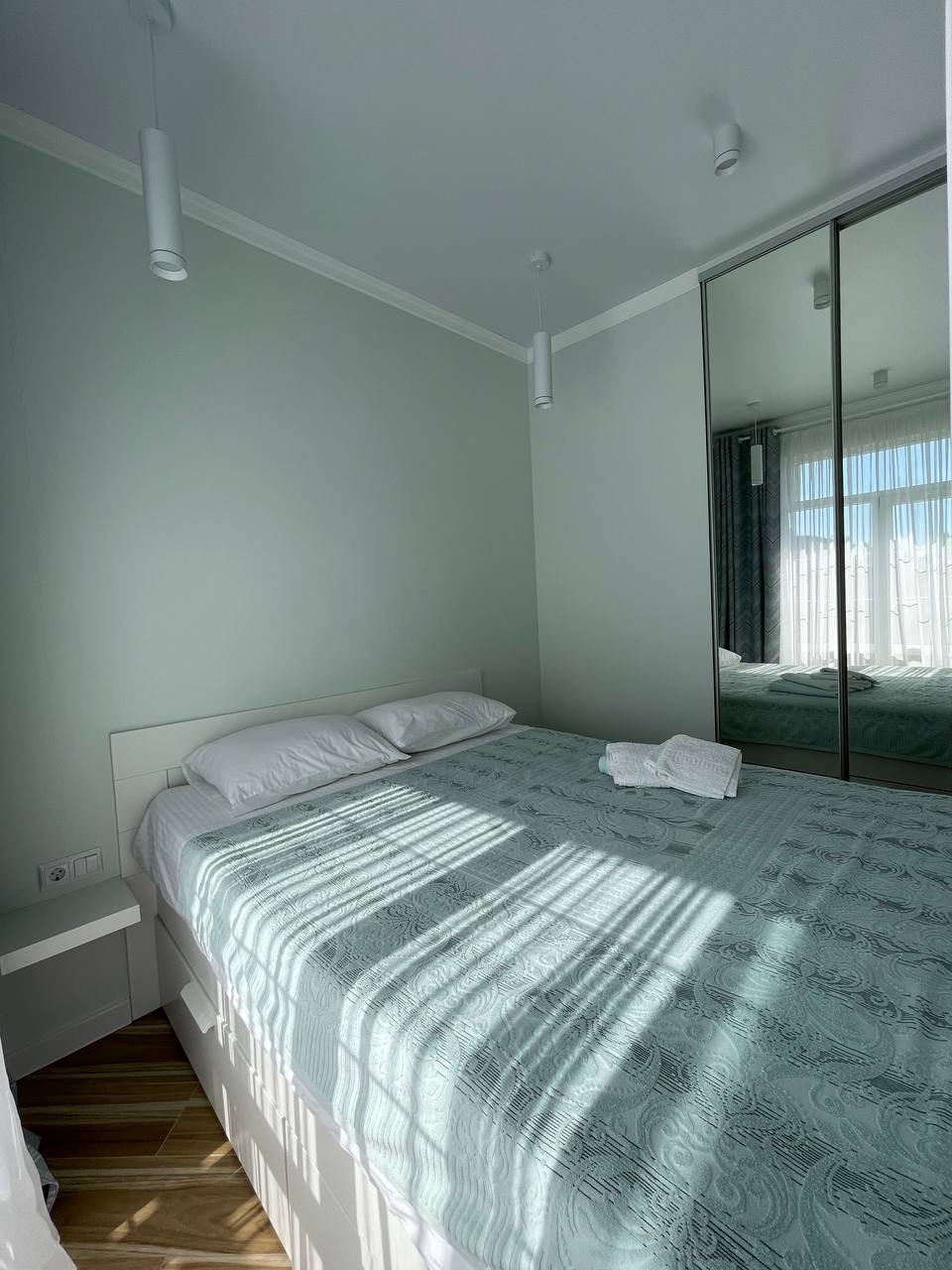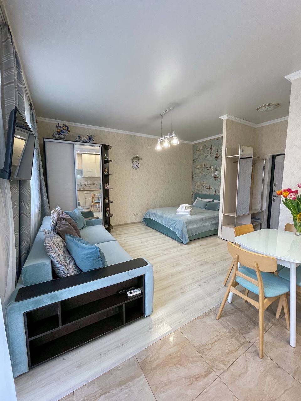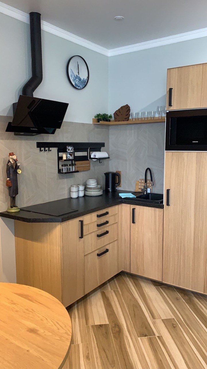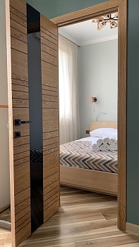 В номере: диван раскладной, зеркало, кровать двуспальная, стол, стулья, шкаф встроенный, кондиционер, микроволновая печь, набор посуды, плита электрическая, стиральная машина, телевизор ЖК, холодильник, электрочайник