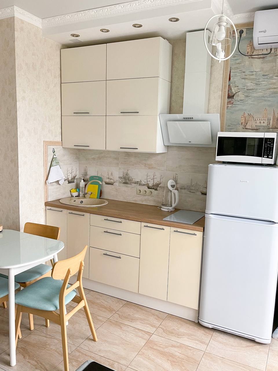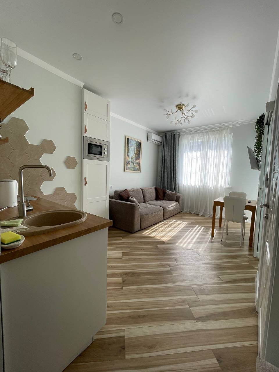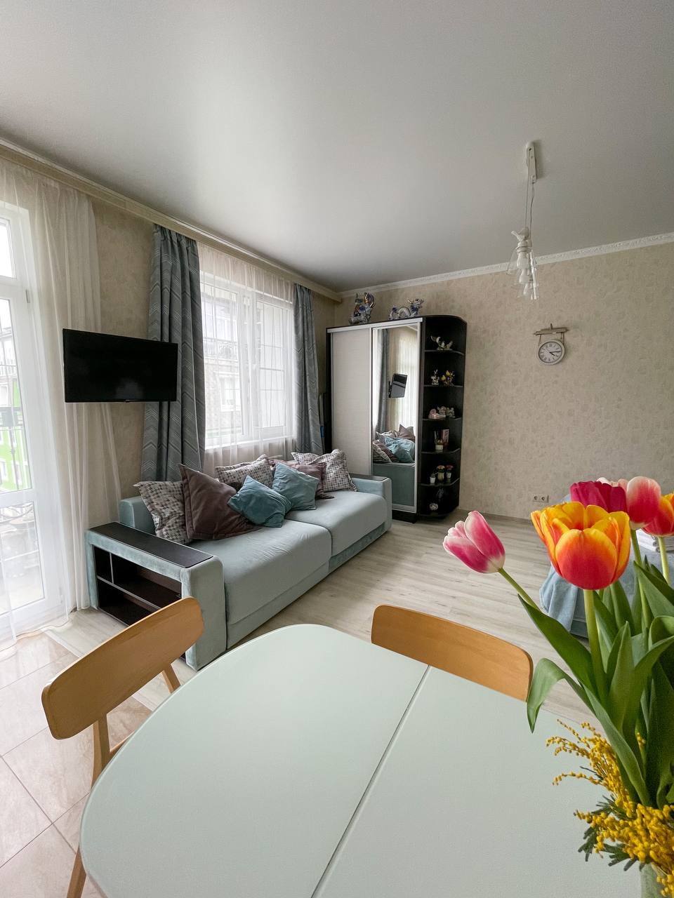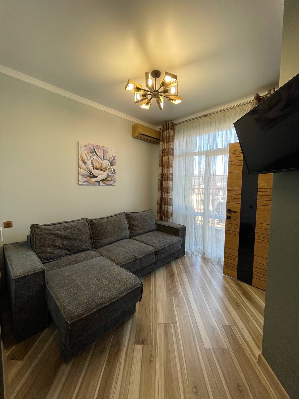 В номере: диван раскладной, зеркало, кровать двуспальная, стол, стулья, шкаф встроенный, кондиционер, микроволновая печь, набор посуды, плита электрическая, стиральная машина, телевизор ЖК, холодильник, электрочайник