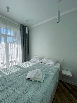 Апартаменты расположились в 5-этажном доме. В комнатах выполнен современный ремонт в светлых оттенках, установлена вся необходимая мебель, есть телевизор, высокоскоростной интернет, кондиционер, стиральная машина. Санузел с душем, полотенцами и туалетными принадлежностями. Кухонная зона оборудована электрической плитой, чайником, микроволновой печью и набором посуды. На свежем воздухе оборудованы игровые площадки для детей. Ближайший пляж галечный, с шезлонгами, навесами, зонтами от солнца, раздевалками и водными развлечениями на любой вкус.