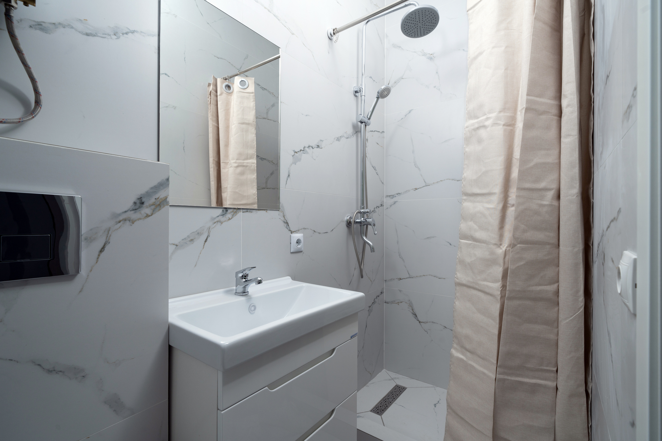 Санузел: с душем, тапочки, туалетные принадлежности, фен, халат