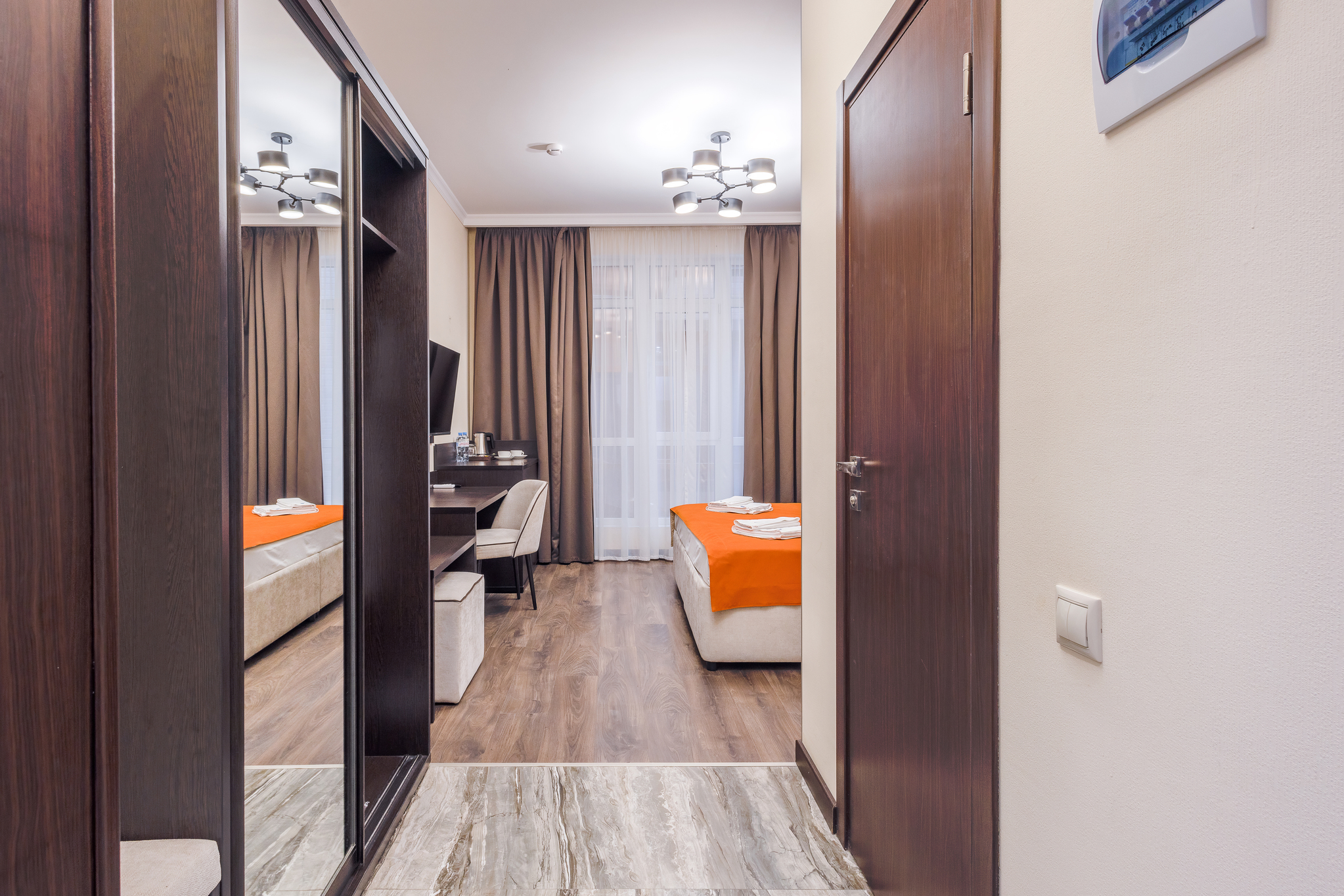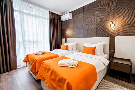 В номере: вешалка, зеркало, кровати односпальные, прикроватные тумбочки, стол, стулья, шкаф, мини-холодильник, сейф, сплит-система, телевизор ЖК, телефон, чайный набор посуды, электрочайник
