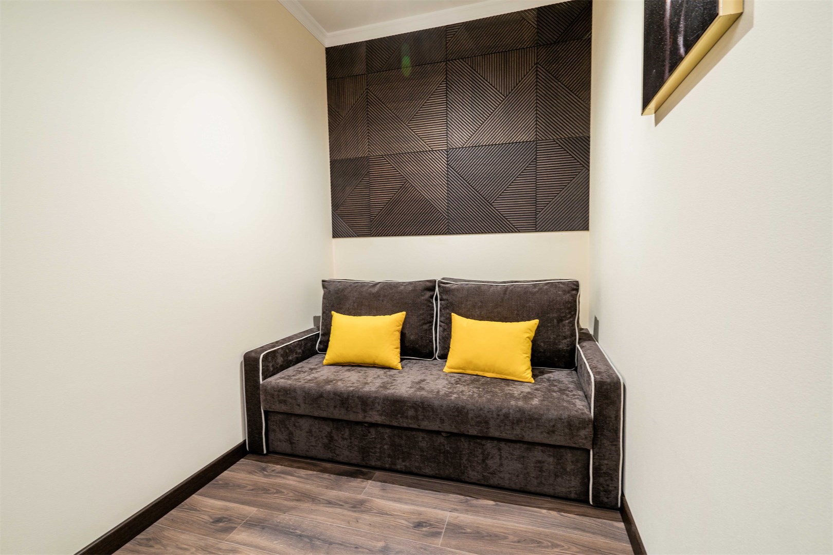 В номере: вешалка, диван раскладной, зеркало, кровать двуспальная, прикроватные тумбочки, раскладушка, стол, стулья, шкаф, мини-холодильник, сейф, сплит-система, телевизор ЖК, телефон, чайный набор посуды, электрочайник