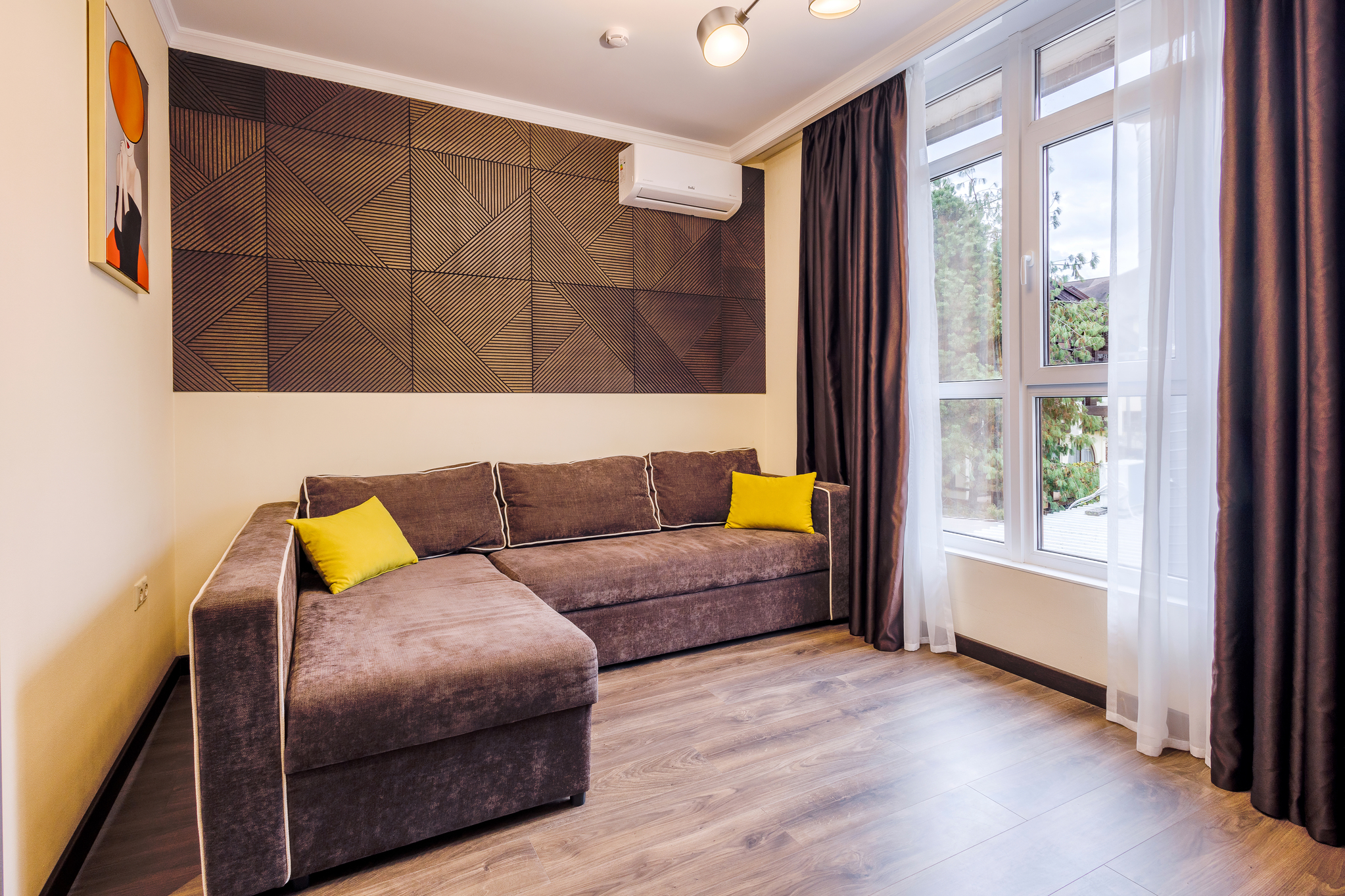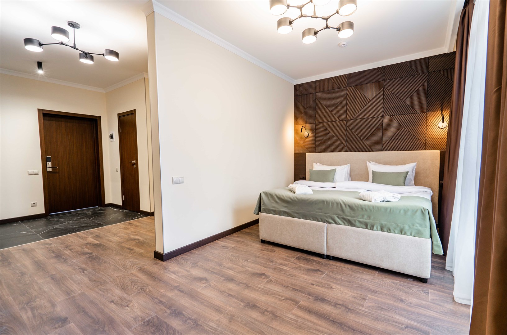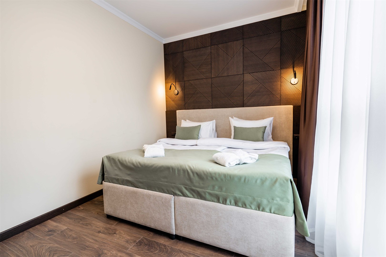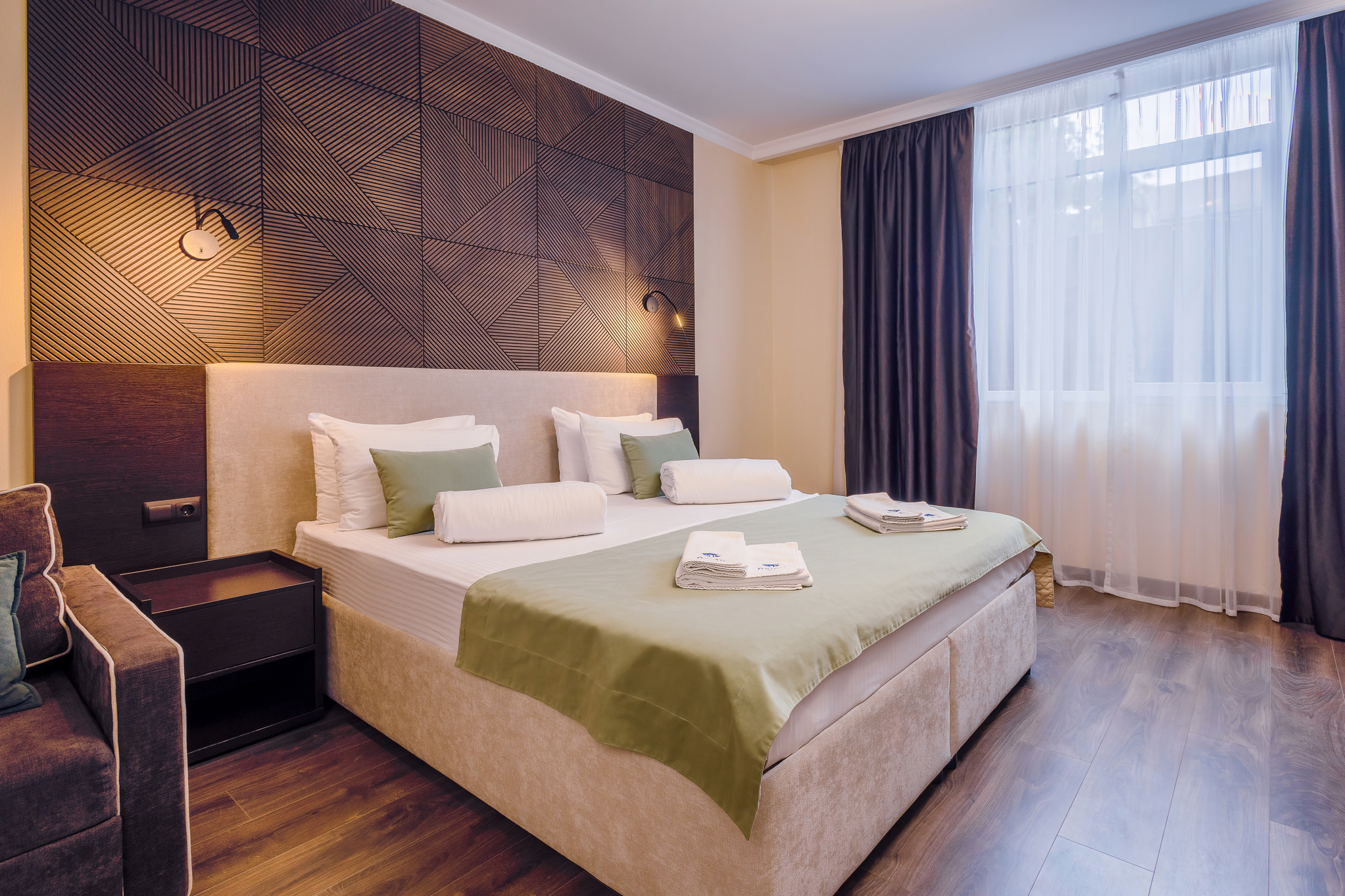 В номере: вешалка, диван раскладной, зеркало, кровать двуспальная, прикроватные тумбочки, стол, столик журнальный, стулья, шкаф, мини-холодильник, сейф, сплит-система, телевизор ЖК, телефон, чайный набор посуды, электрочайник