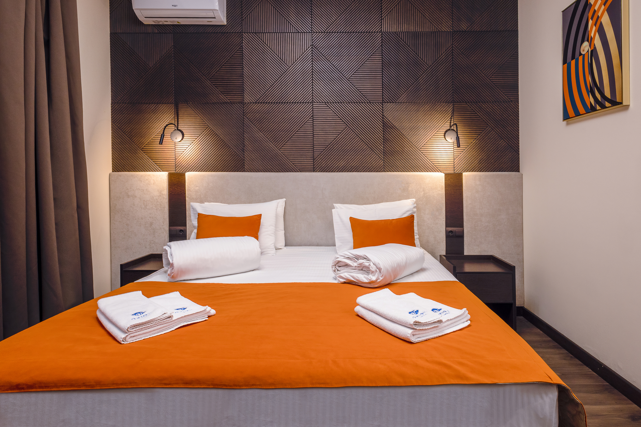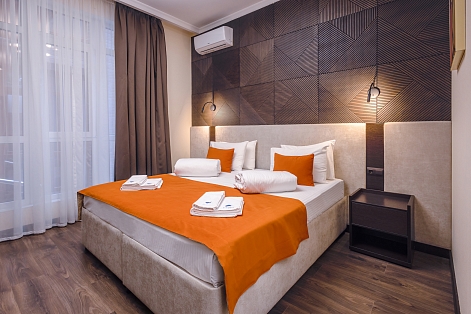 В номере: вешалка, зеркало, кресло-кровать, кровать двуспальная, прикроватные тумбочки, стол, стулья, шкаф, мини-холодильник, сейф, сплит-система, телевизор ЖК, телефон, чайный набор посуды, электрочайник