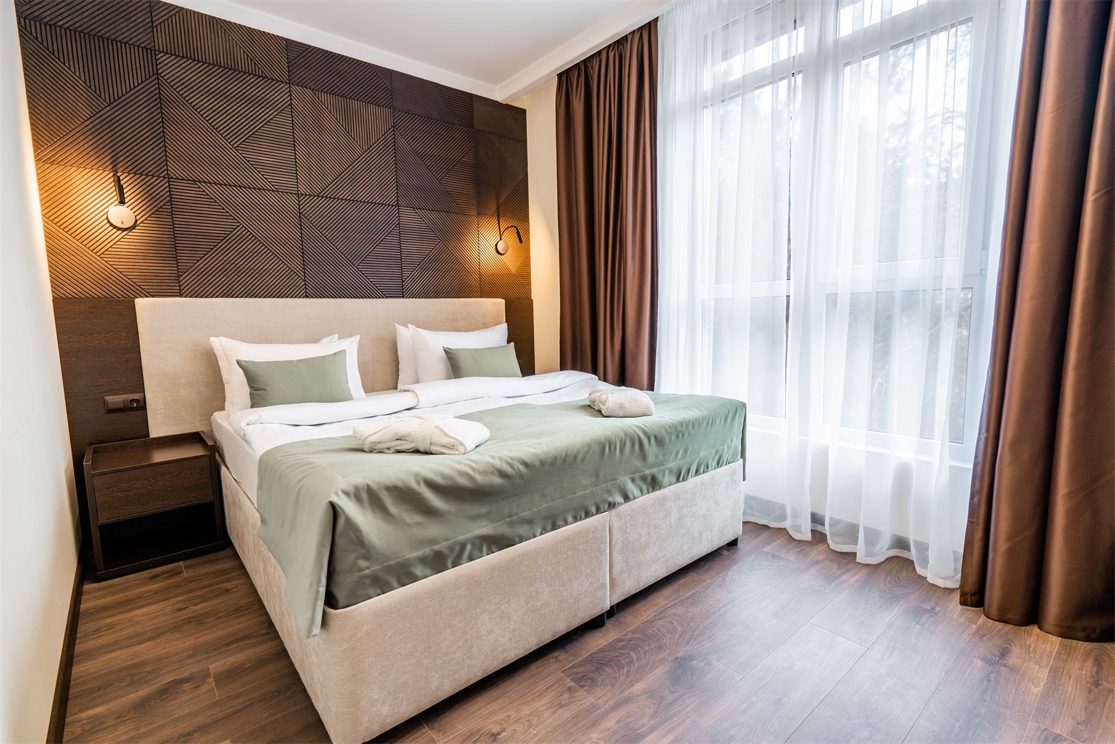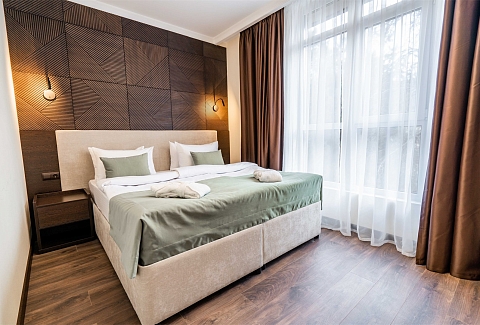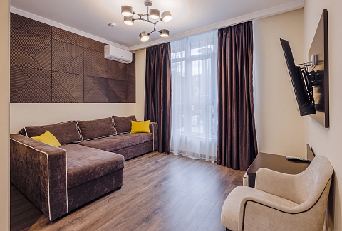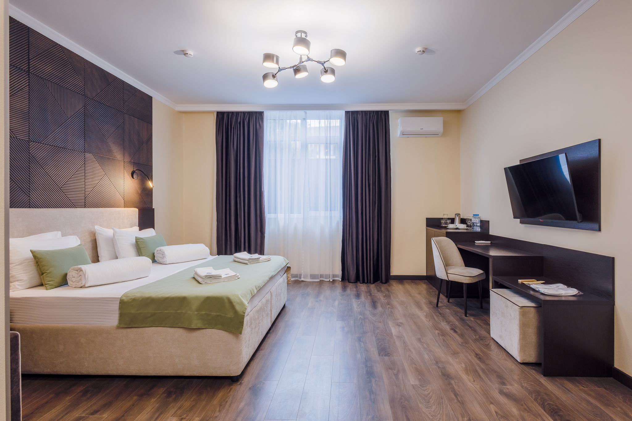 В номере: вешалка, диван раскладной, зеркало, кровать двуспальная, прикроватные тумбочки, стол, столик журнальный, стулья, шкаф, мини-холодильник, сейф, сплит-система, телевизор ЖК, телефон, чайный набор посуды, электрочайник