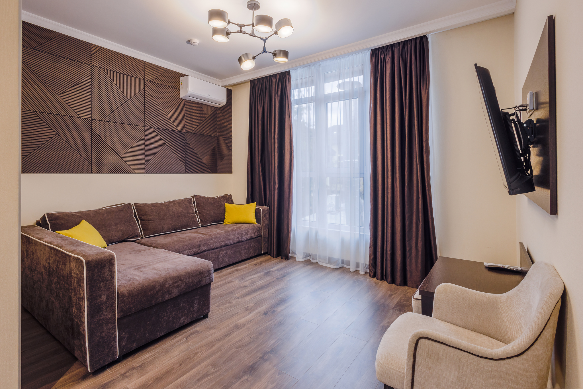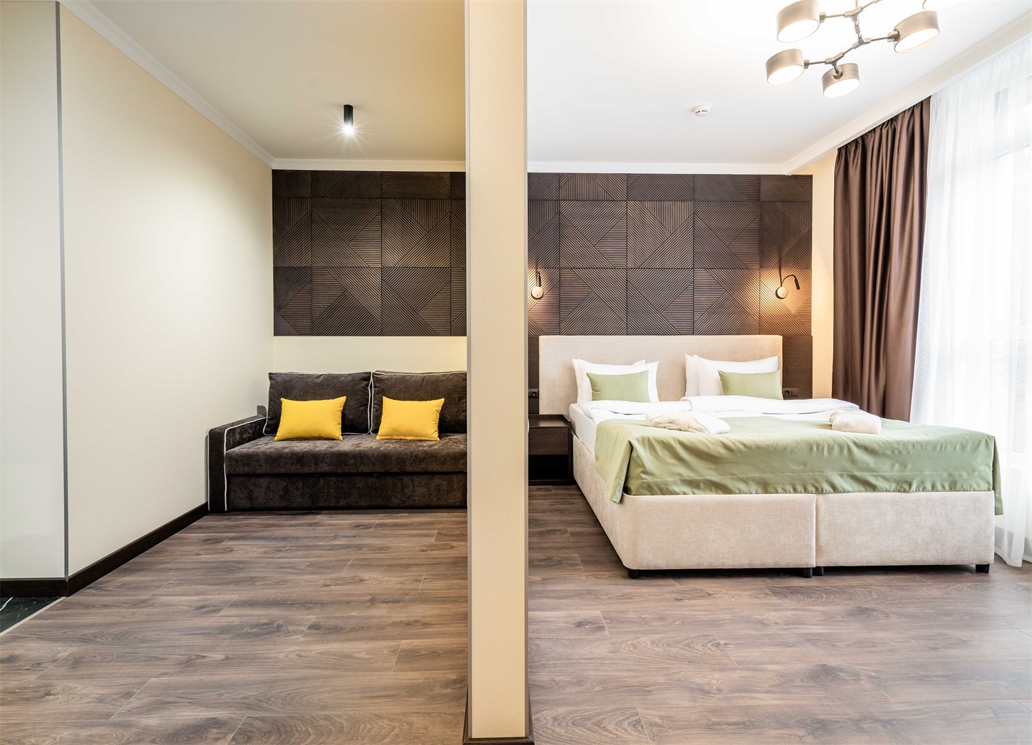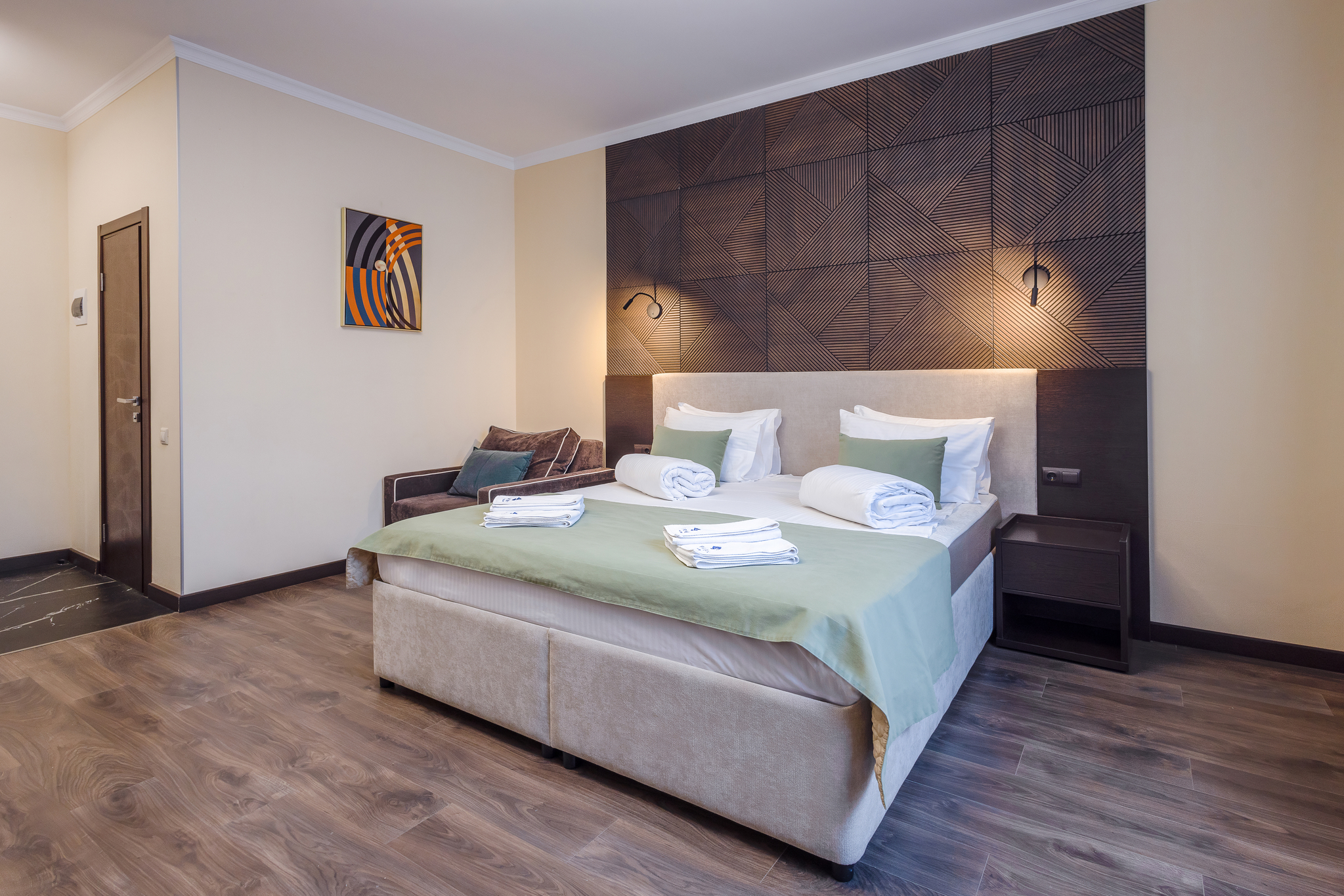 В номере: вешалка, диван раскладной, зеркало, кровать двуспальная, прикроватные тумбочки, стол, столик журнальный, стулья, шкаф, мини-холодильник, сейф, сплит-система, телевизор ЖК, телефон, чайный набор посуды, электрочайник