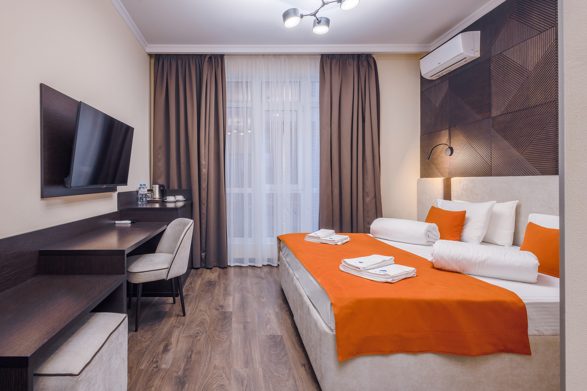 В номере: вешалка, зеркало, кровати односпальные, прикроватные тумбочки, стол, стулья, шкаф, мини-холодильник, сейф, сплит-система, телевизор ЖК, телефон, чайный набор посуды, электрочайник