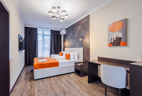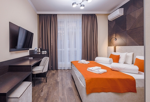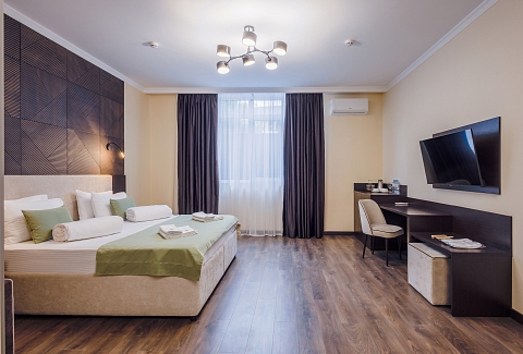 В номере: вешалка, зеркало, кресло-кровать, кровать двуспальная, прикроватные тумбочки, стол, стулья, шкаф, мини-холодильник, сейф, сплит-система, телевизор ЖК, телефон, чайный набор посуды, электрочайник