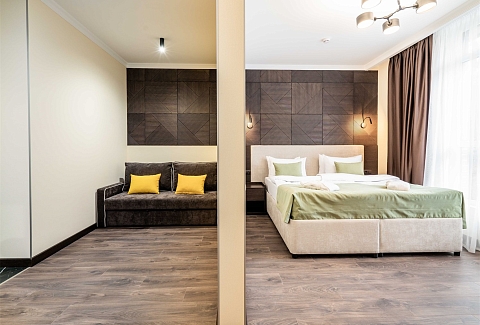 В номере: вешалка, диван раскладной, зеркало, кровать двуспальная, прикроватные тумбочки, раскладушка, стол, стулья, шкаф, мини-холодильник, сейф, сплит-система, телевизор ЖК, телефон, чайный набор посуды, электрочайник