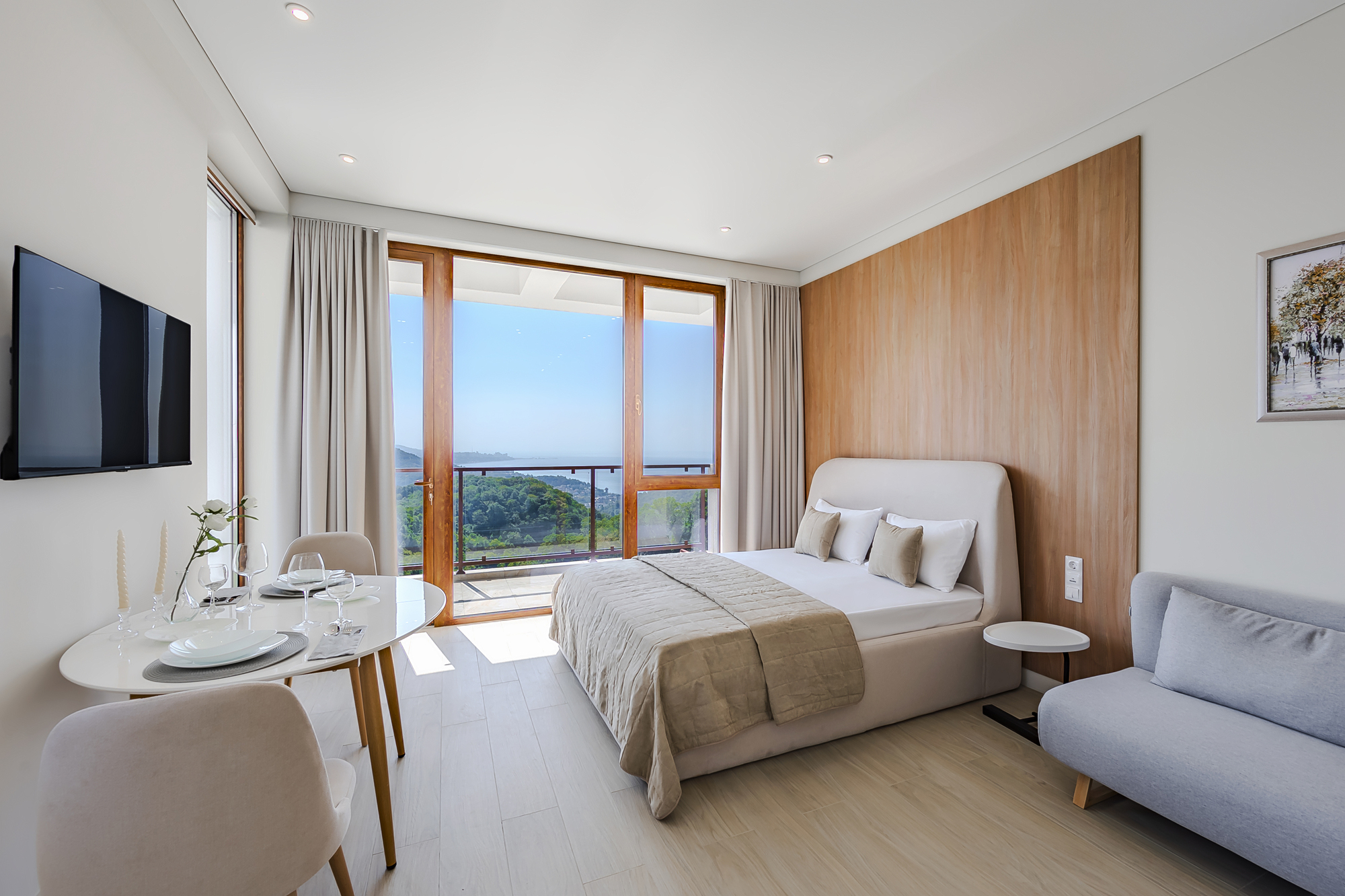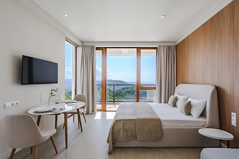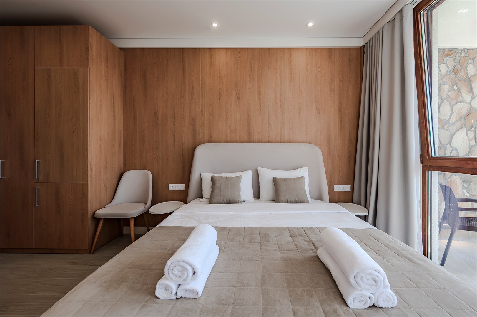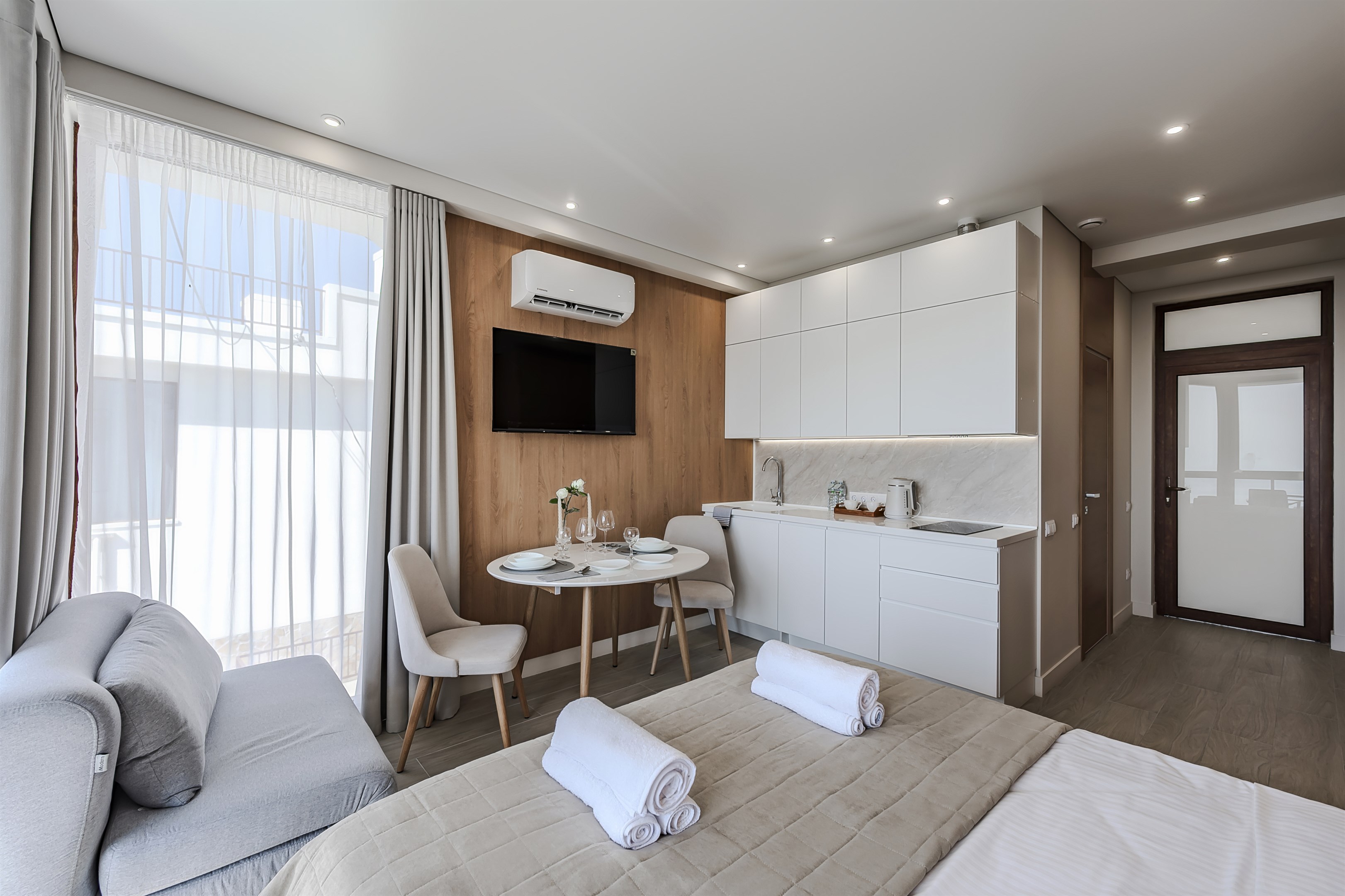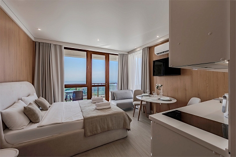 В номере: диван раскладной, зеркало, кровать двуспальная, прикроватные столики, стол обеденный, стулья, шкаф, гладильная доска, кондиционер, набор посуды, плита электрическая, пляжные полотенца, стиральная машина, телевизор ЖК, утюг, холодильник, чайная станция